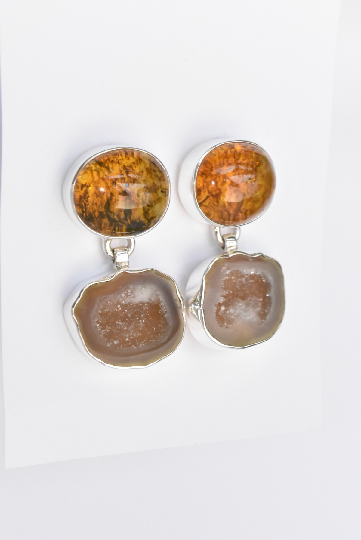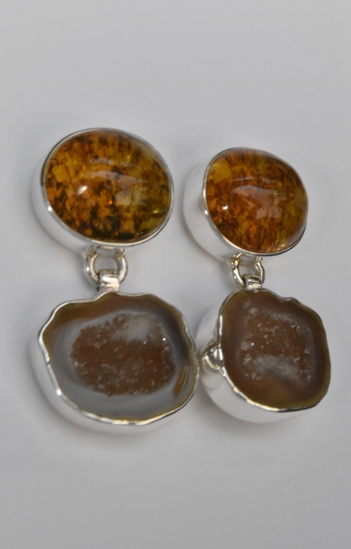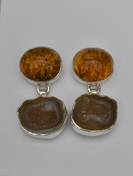 Hermosos aretes de forma doble circular, por arriba encontramos ámbar amarillo jaspeado, por abajo encontramos piedra geoda cuyo efecto es reflejante debido al momento de cortar la piedra genera este brillo distinguido. Todo en plata .925. Código 4426. --Checar disponibilidad--
