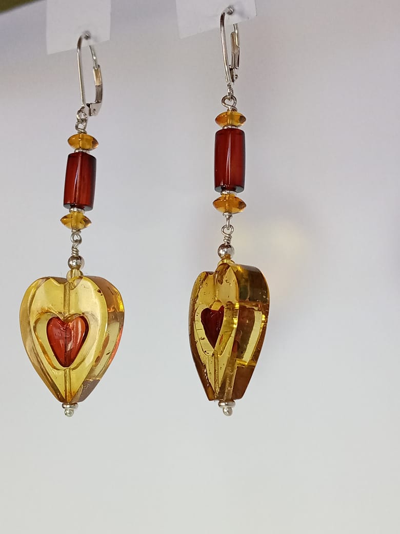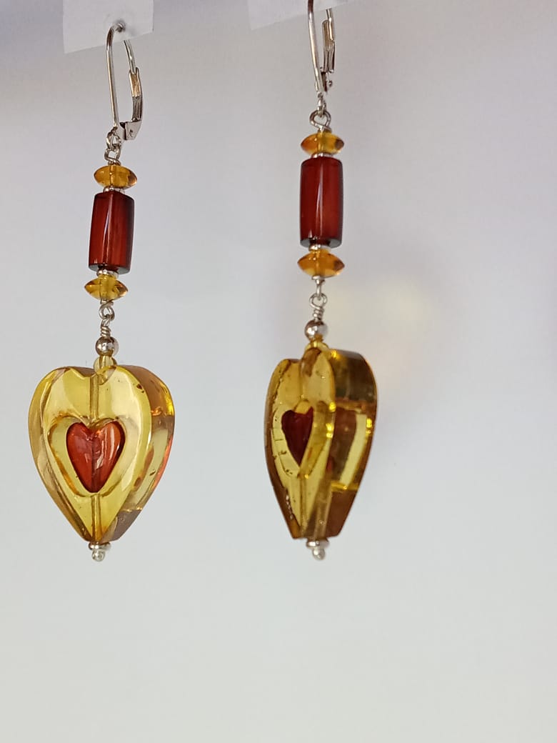 Distinguidos aretes en forma de corazón para regalar en un aniversario o simplemente un detalle para la dama distinguida, estos aretes tienen una combinación entre ámbar rojo y amarillo, tienen forma de plativolos, formas cilíndricas y un corazón; ganchos cerrados de plata .925. Código 4255.