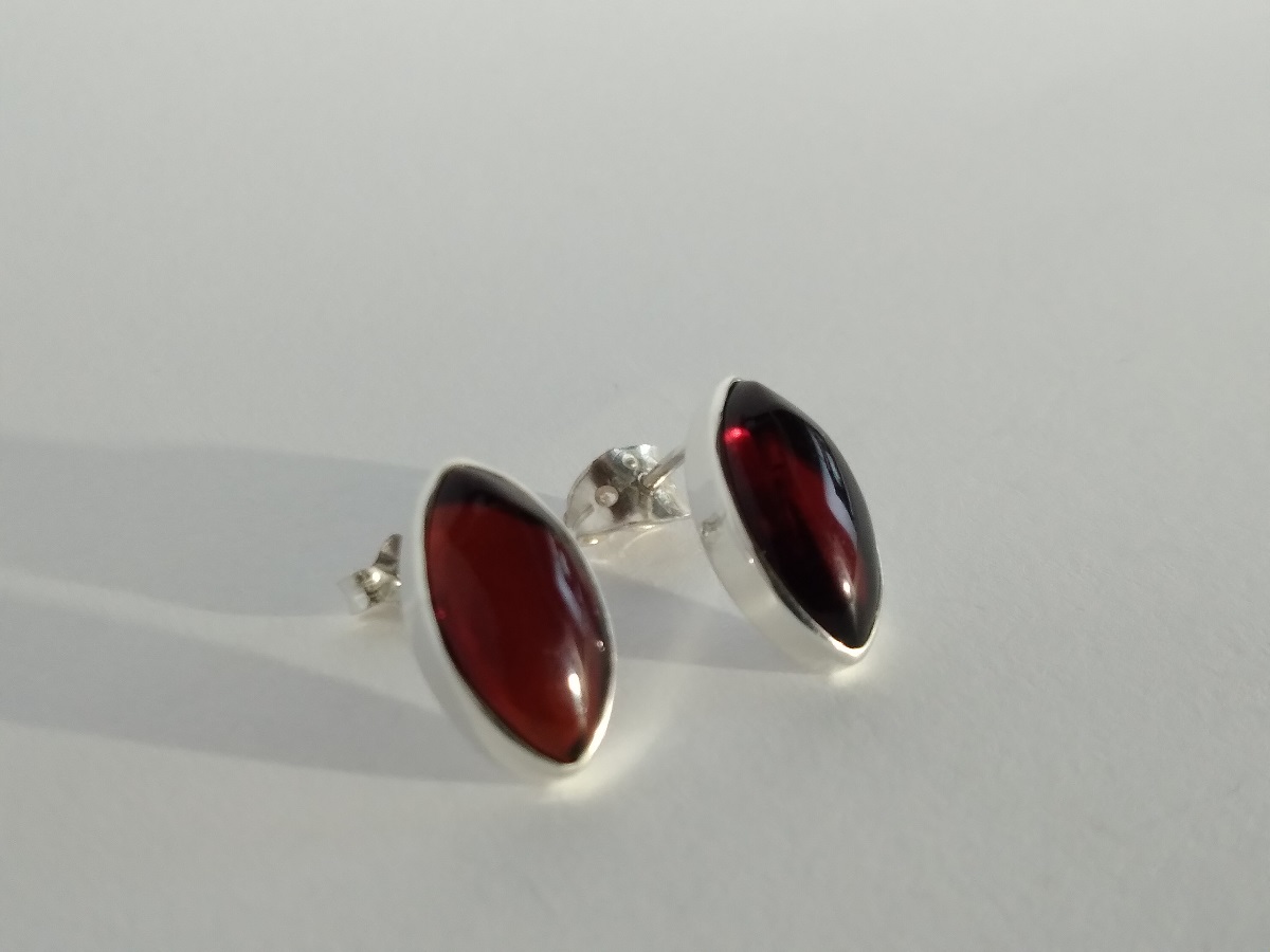 Aretes biselados de ámbar rojo cereza en forma de ojos con postes de plata .925. Código 2238.
