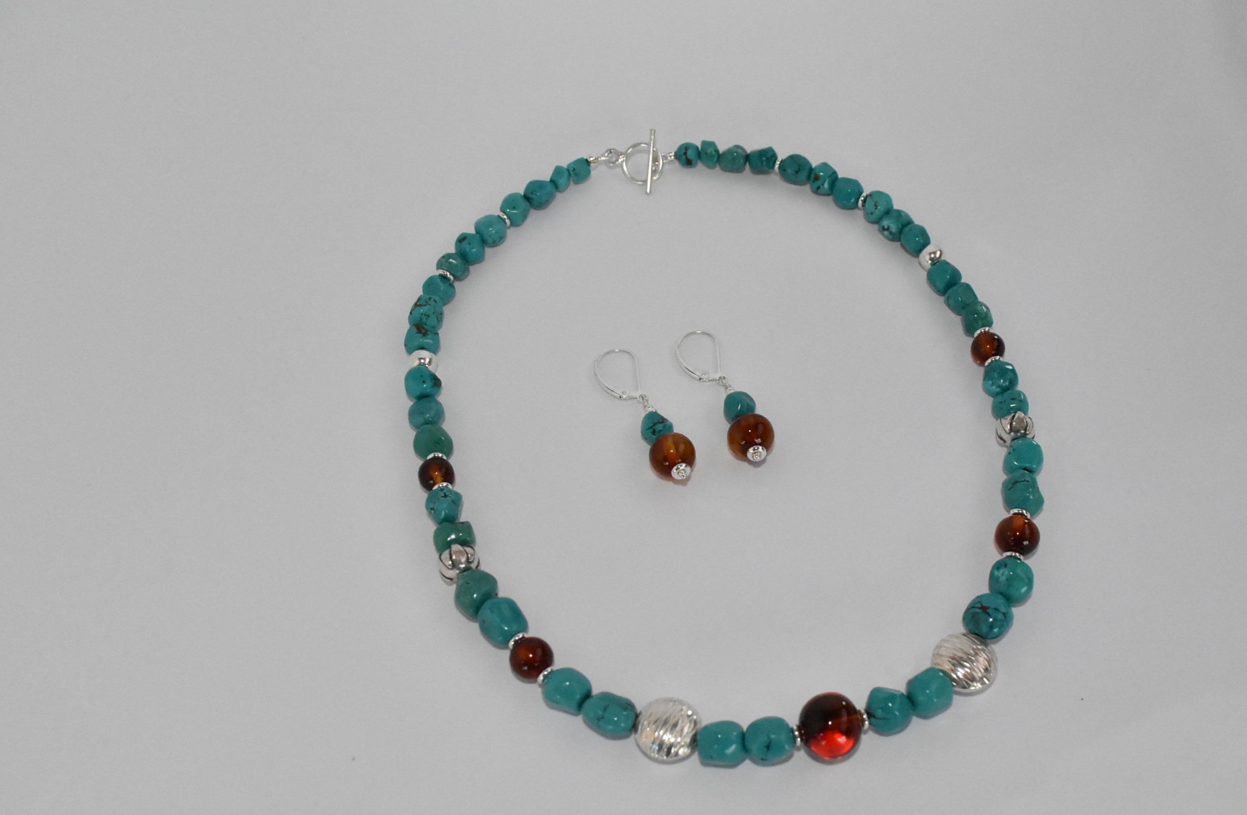 Medida: Collar largo 43.5 cm, grosor plata .6 cm, turquesa .7 cm , ámbar .9 cm; aretes largo 2.6 cm, grosor 1