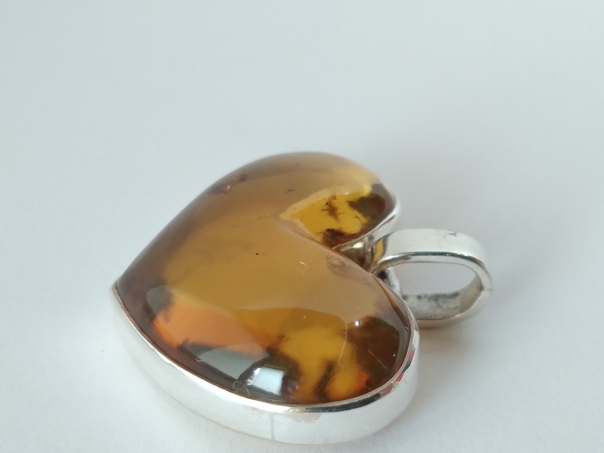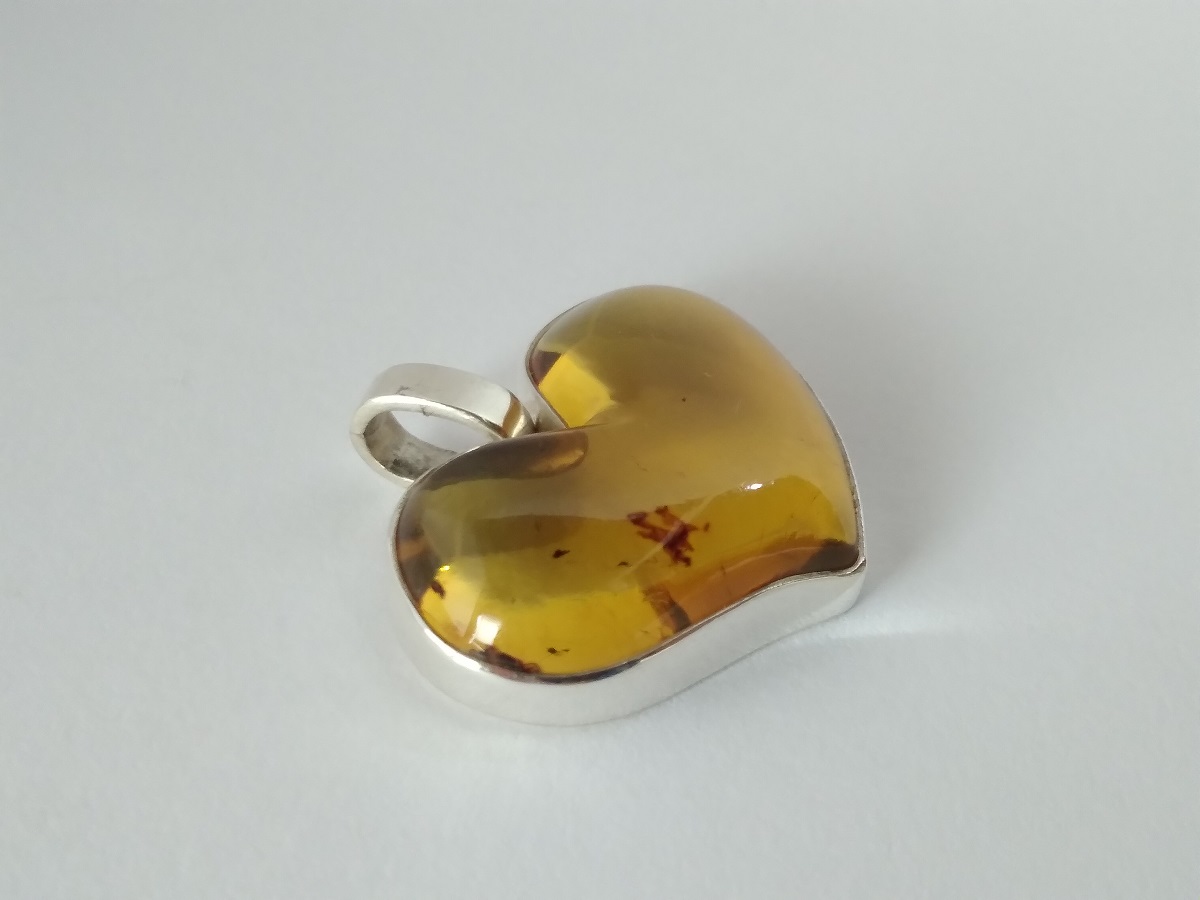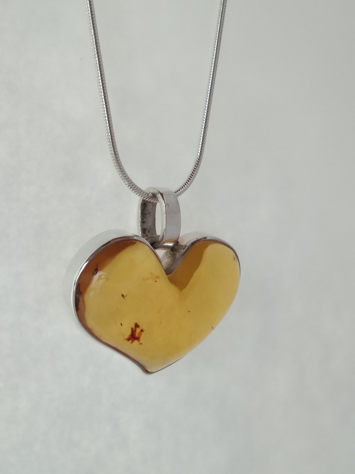 Dije de ámbar amarillo en forma de corazón biselado y pequeñas manchas de musgo al interior de éste. El biselado es de plata e incluye pasacadena también de plata .925. Código