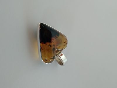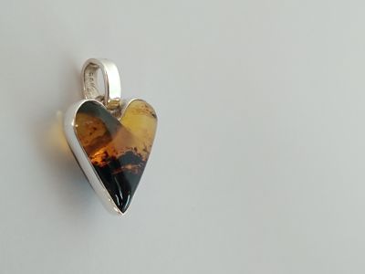Dije biselado de ámbar amarillo musgoso en forma de corazón con pasacadena de plata .925. Código 1638.