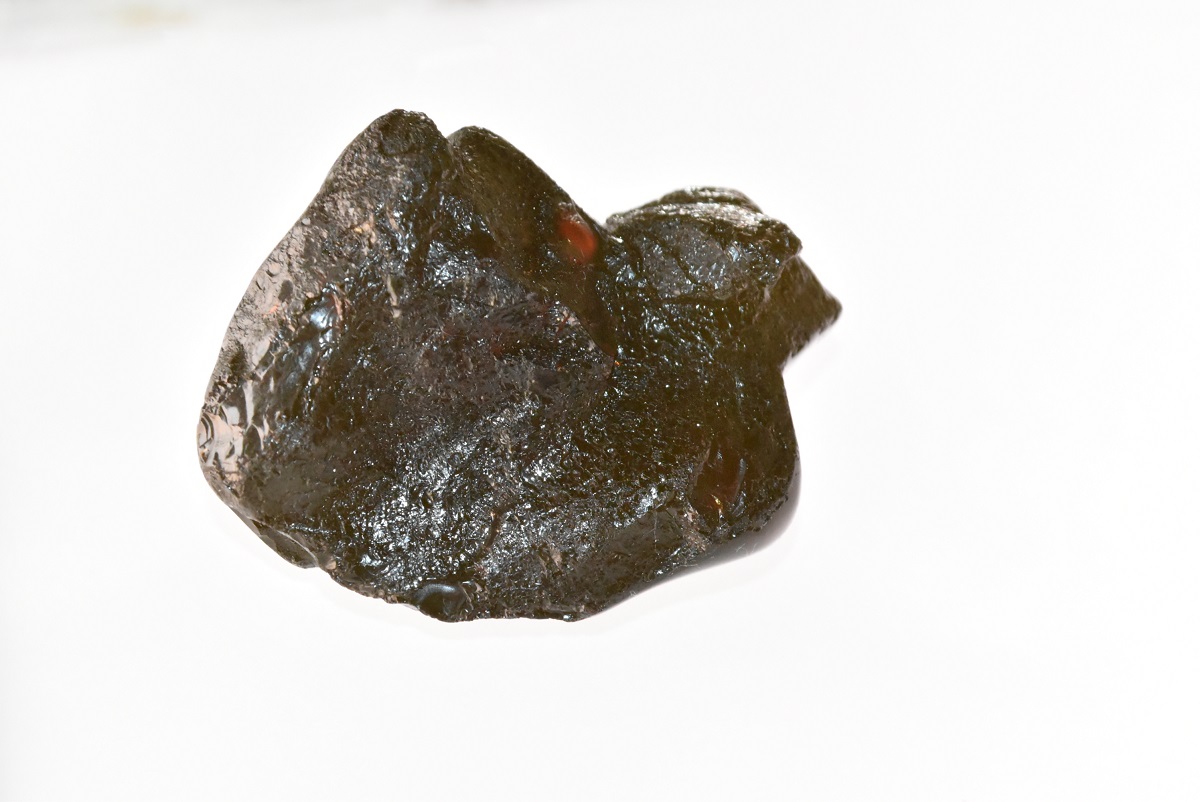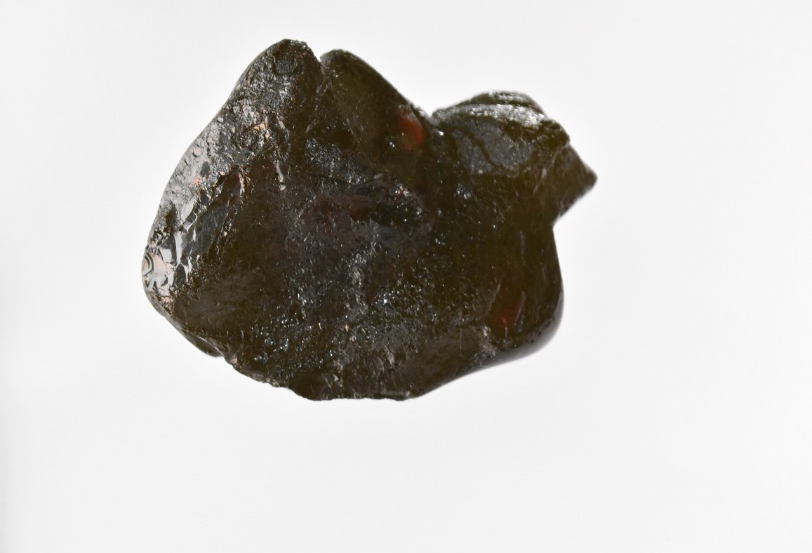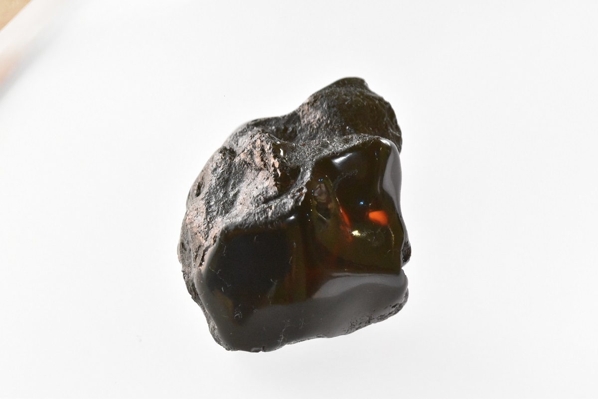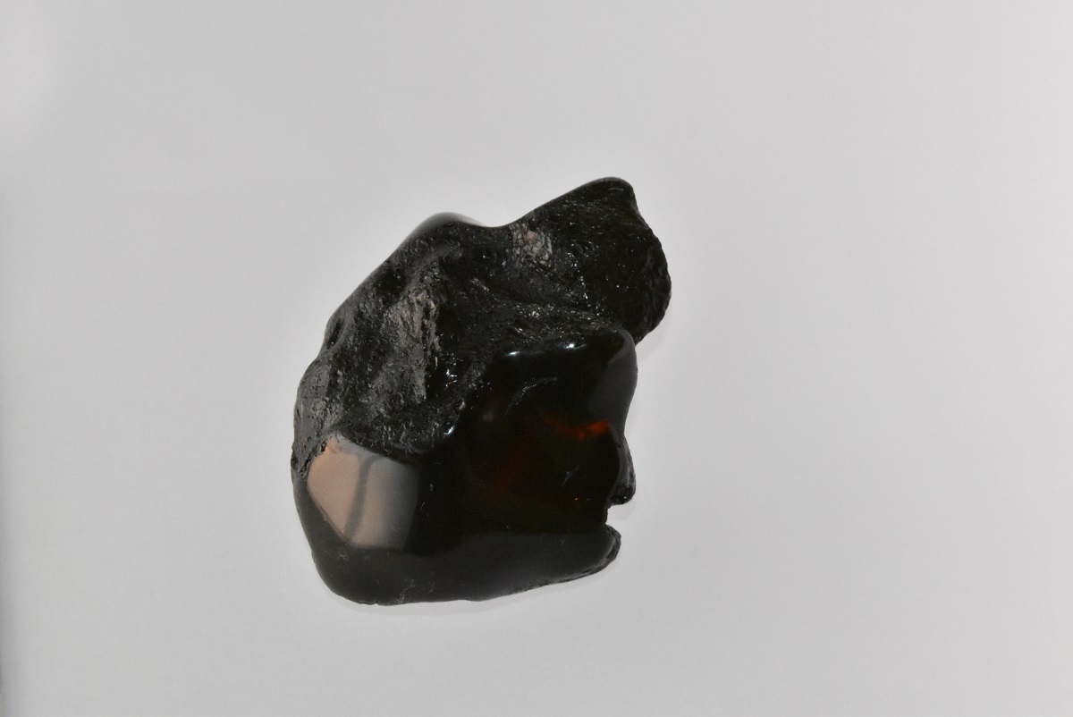 Pieza de ámbar rojo semi pulido, parte de la pieza se encuentra finamente pulida mientras el resto es ámbar en bruto dejando ver así ambos contextos entre el material recién extraído de la naturaleza y el trabajo humano impreso en el. Código 2759.
