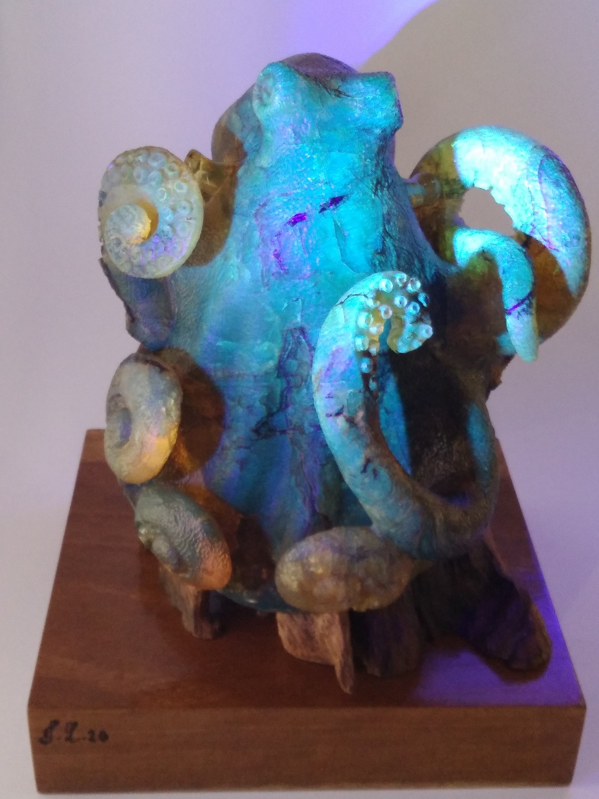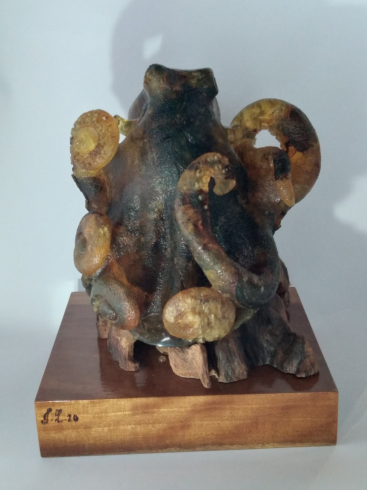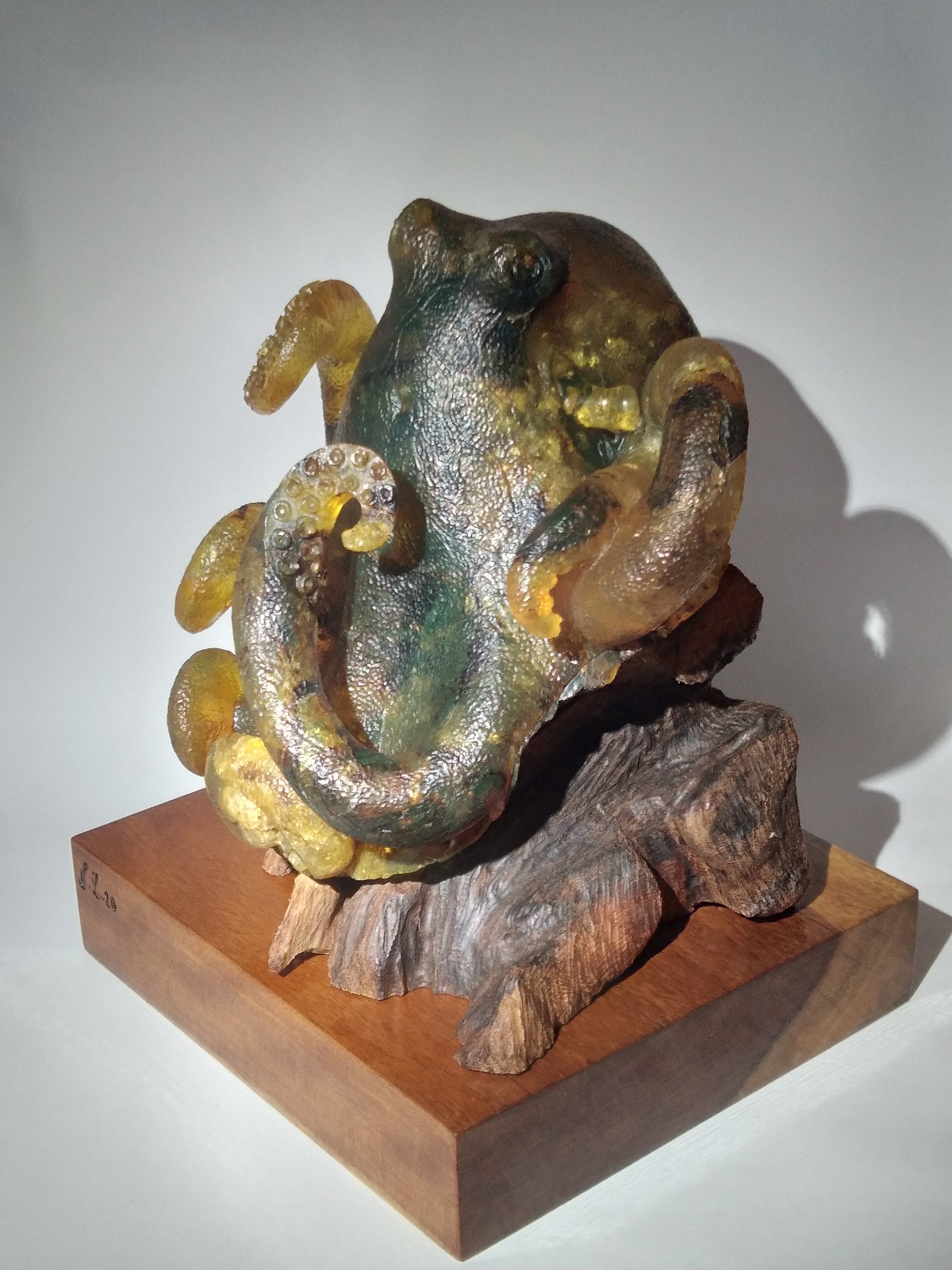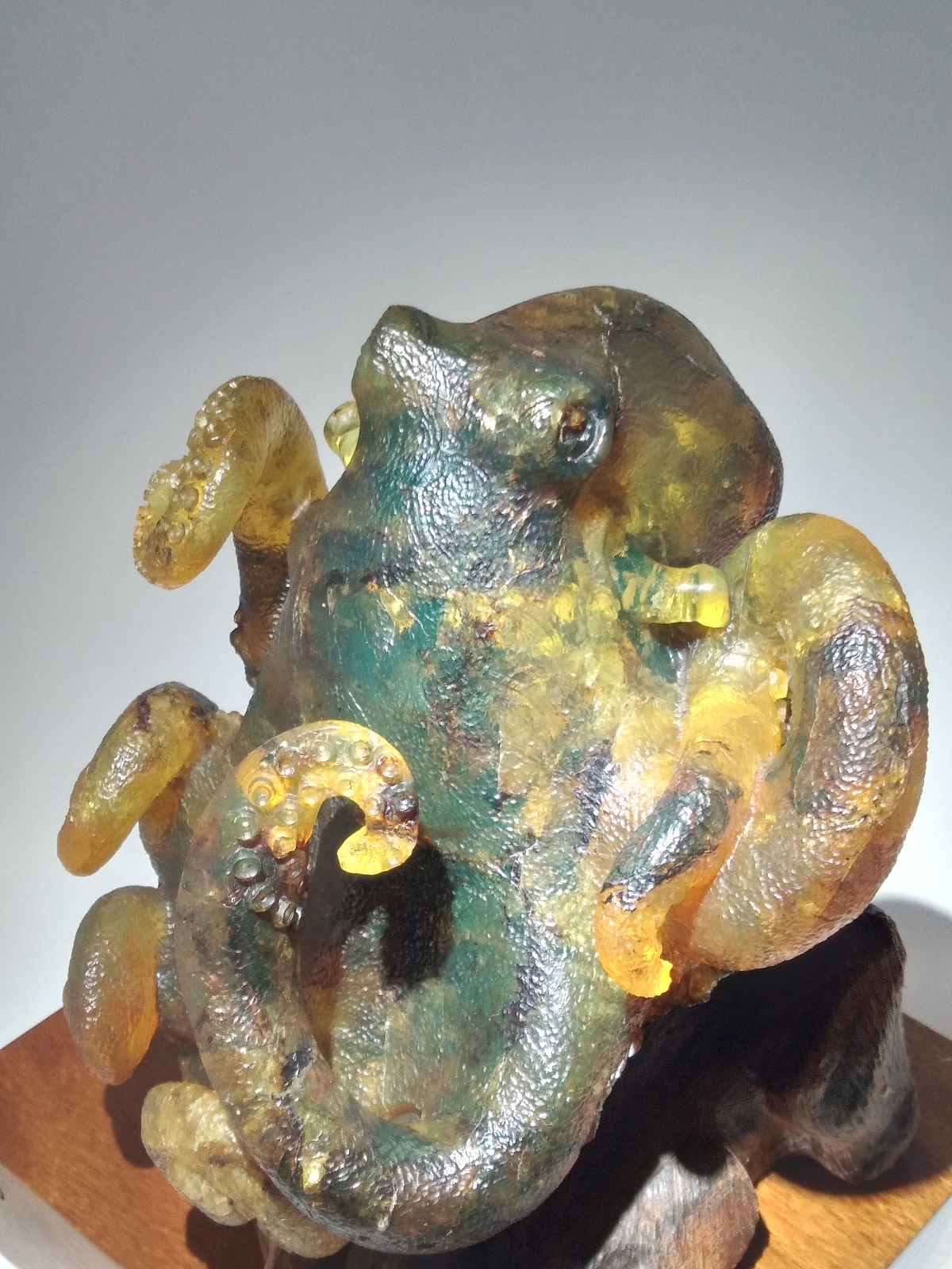 Escultura de ámbar amarillo musgos en forma de pulpo sobre dos bases de madera rustica y barnizadas. Código 4377. SI ESTAS INTERESADO EN ALGUNA ESCULTURA EN ESPECIAL PODEMOS HACERLA.