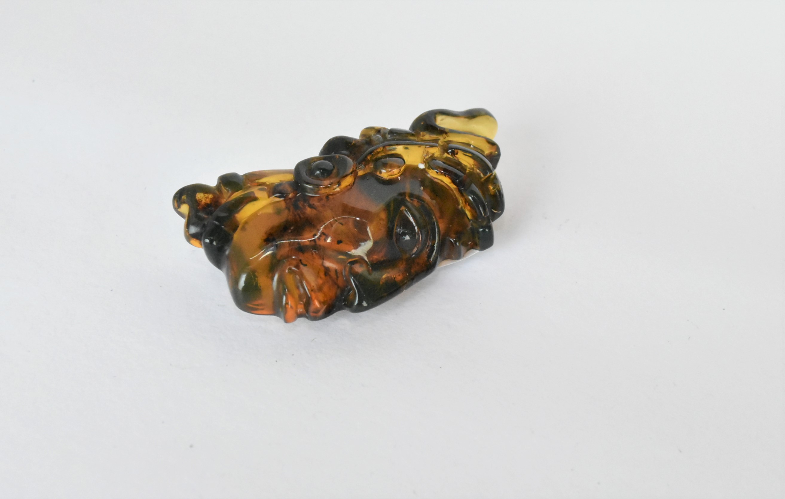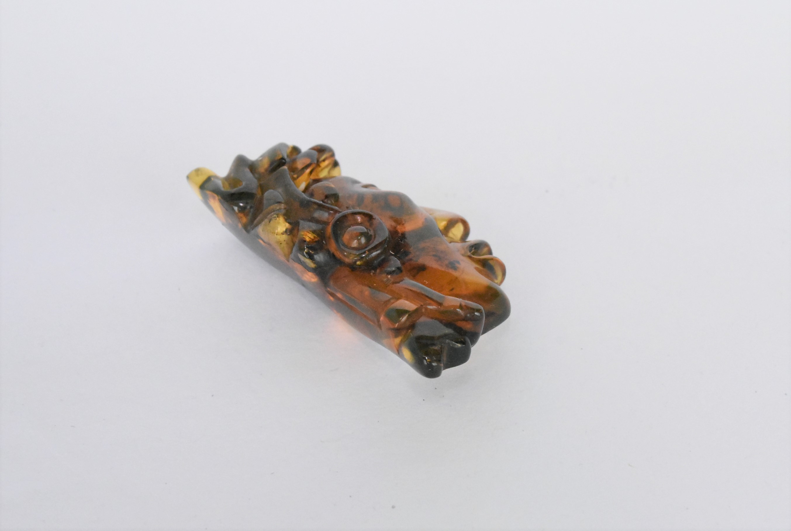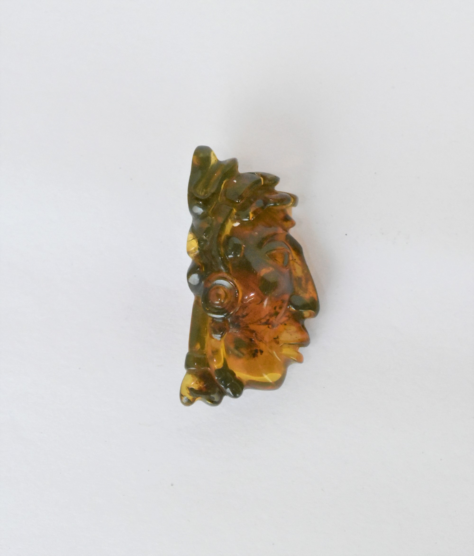 Escultura de ambar amarillo jaspeado en la cual se tallo el relieve y perfil de un maya. Código: 4746