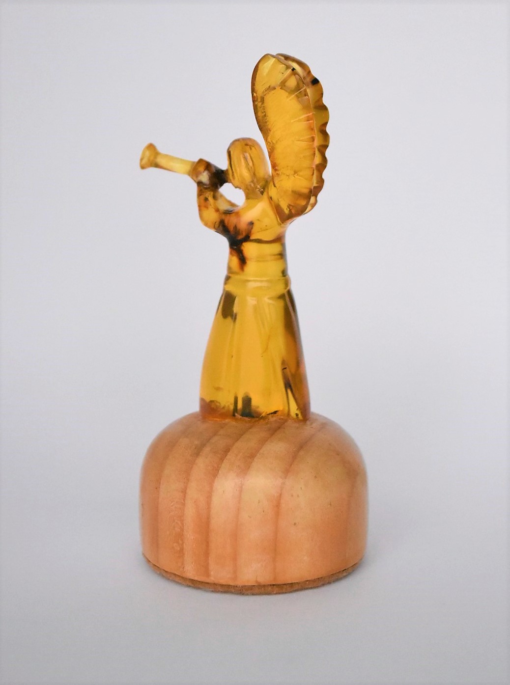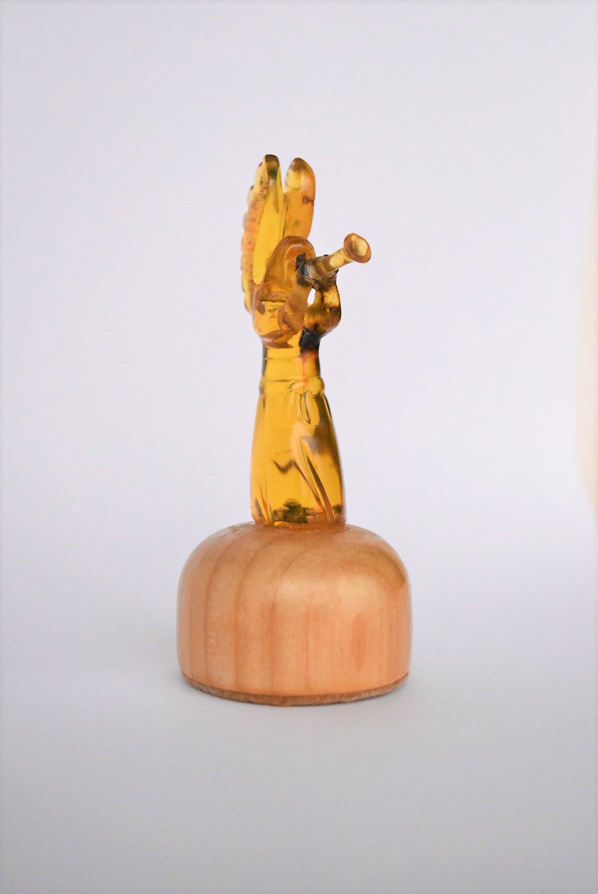Escultura en forma de ángel tocando una tropita, tallada en ambar amarillo y montado sobre base de madera. Código. 4522