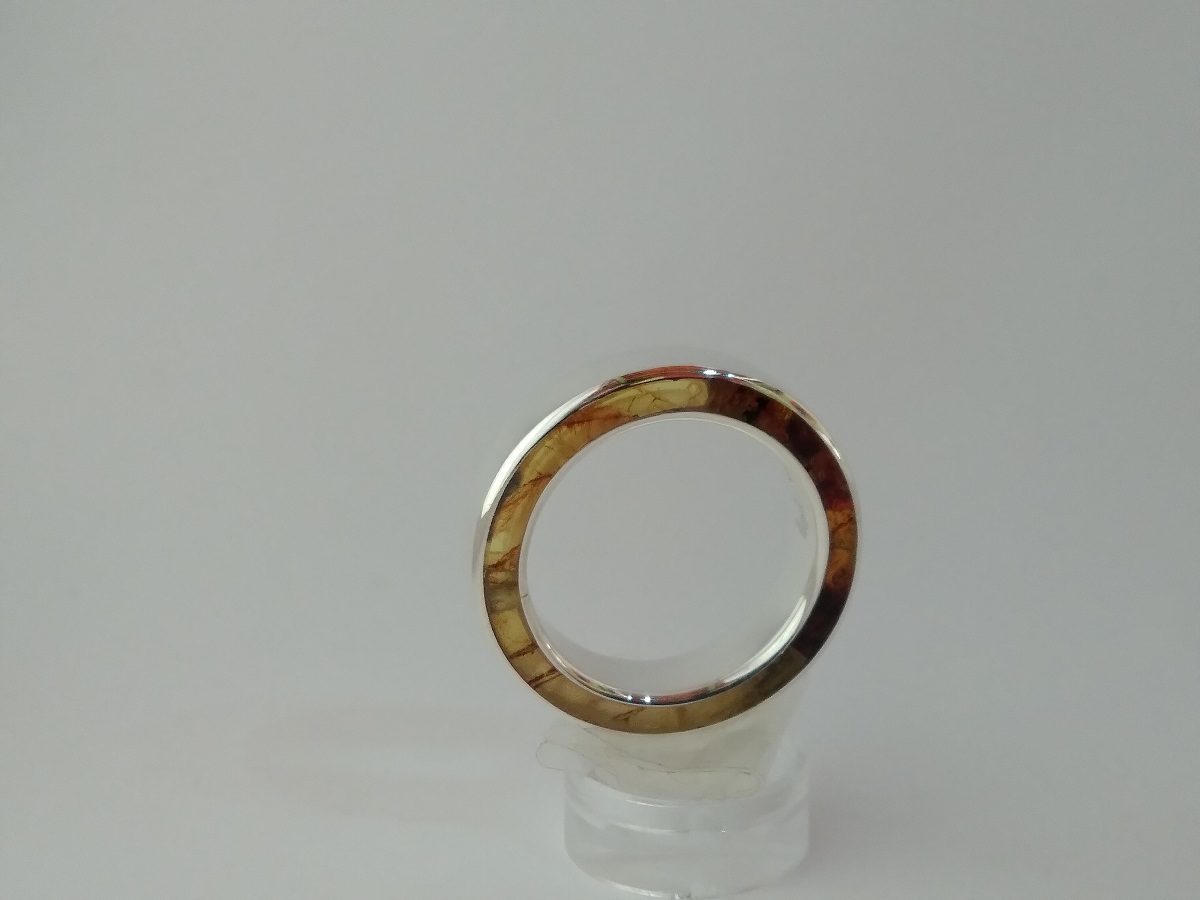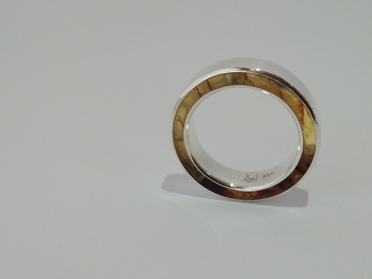 Anillo de plata .925 en frente y ámbar amarillo jaspeado en medio en forma circular. un diseño vanguardista y exclusivo de galería ambaria. Código 4250