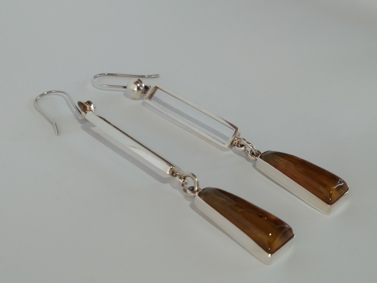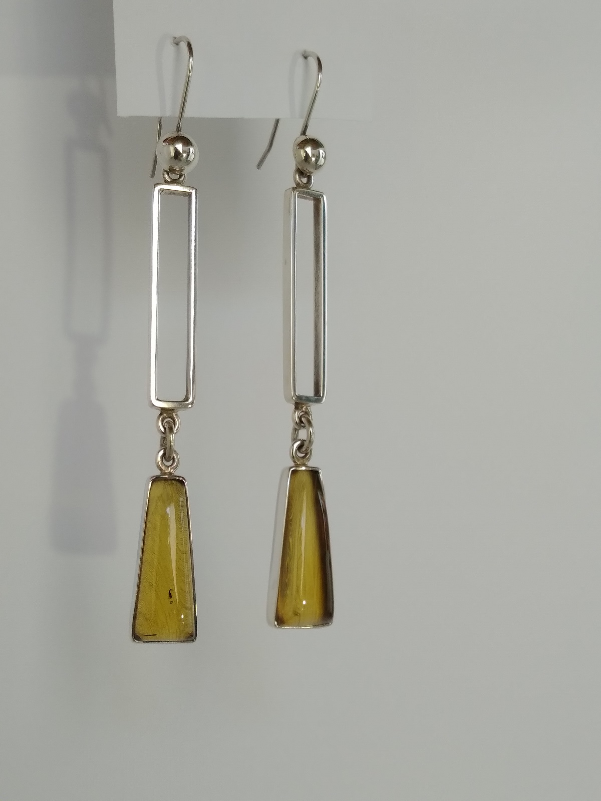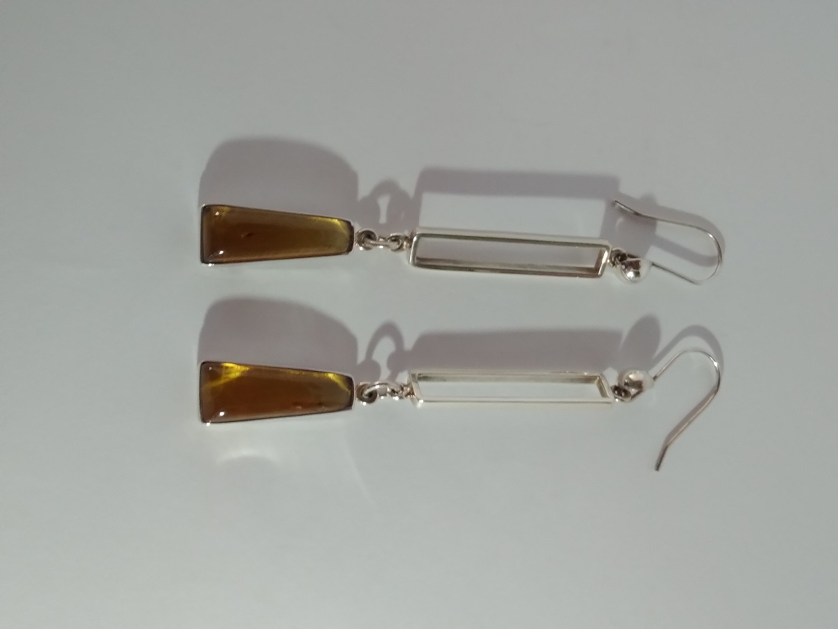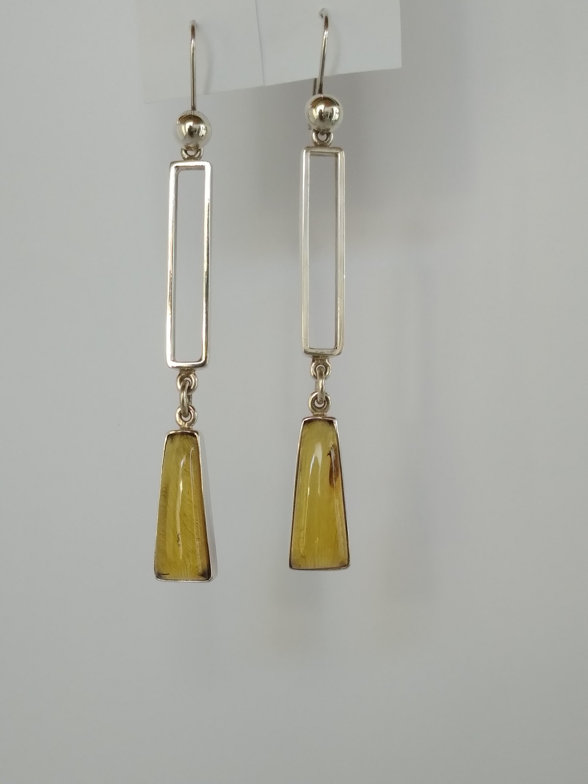 Aretes largos de ámbar amarillo en forma semi rectangular biselado y con gancho de plata .925. Código 4419.