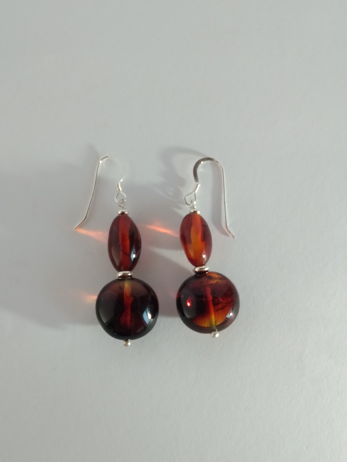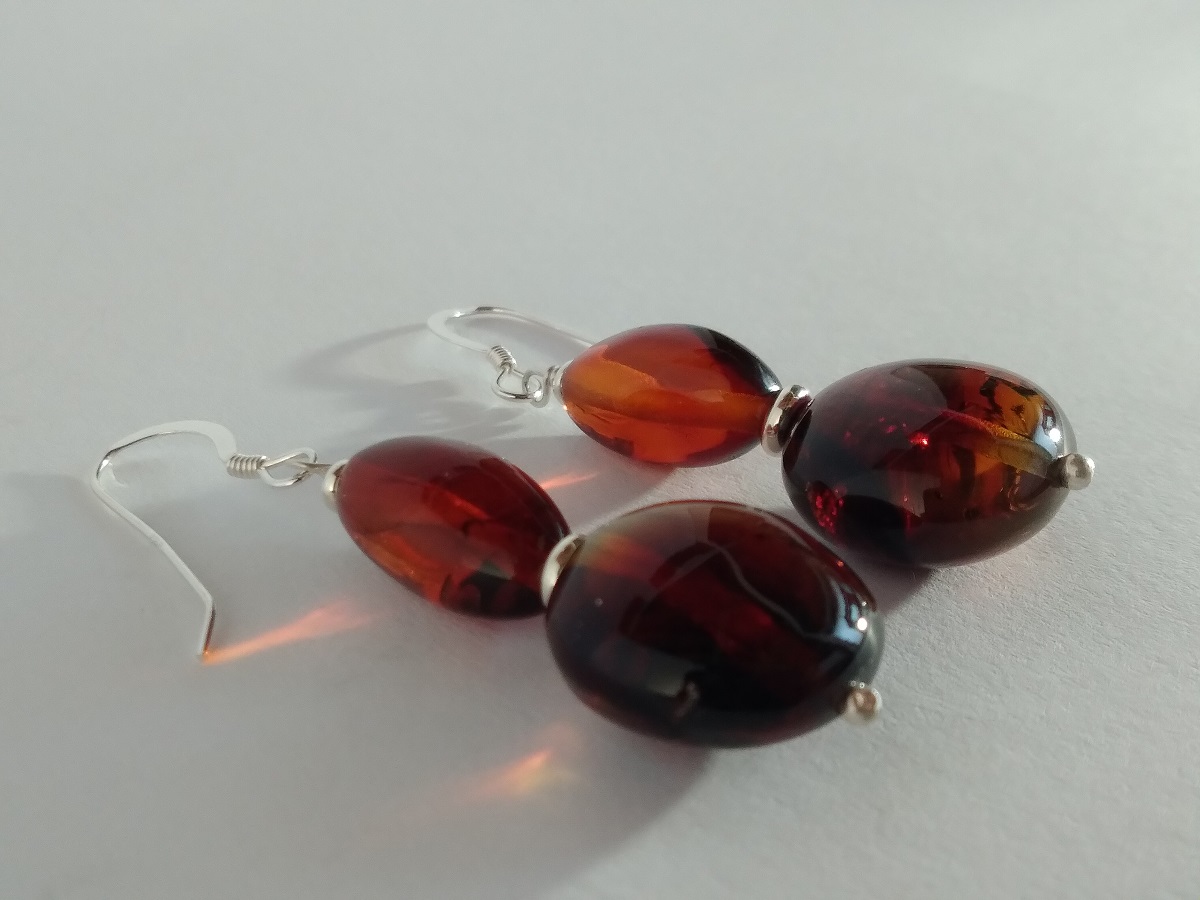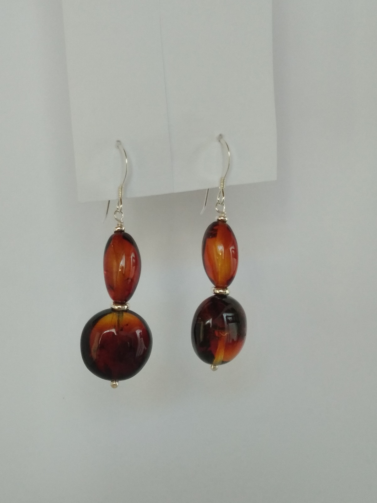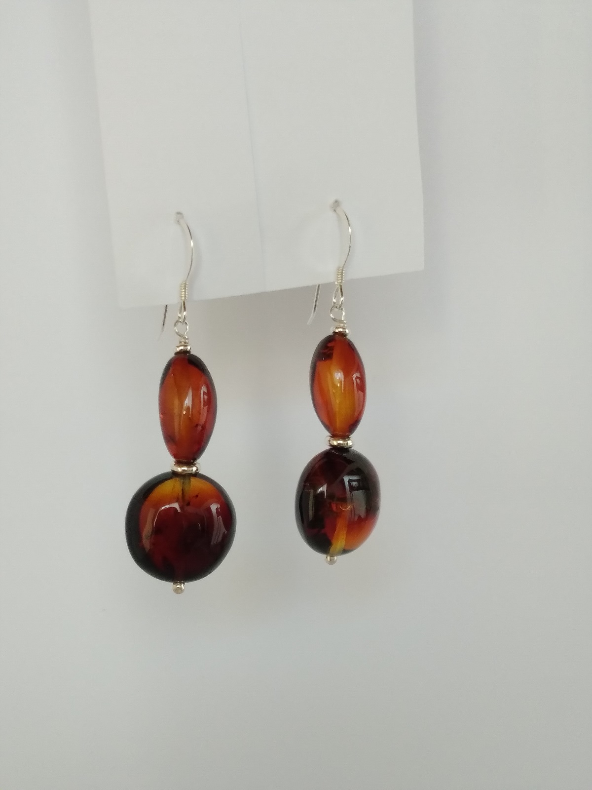 Aretes de ámbar rojo en forma oval y pastilla con gancho de plata .925 y detalles. Código 4385.