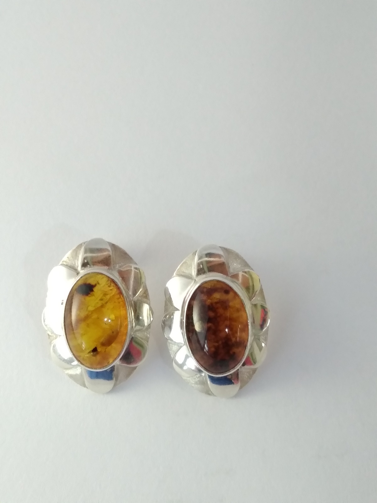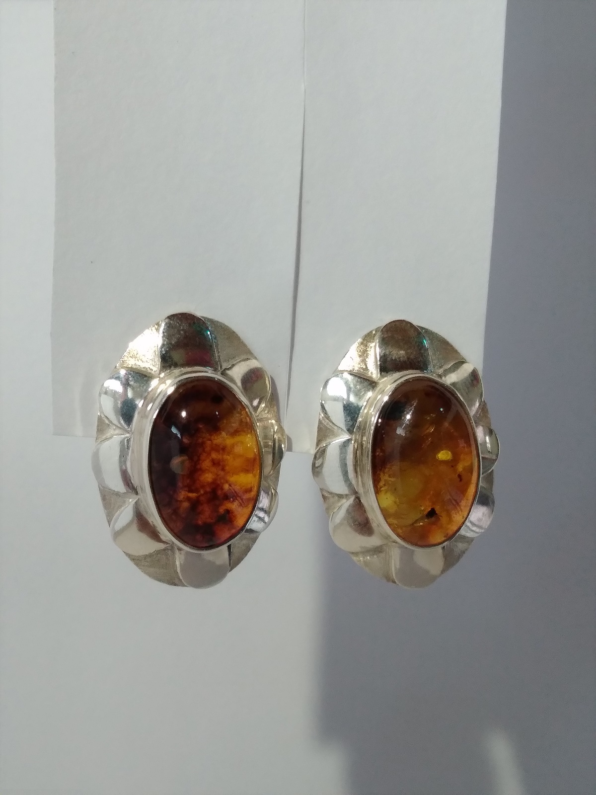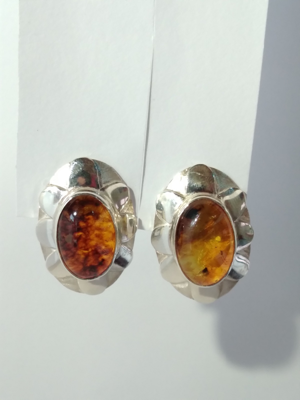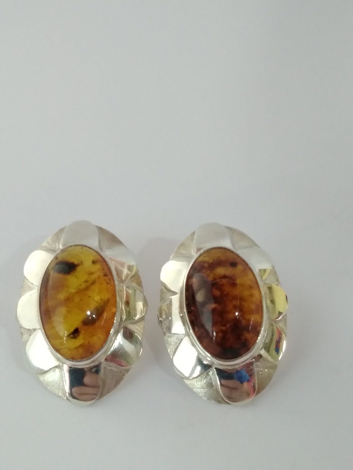 Aretes con lamina de plata .925 texturizada y ámbar amarillo musgoso en forma oval con poste. Código 4381.