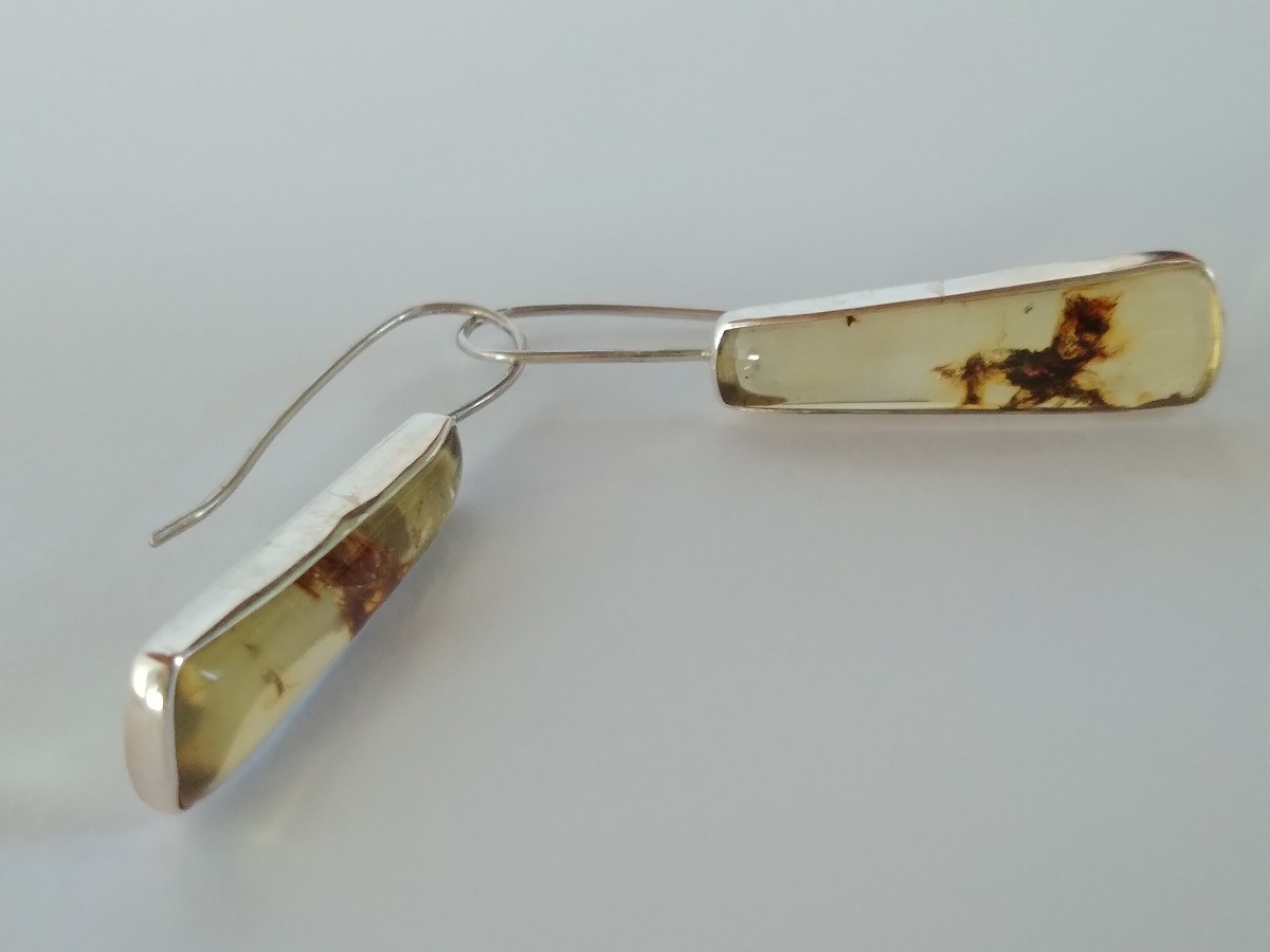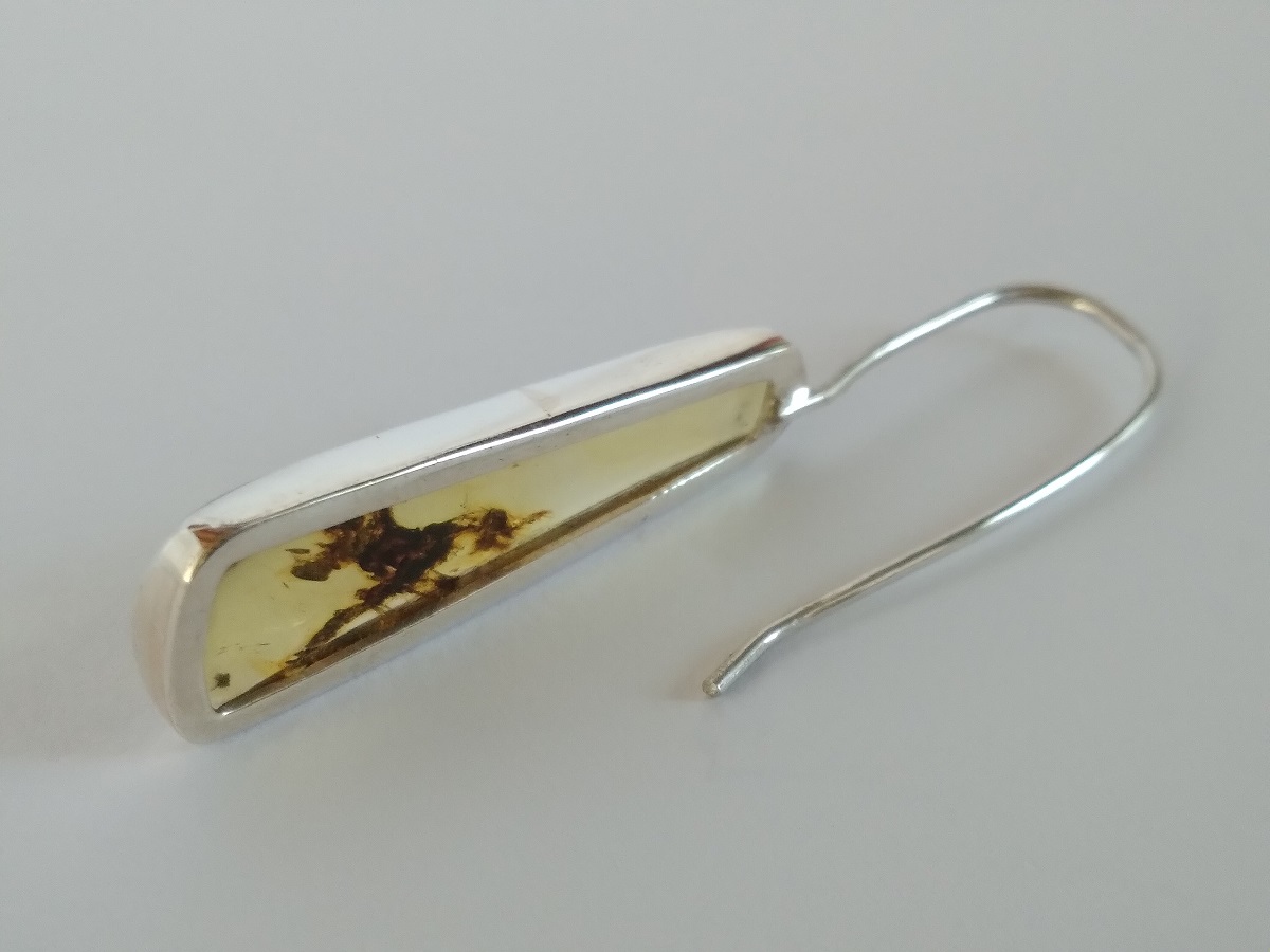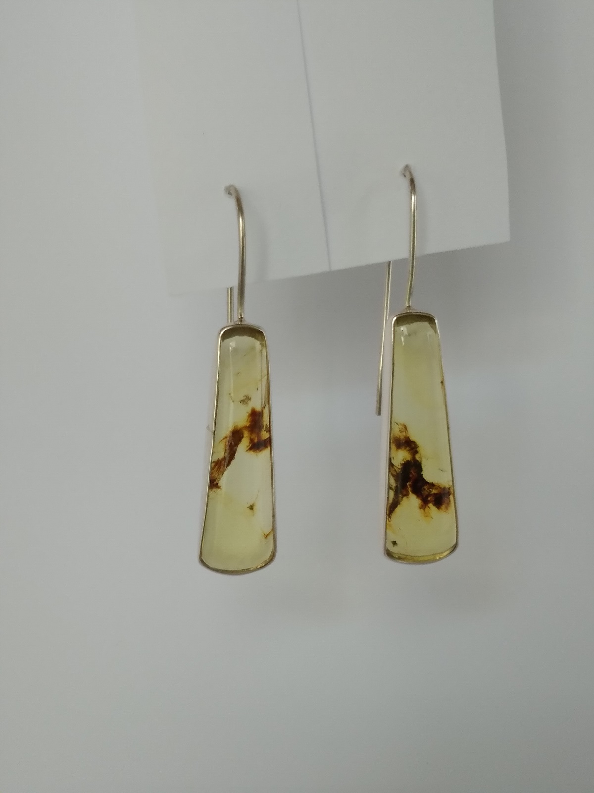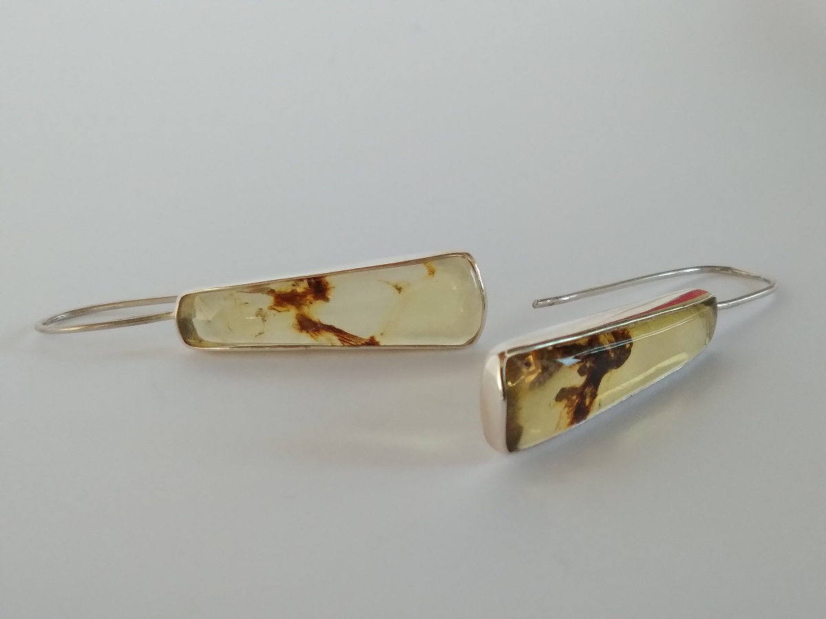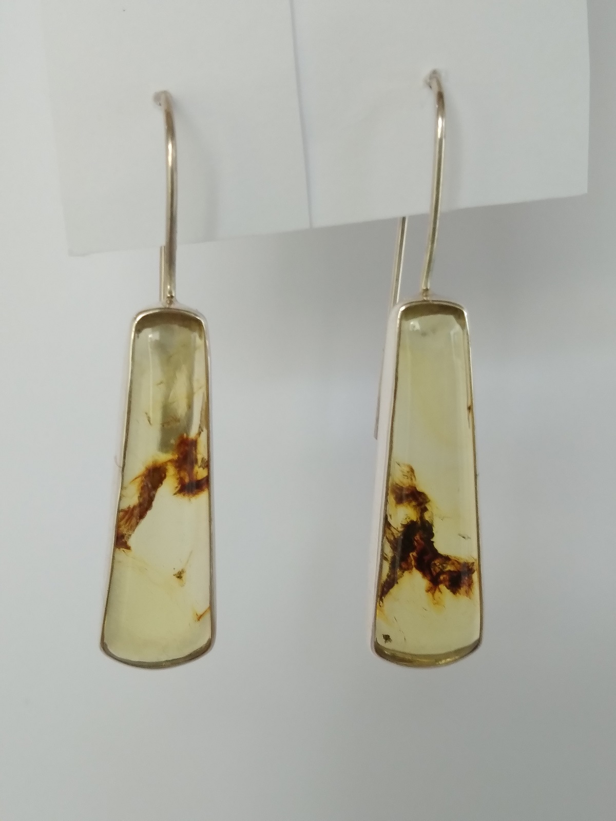 Aretes biselados y gancho con ámbar amarillo musgoso en forma semi rectangular en plata .925. Código 3268.