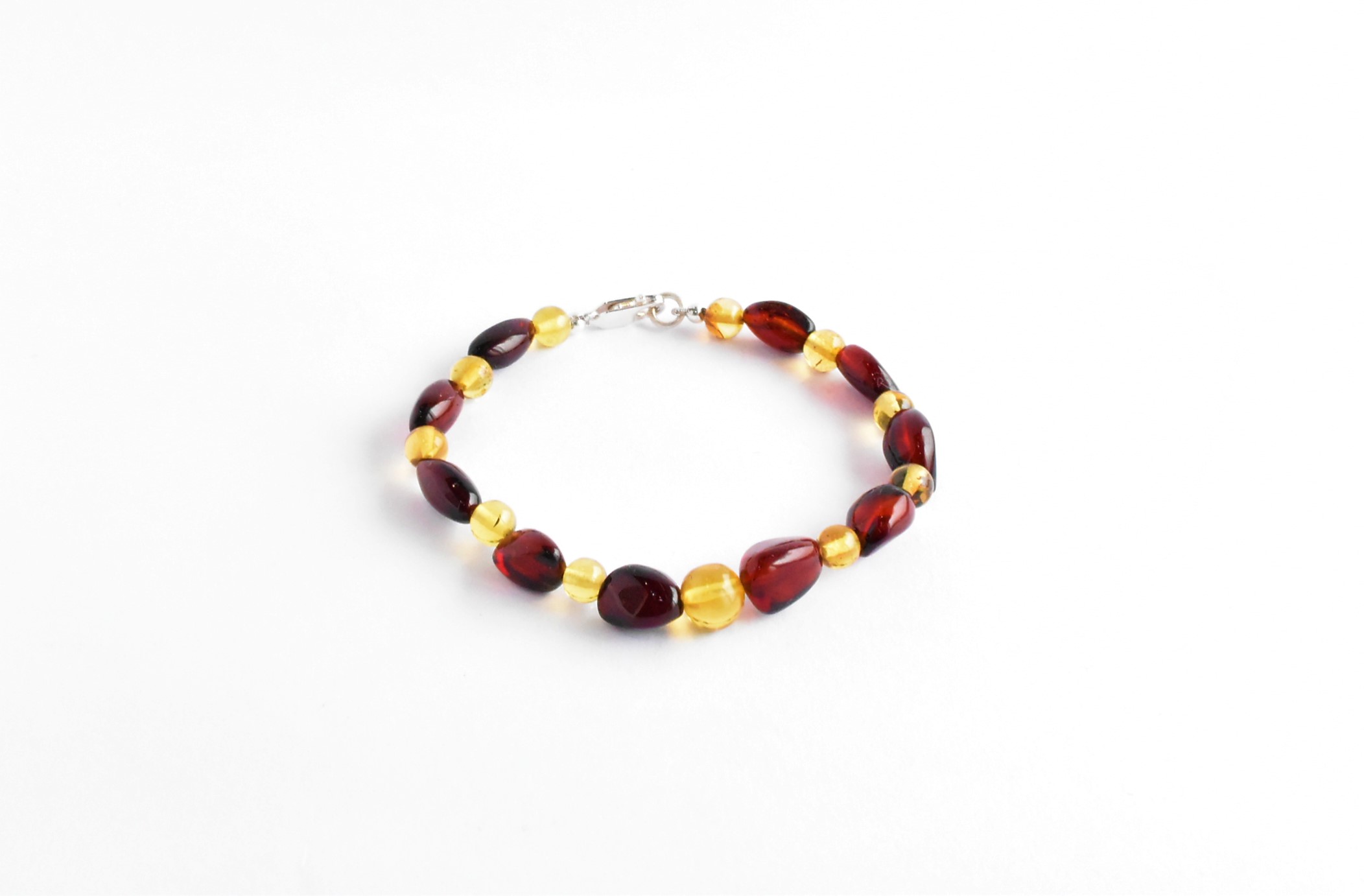 Brazalete con cuentas amorfas de ámbar rojo y esferas de ámbar amarillo, con broche de plata .925 Código: 4027.