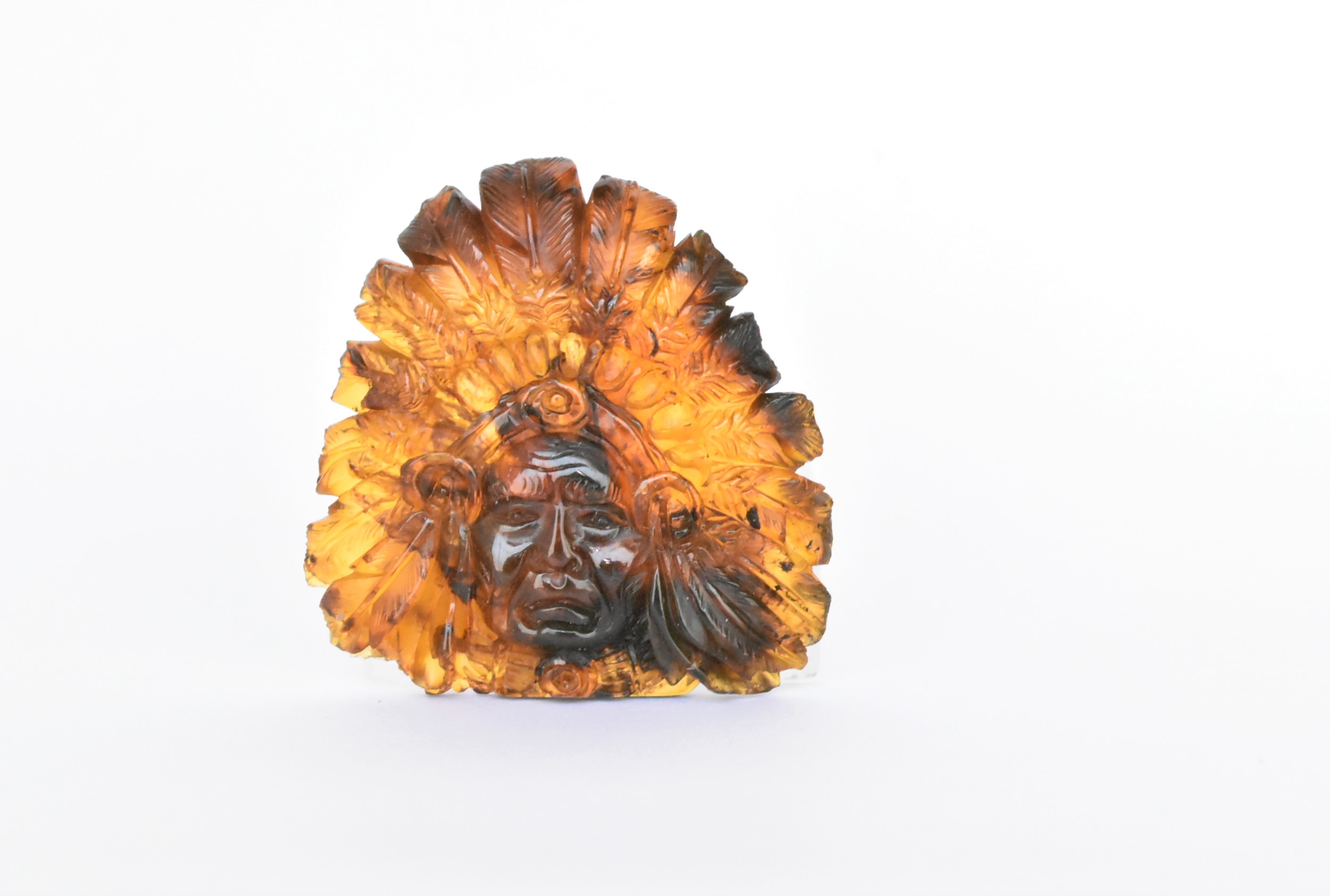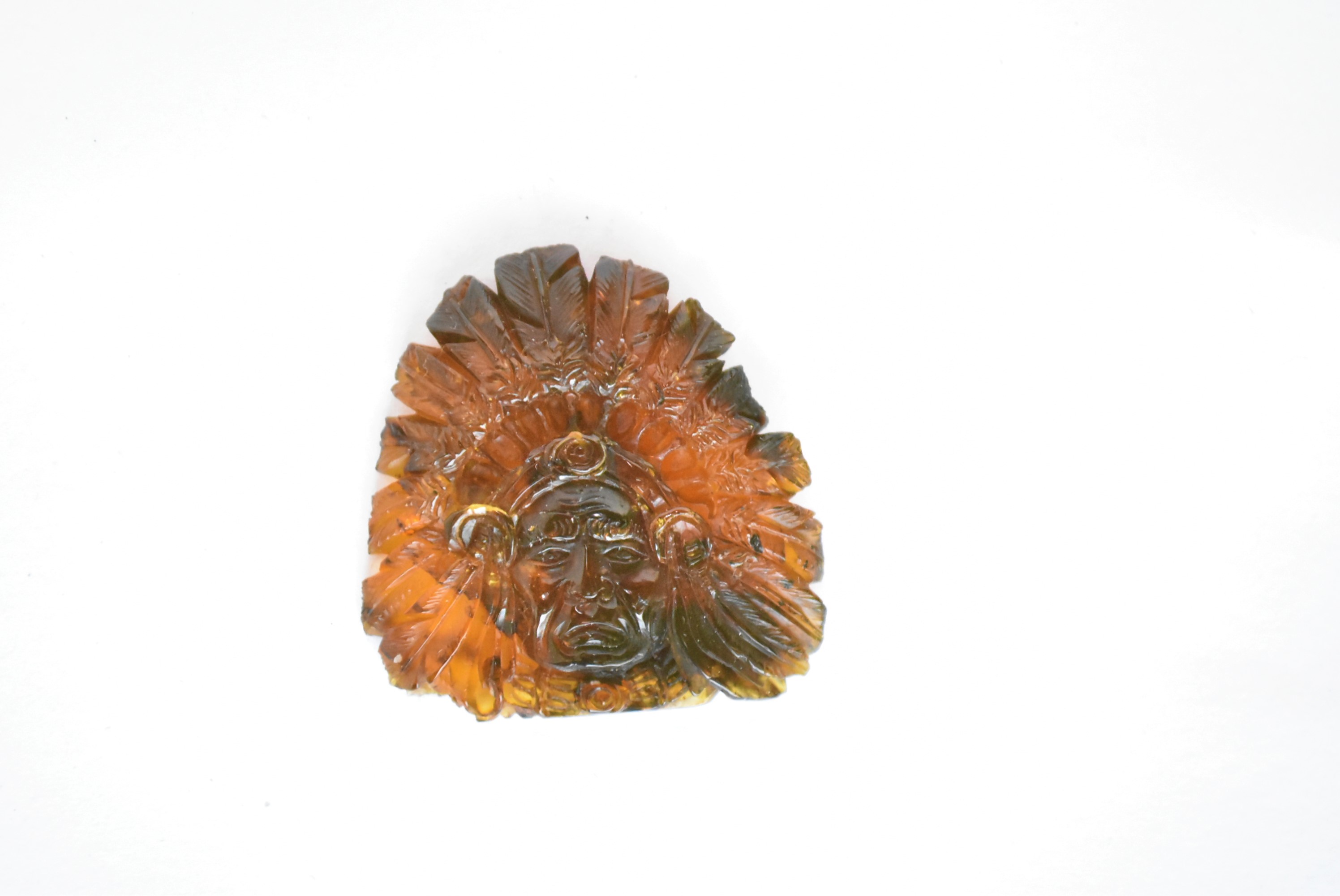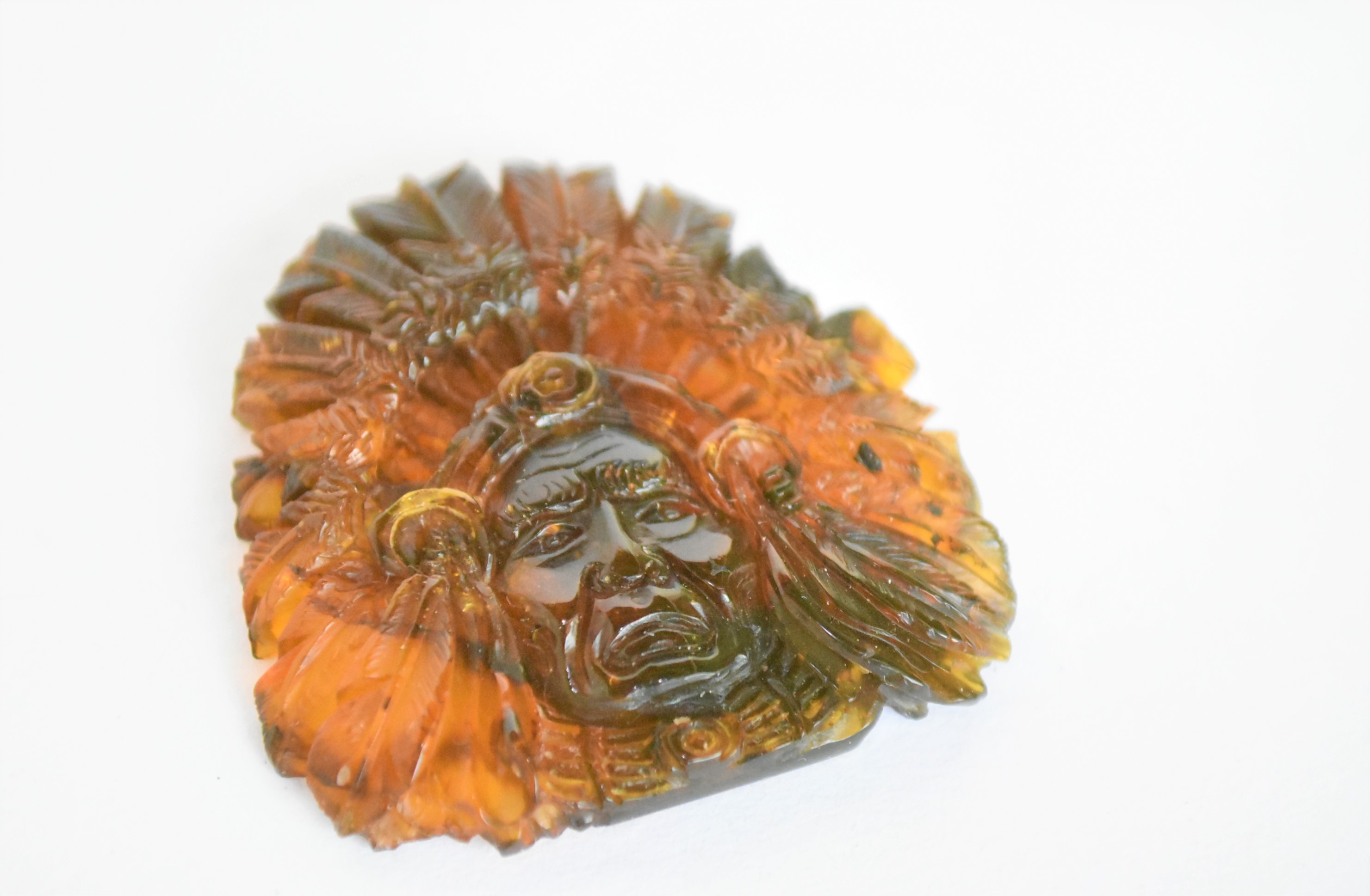 Escultura de ambar amarillo musgoso tallado en forma de cabeza apache. Código: 4777