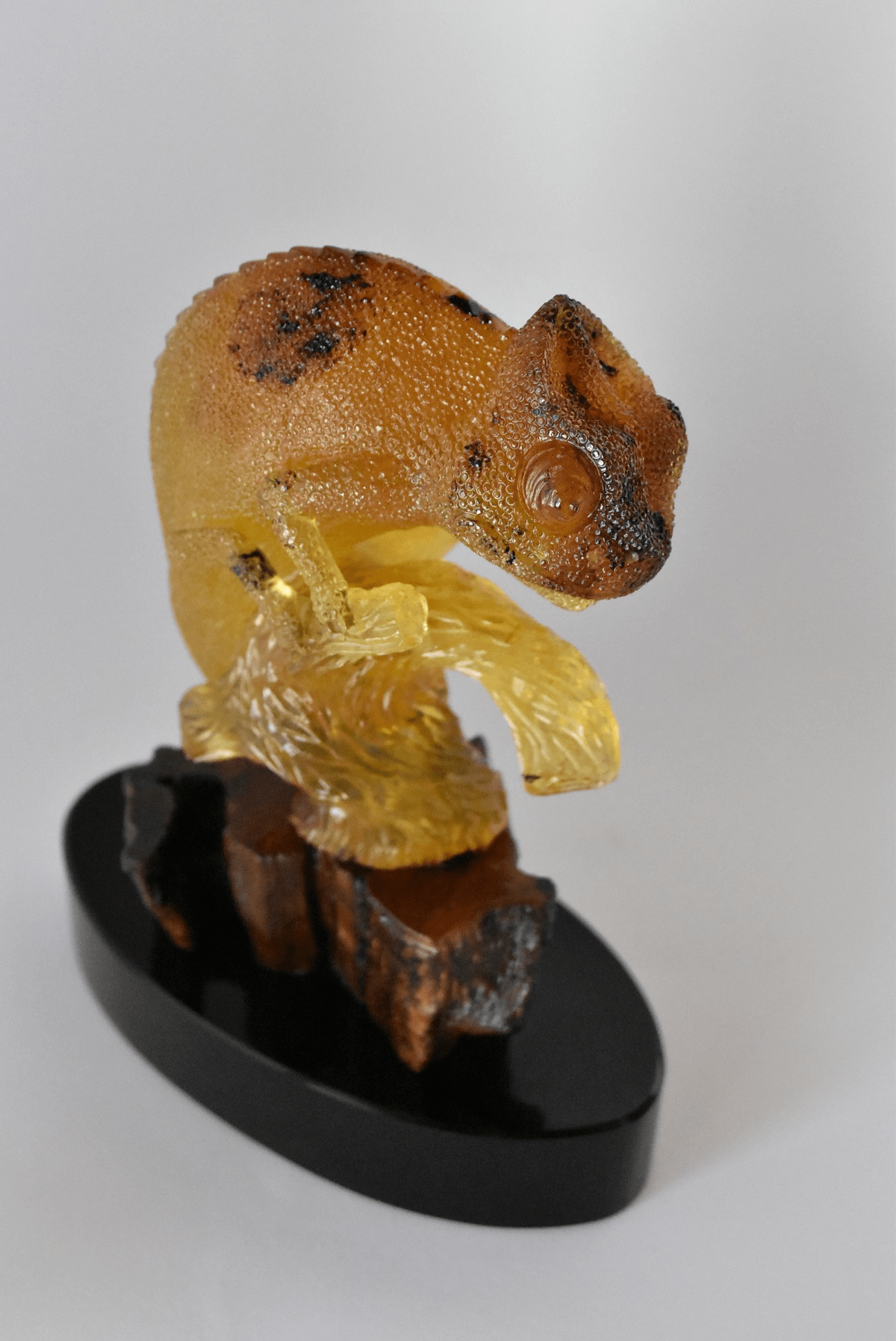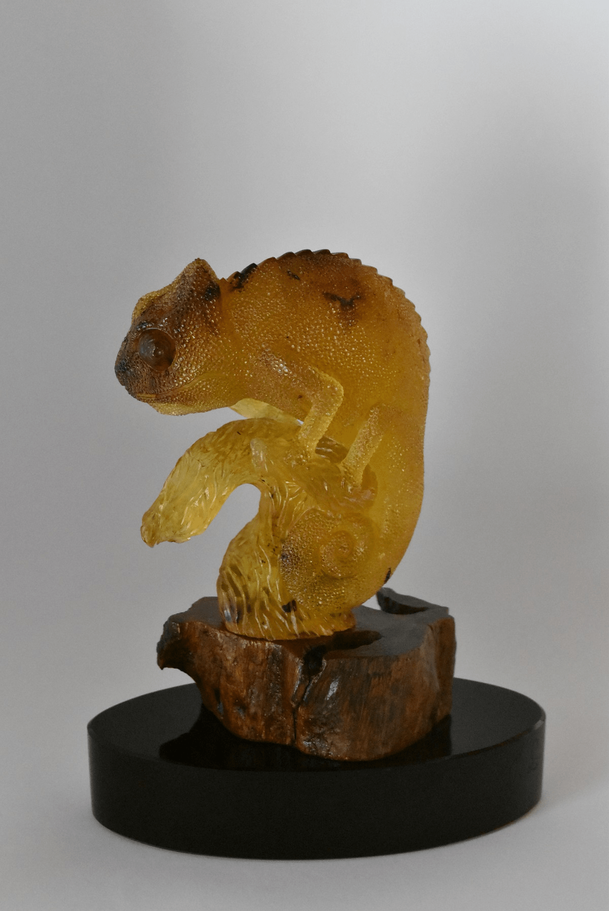 Escultura de camaleón con textura, ámbar amarillo montado sobre tronco de madera y base de obsidiana. Tallada por maestros escultores chiapanecos.