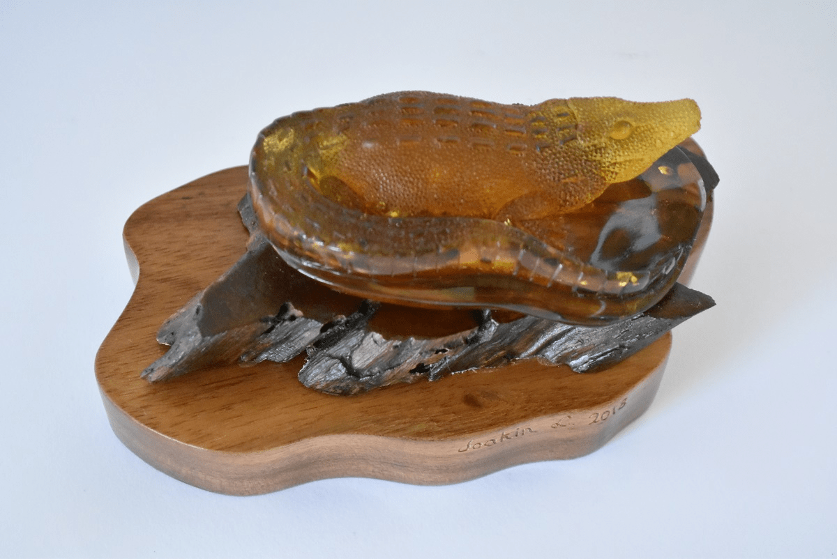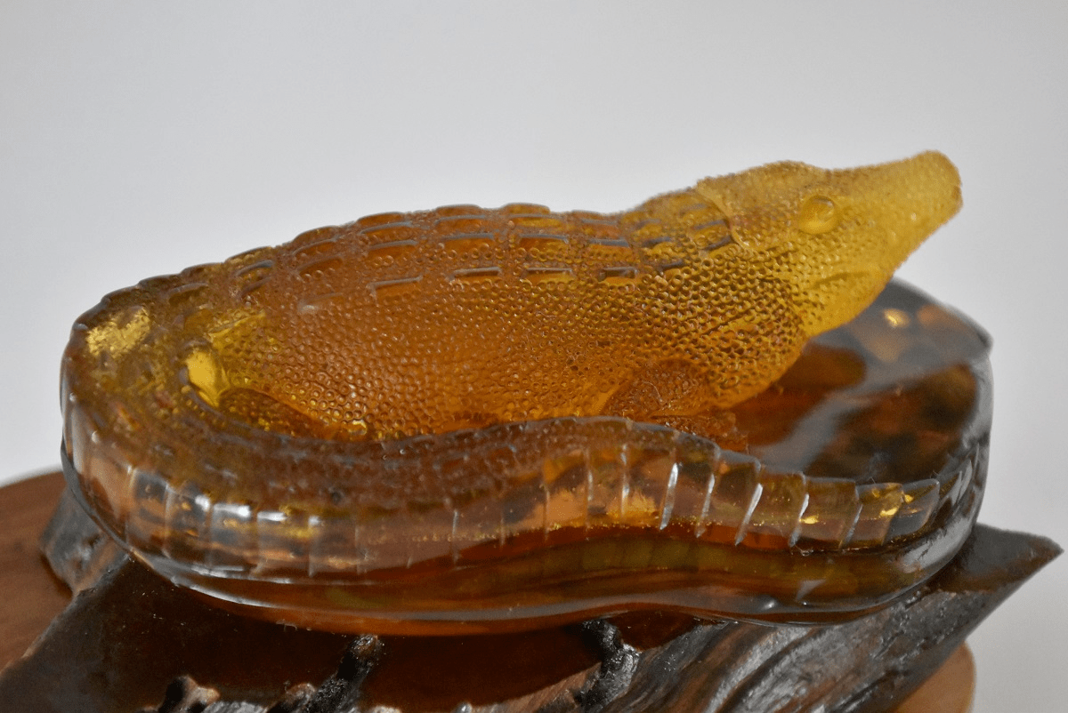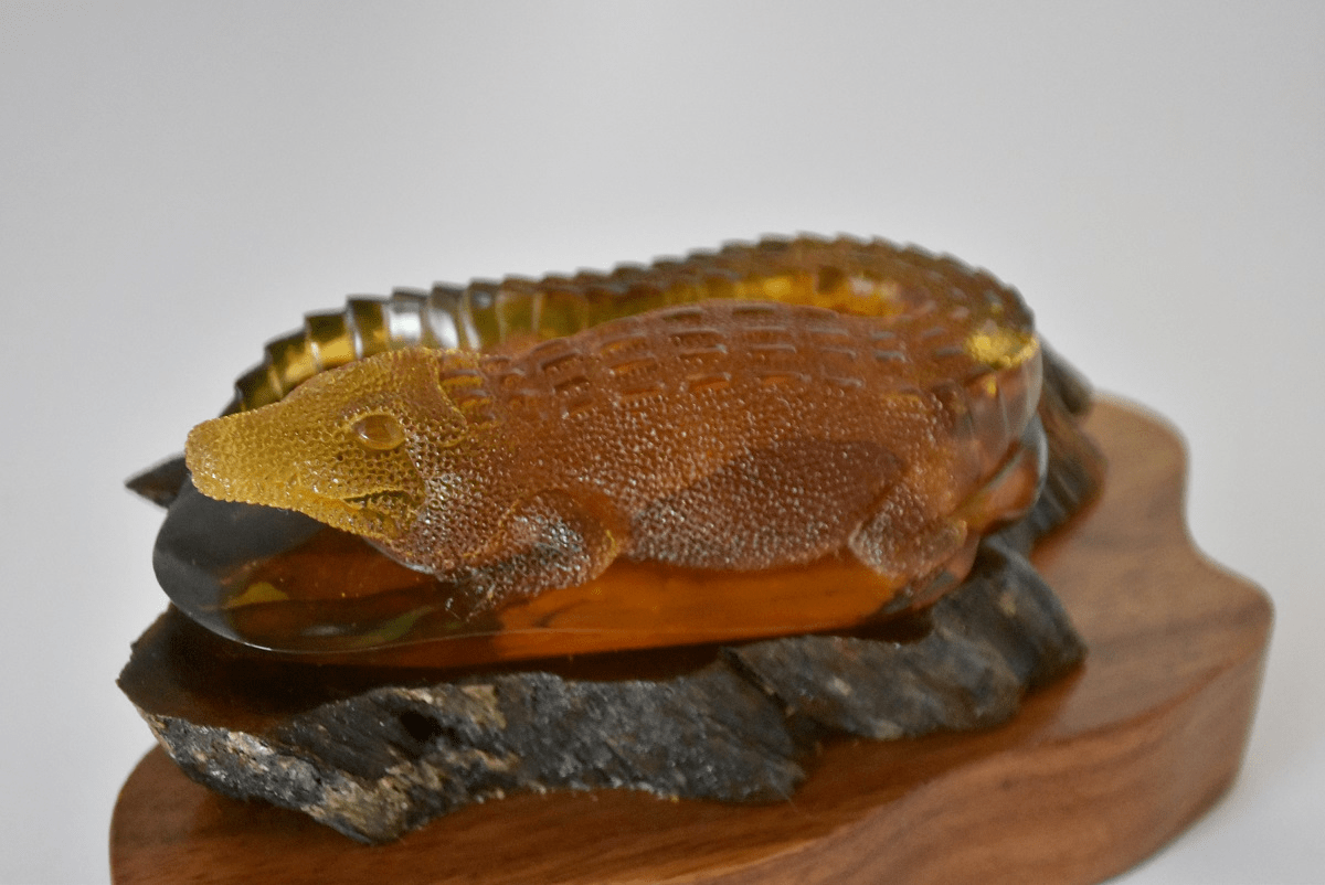 Escultura de cocodrilo adulto tomando el sol, ámbar amarillo pulido y con textura montado en tronco sobre madera tropical. Tallada por maestros escultores chiapanecos.