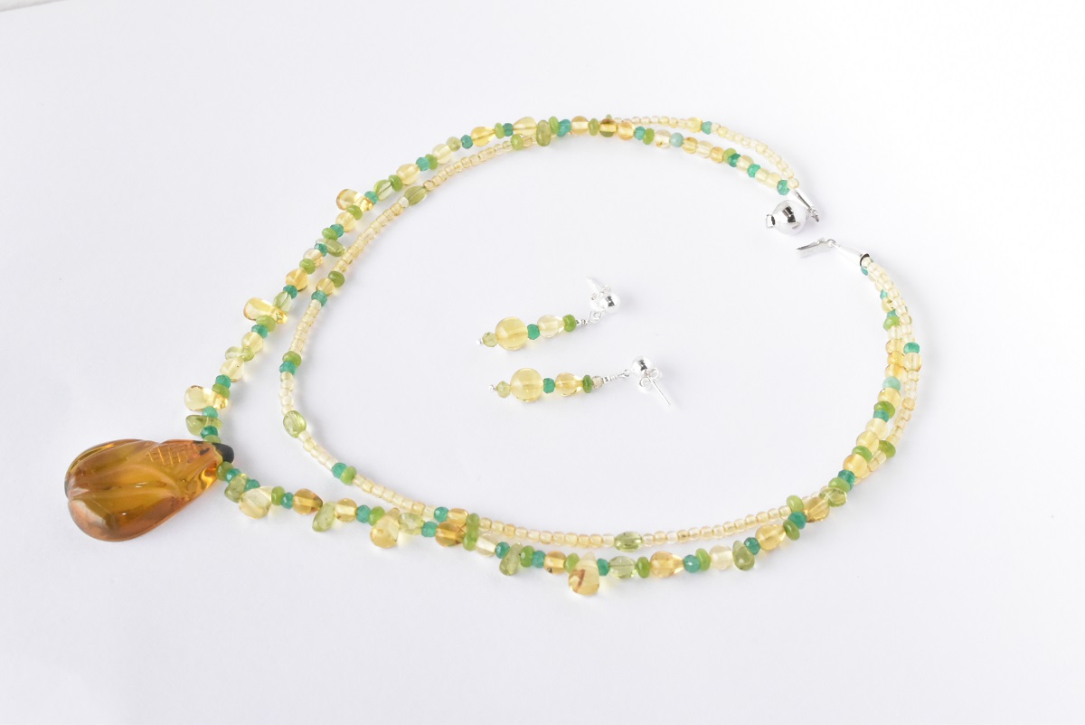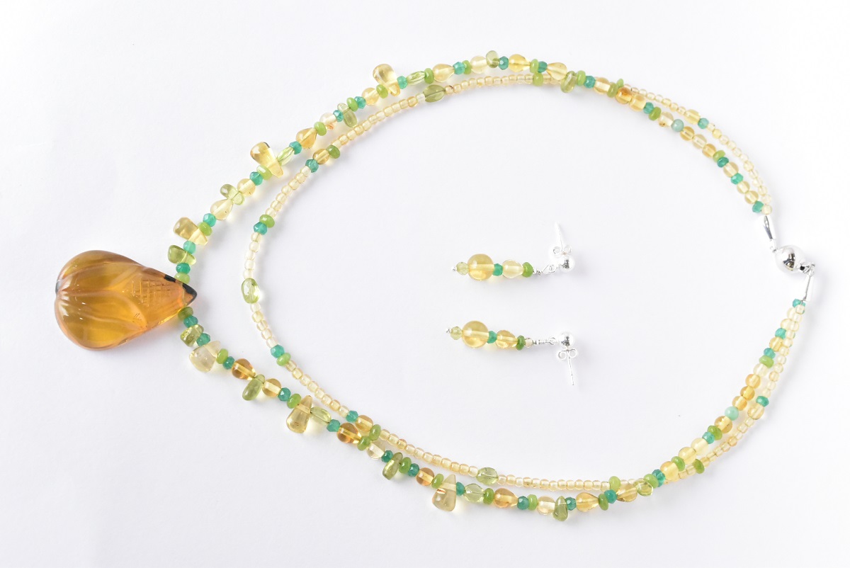 Collar de ámbar amarillo en forma de esferas y gotas, pequeñas piezas de jadeíta, este es un mineral utilizado a manera de gemas; piezas de peridoto que es un mineral con calidad de gema. Con broche de plata .925. Código 4459 --Checar disponibilidad de producto--