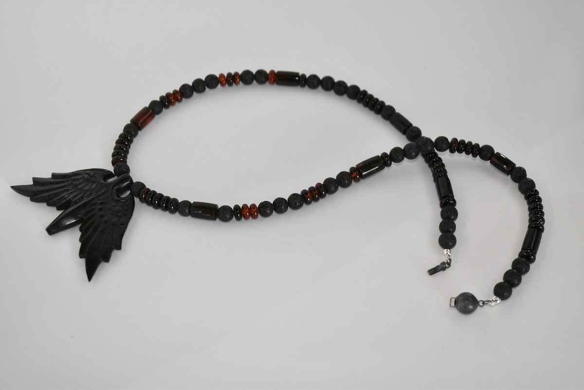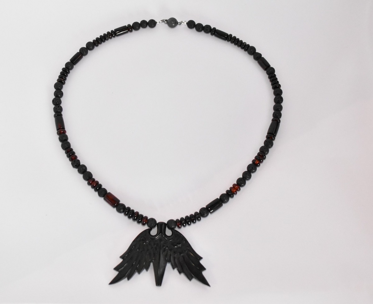 Collar de ámbar rojo en formas de esferas y tubos pequeños con un ala negra al centro, contiene además piezas de piedra volcánica y piezas azabache. Código 4457.