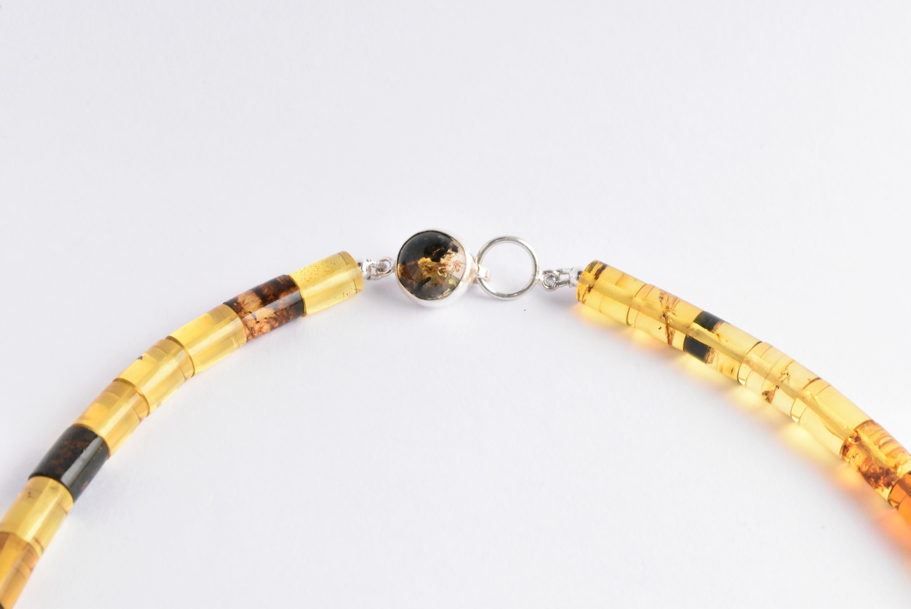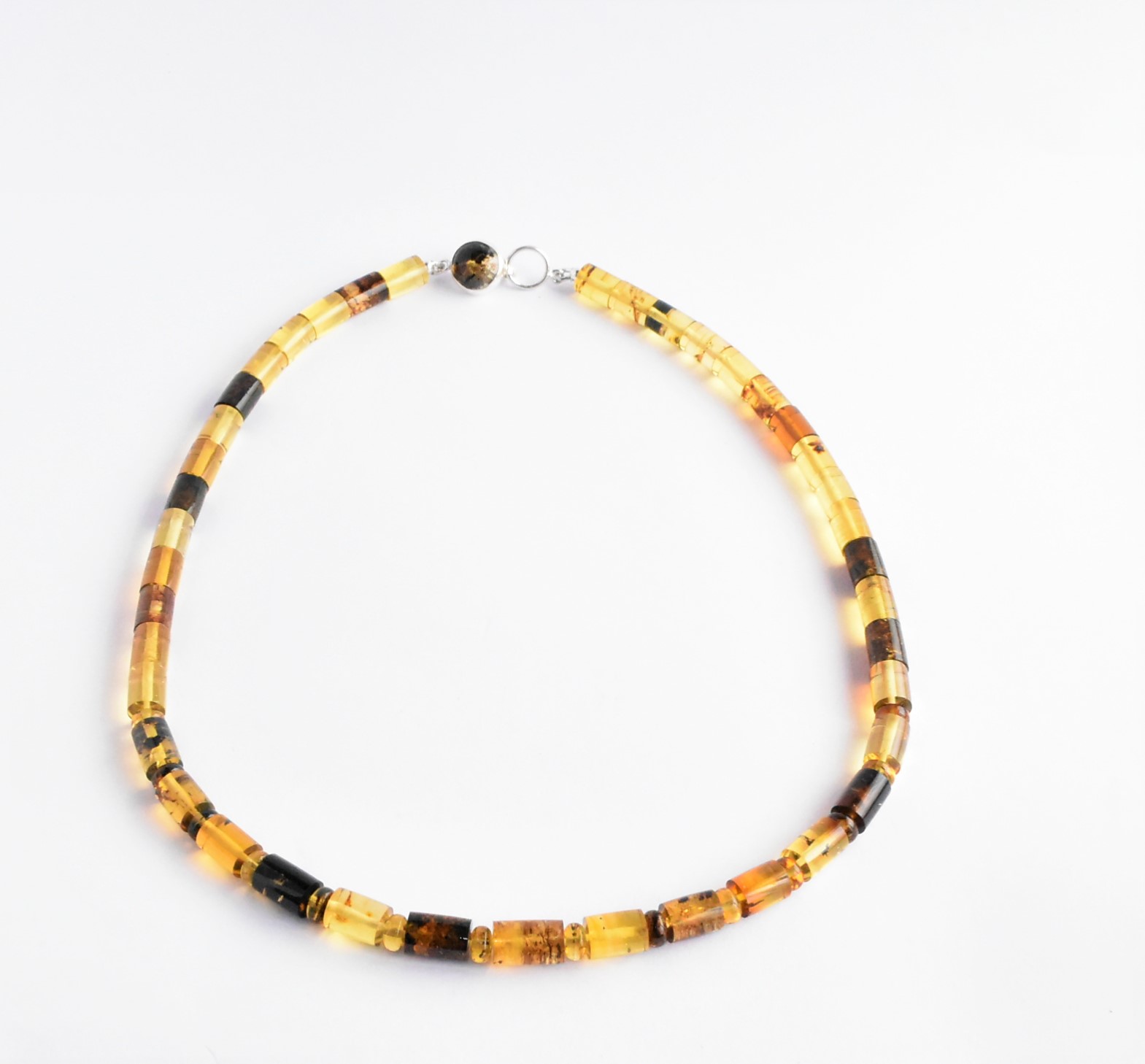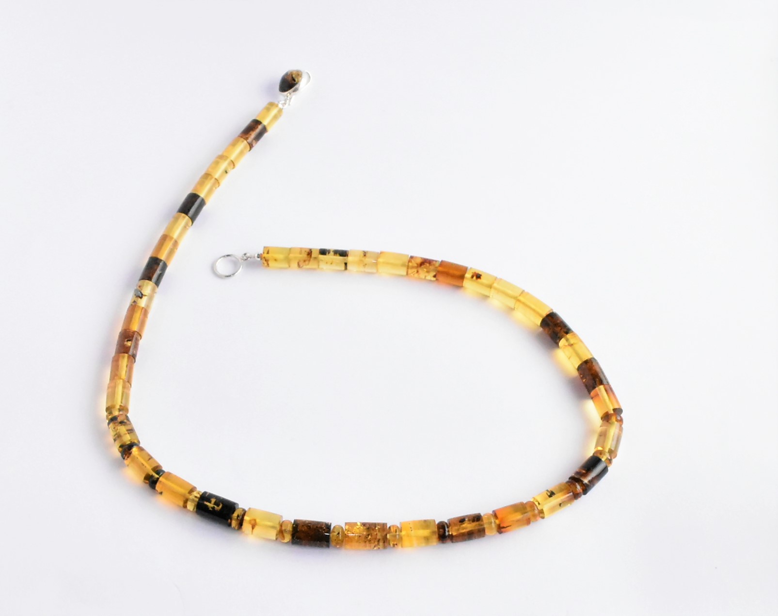 Collar con cuentas en forma de tubos de ambar amarillo jaspeado, con broche de plata .925. Código: 4610.