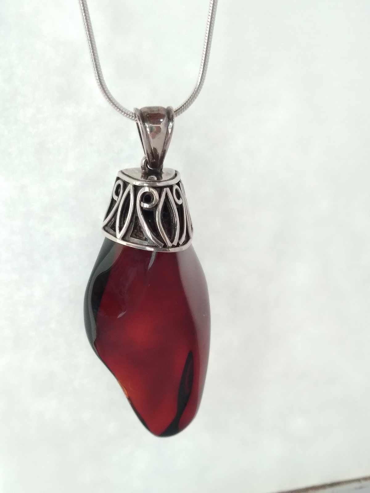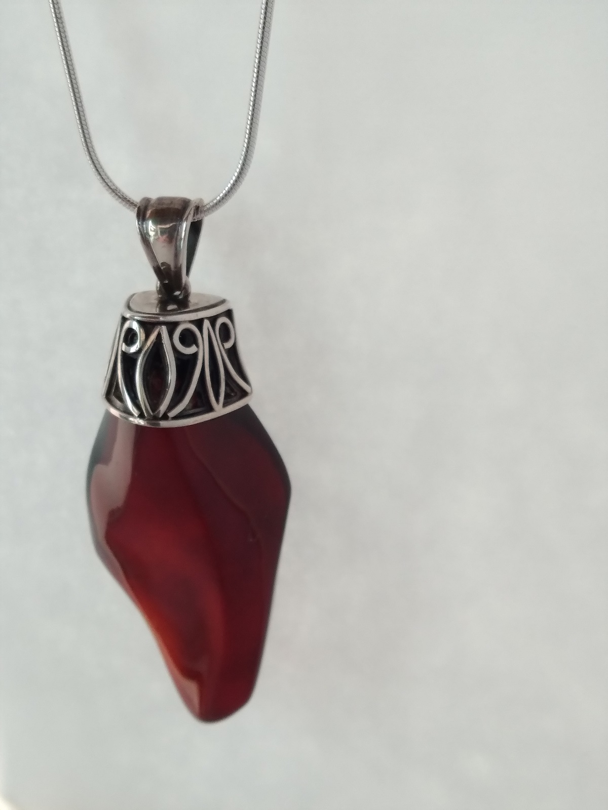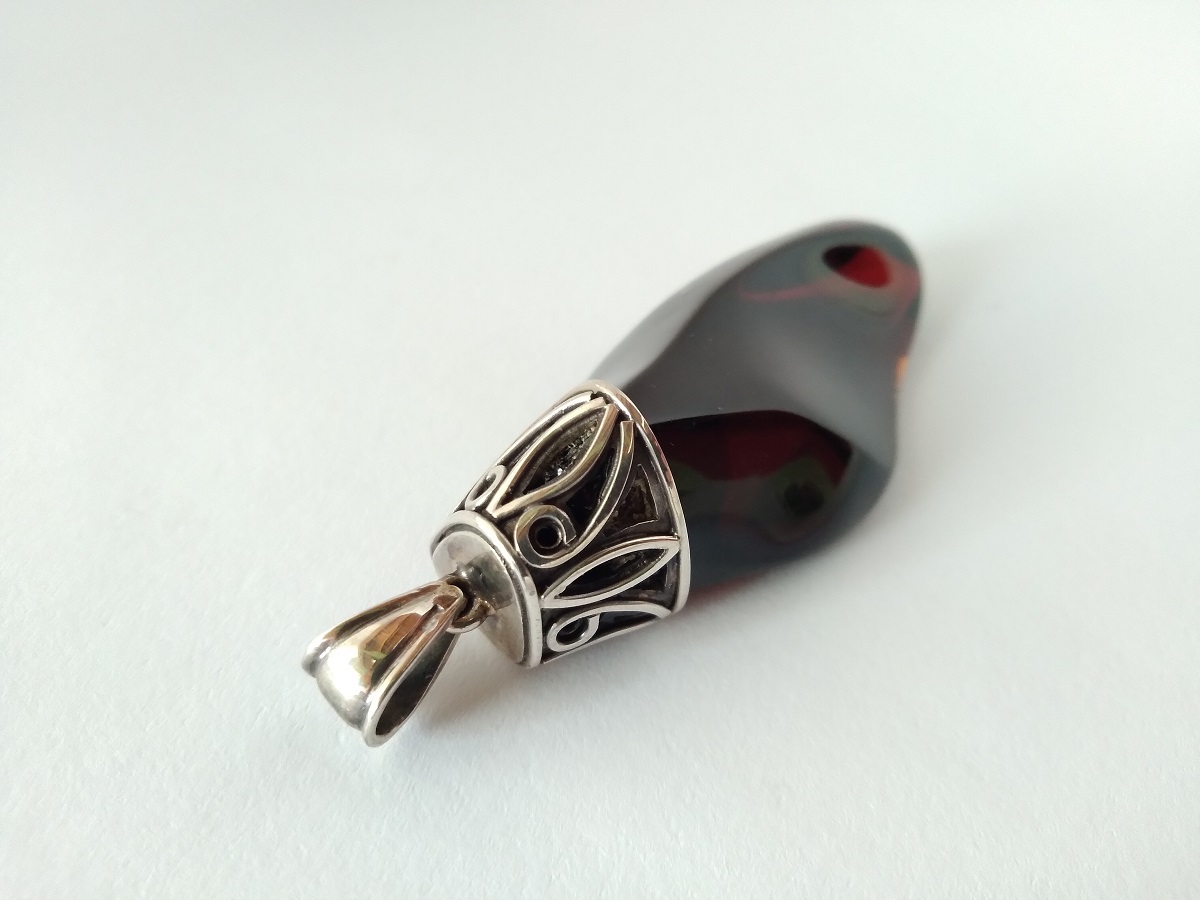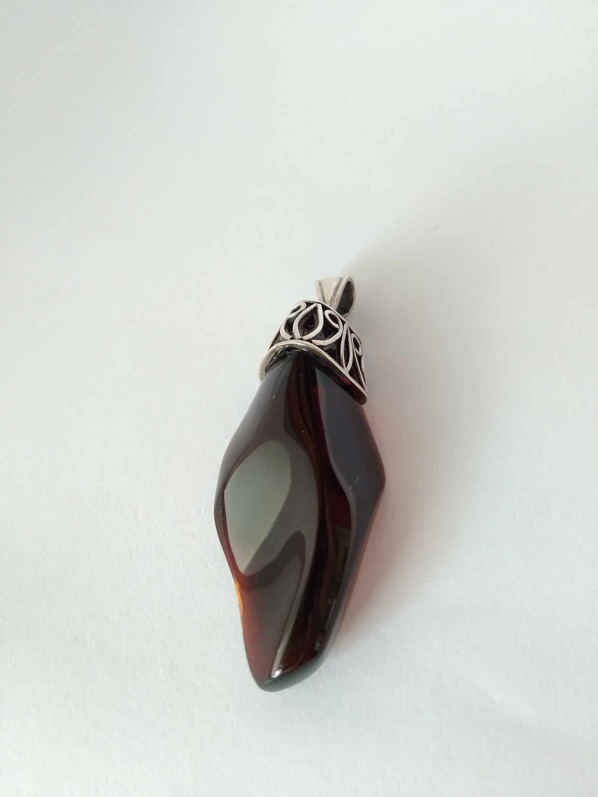PIEZA DISPONIBLE BAJO PEDIDO Dije de forma irregular de ámbar rojo tono vino con diseño en la plata y con pasacadena .925, Código 2952