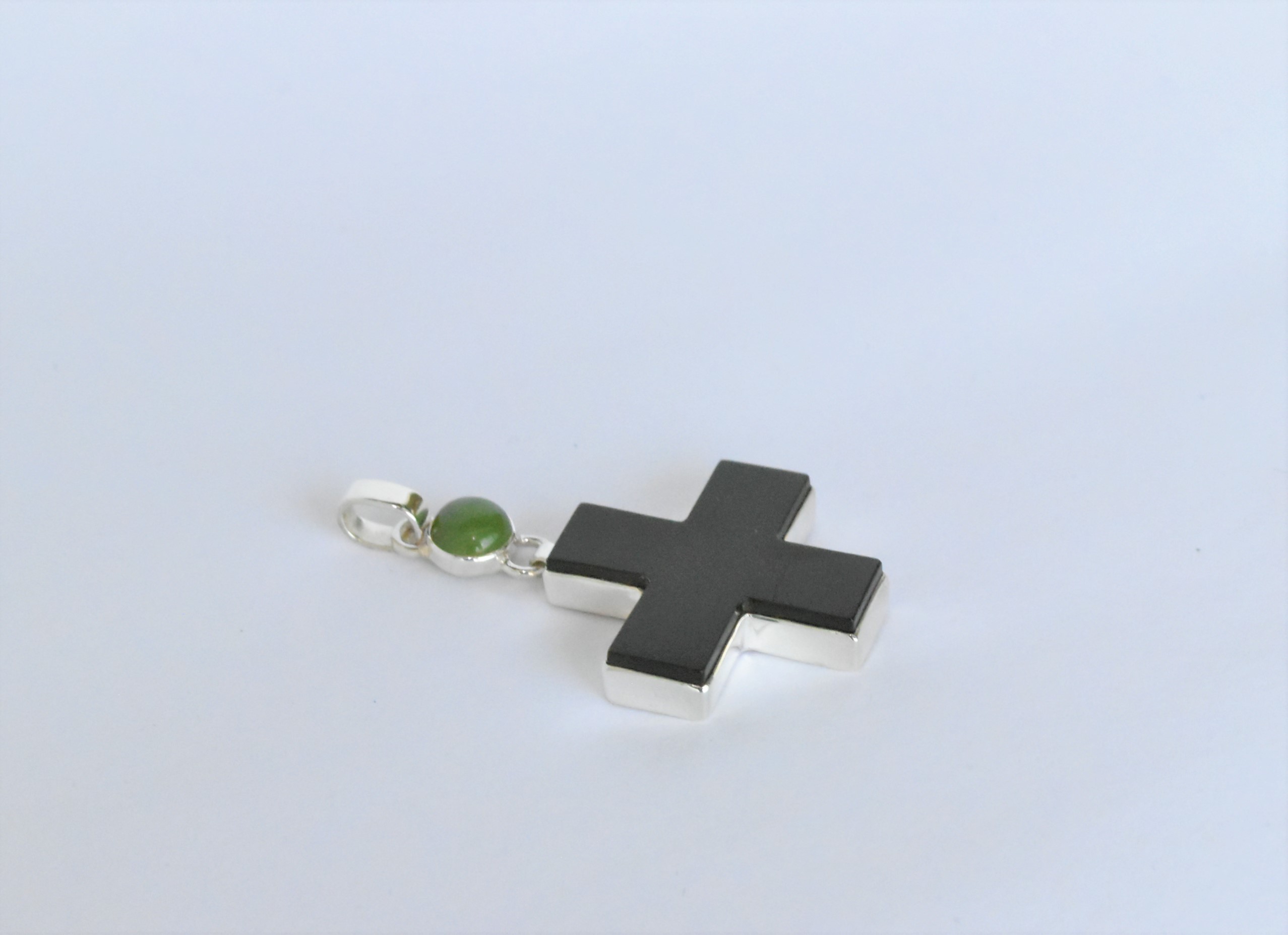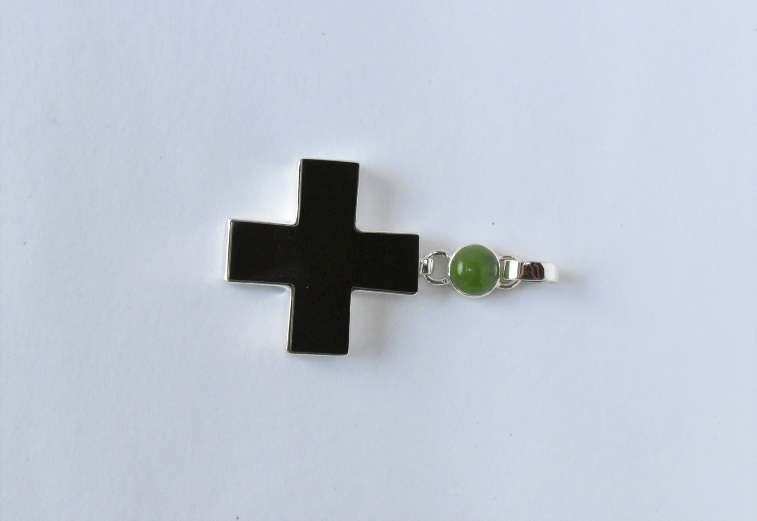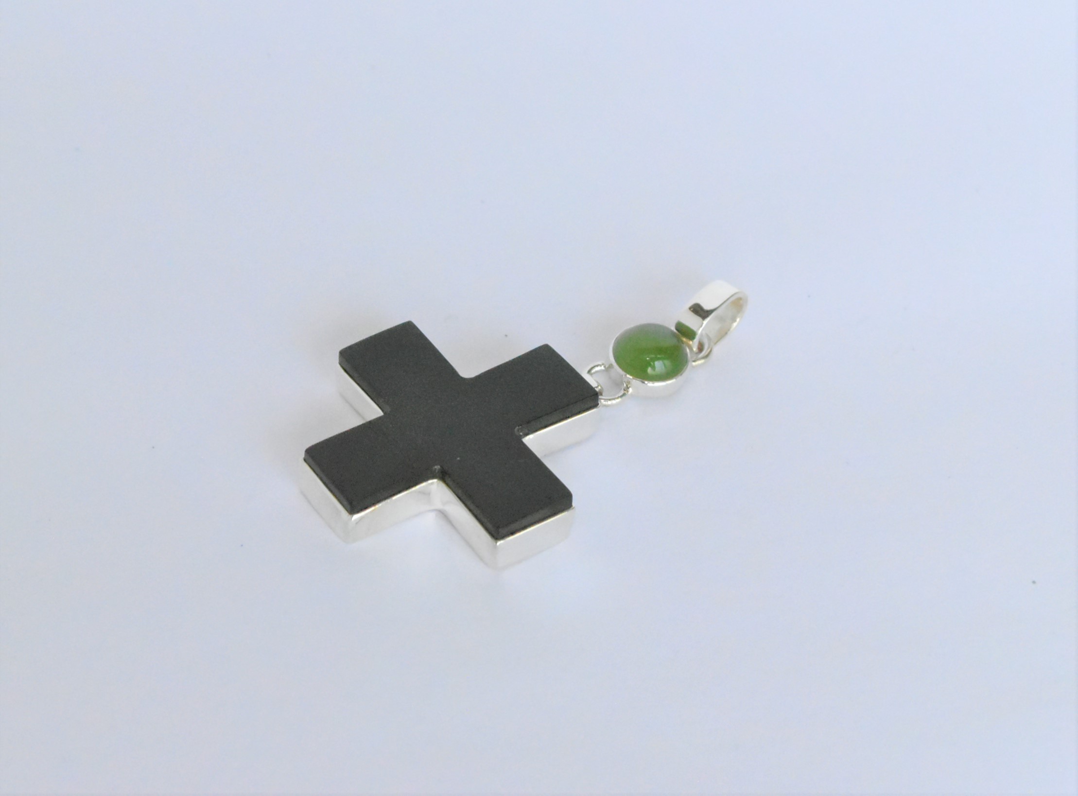 Dije en forma de cruz, elaborado a base de Azabache, con cuenta de jade , biselado y pasa cadena de plata .925. Código : 4715
