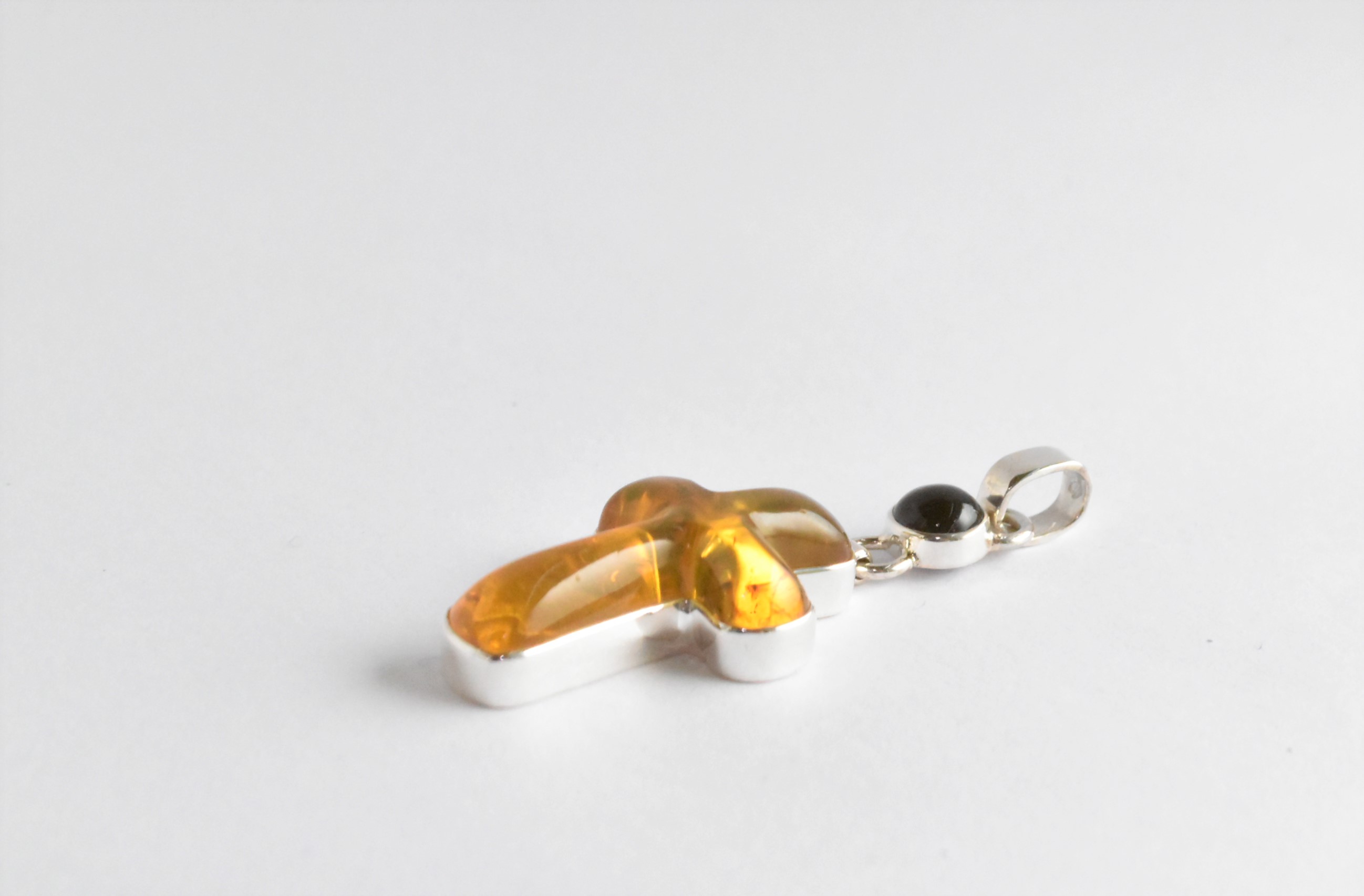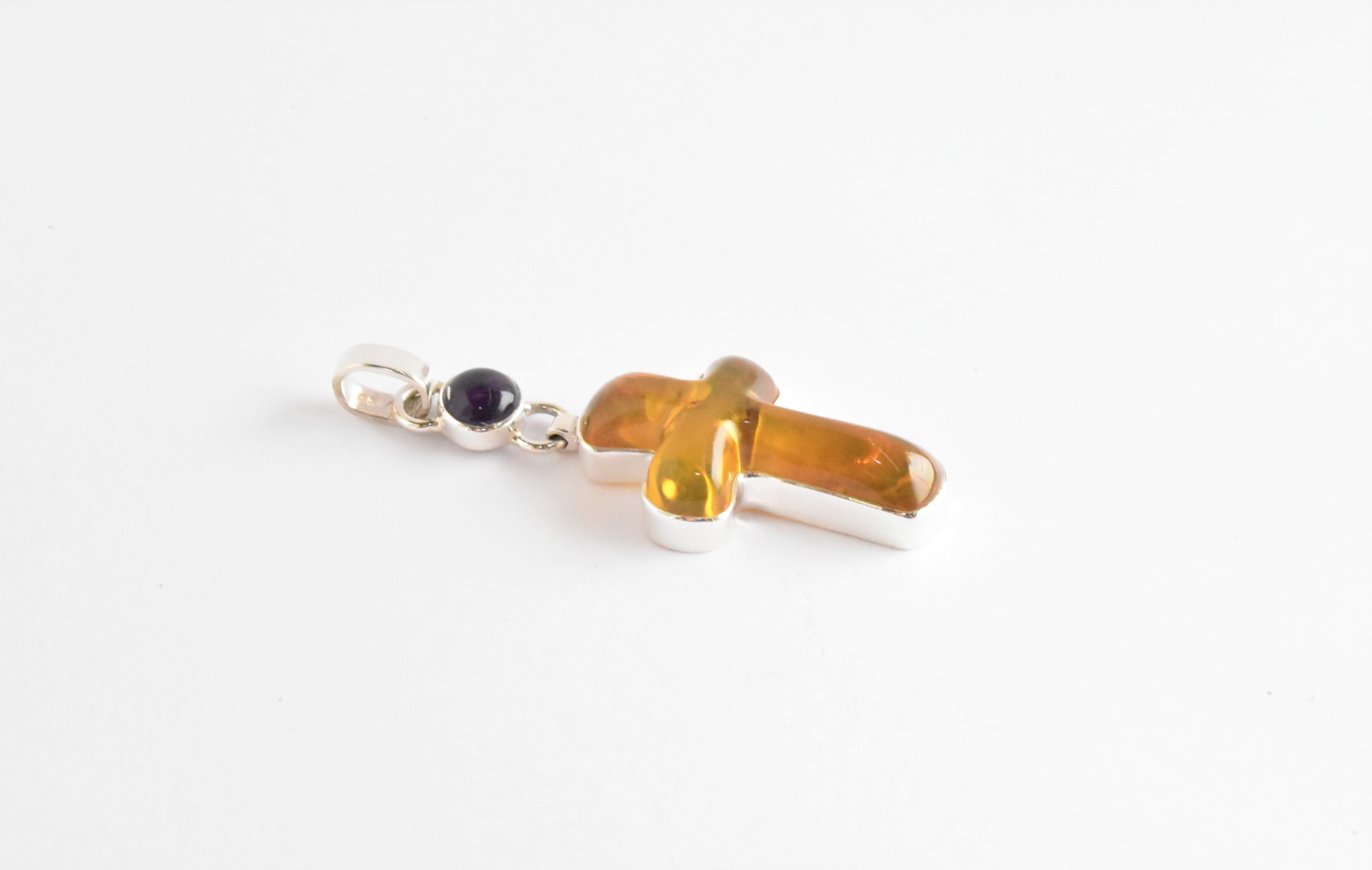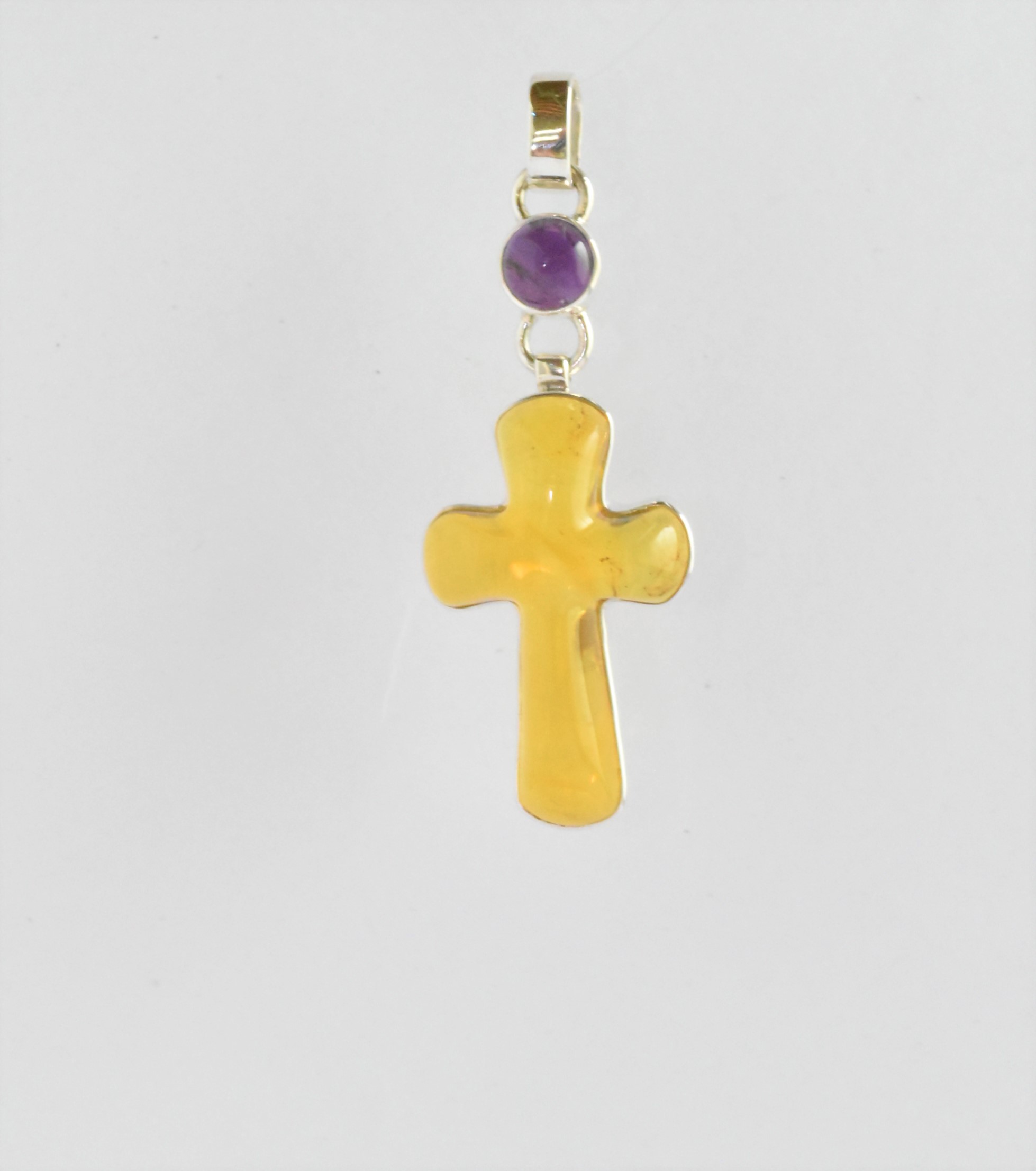 Dije en forma de cruz de àmbar amarillo, montado en plata .925, incluye una pieza circular de amatista. Código: 4365.