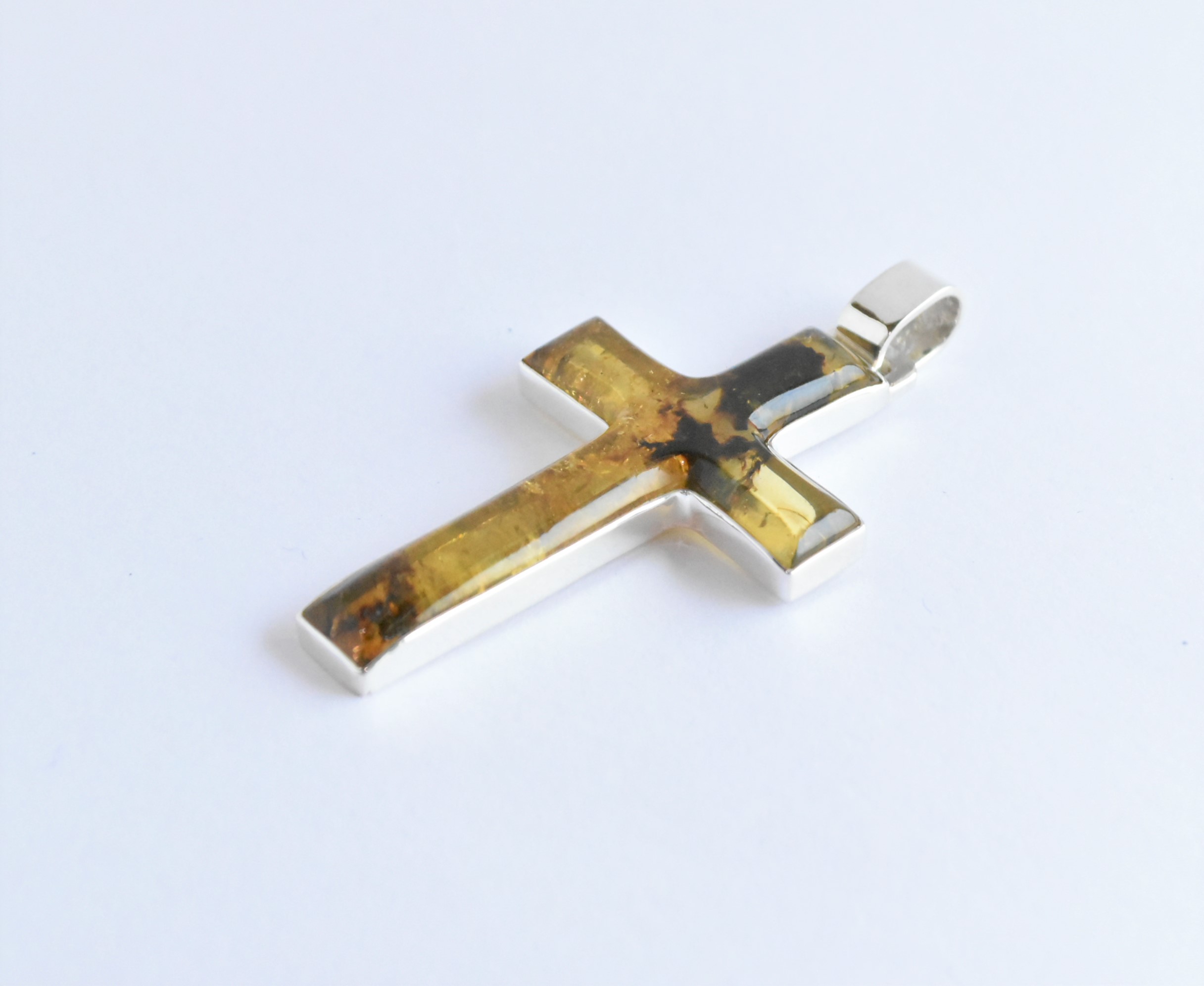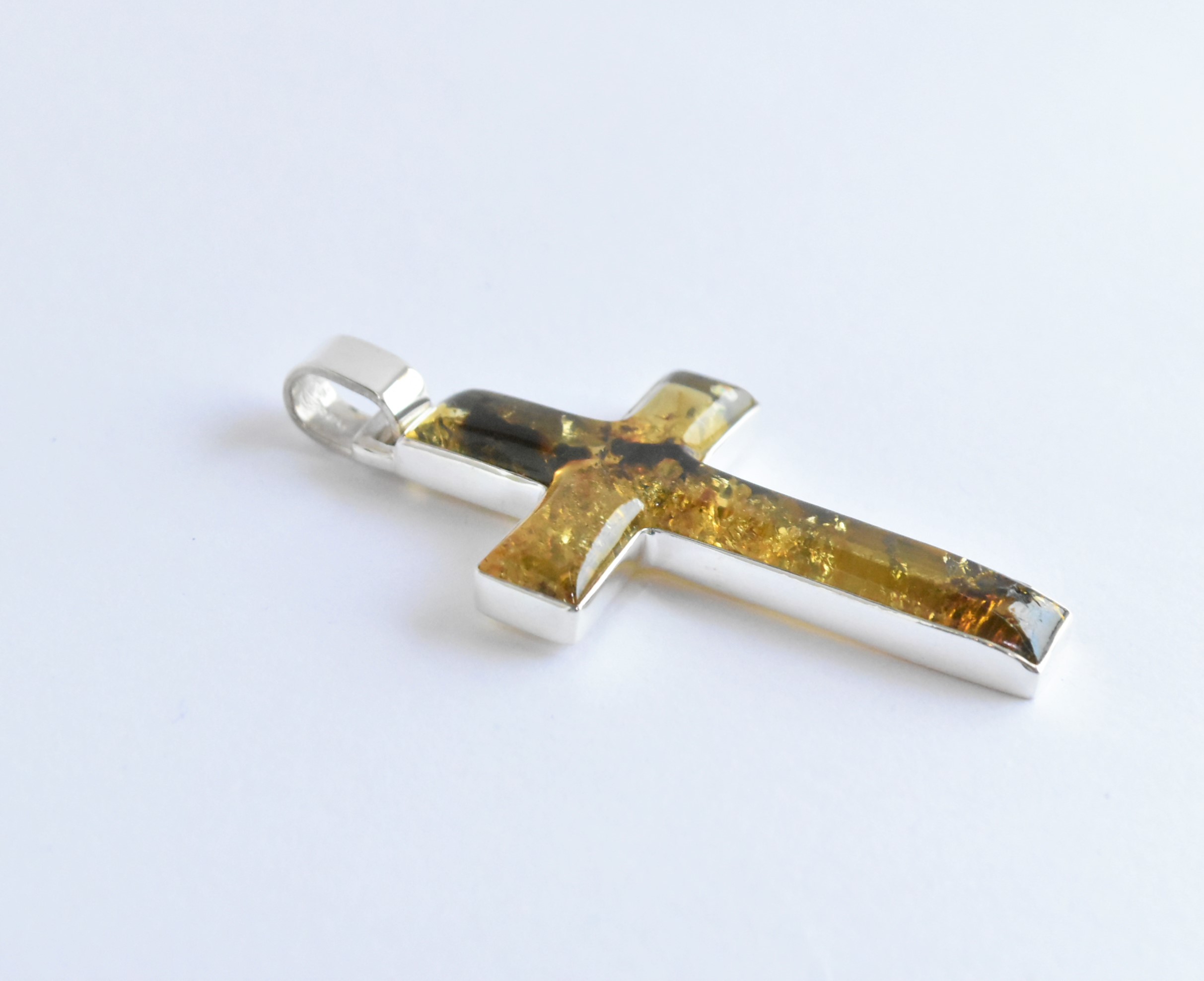 Dije de ámbar musgoso en forma de cruz con pasa cadena de plata .925. Código: 4711