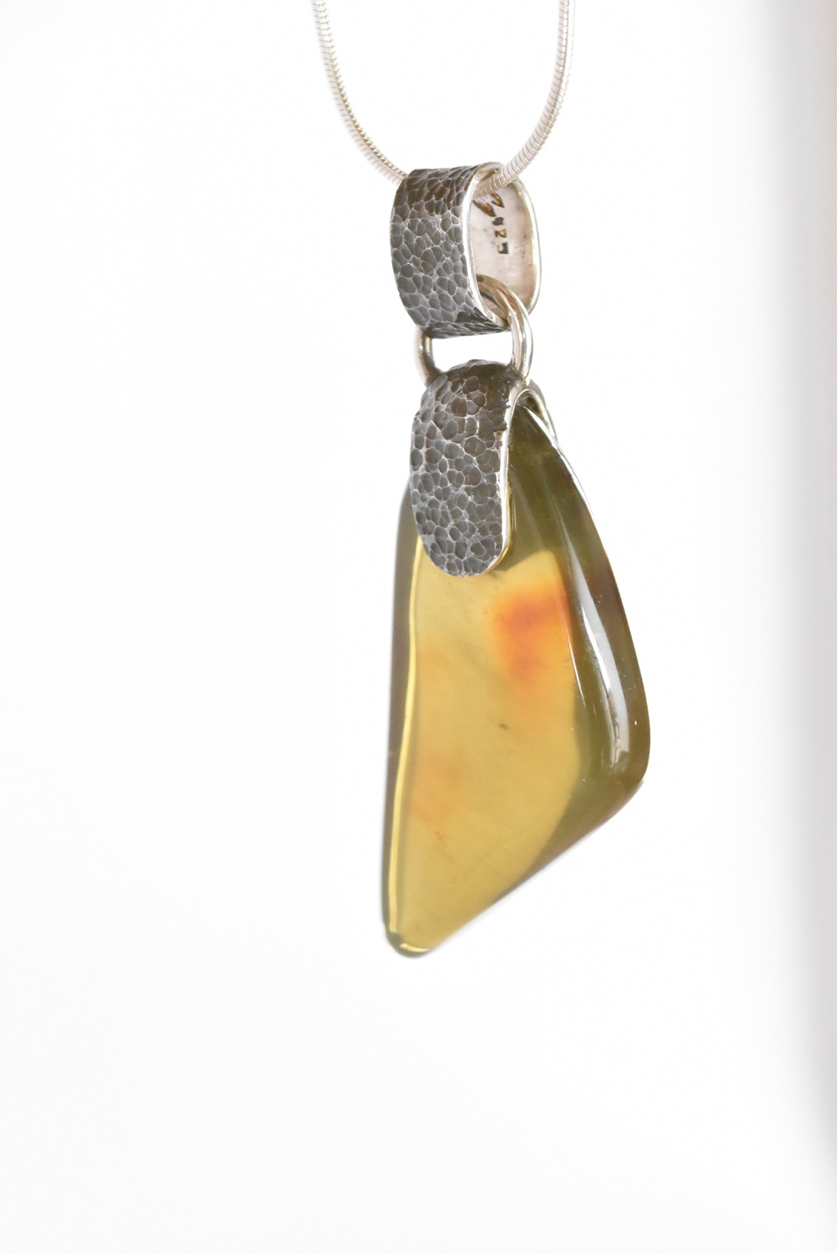PIEZA DISPONIBLE BAJO PEDIDO Dije de ámbar verde con plata de textura verde olivo en forma de trapecio, incluye pasacadena de plata texturizada .925. Código 837