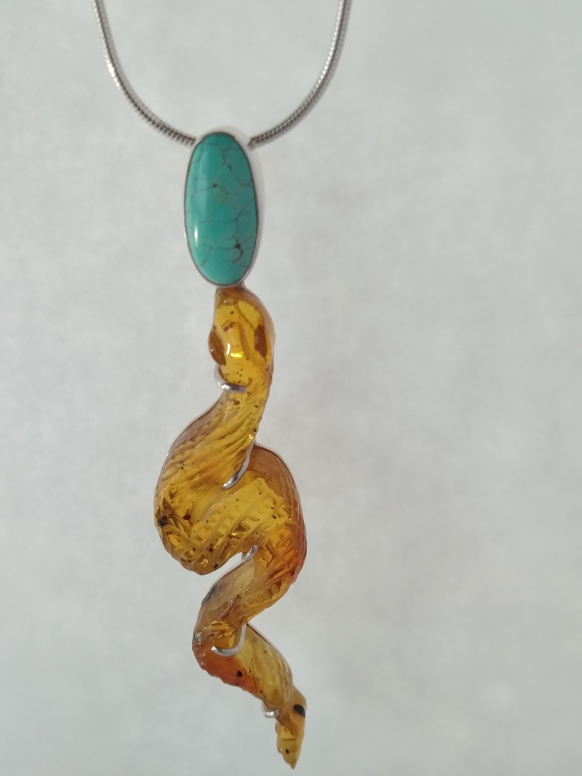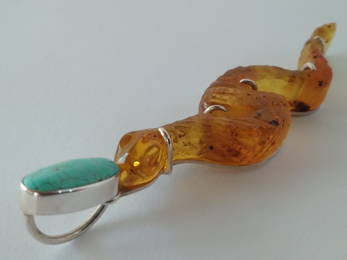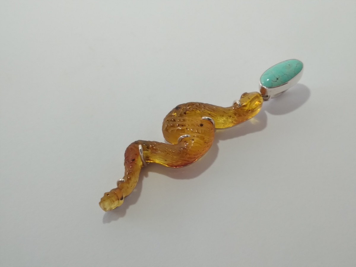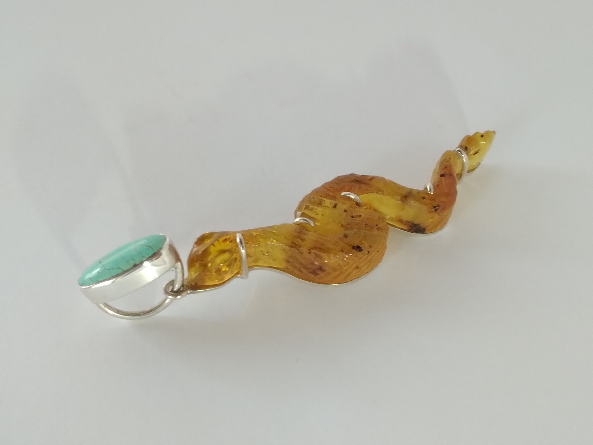 Este dije tallado finamente con forma de serpiente en ámbar amarillo, está montado con uñas de plata para lograr ver en su totalidad la pieza de ámbar. Tiene una turquesa que hace resaltar el color ambarino. Con pasacadena oculto de plata .925, Código 1524