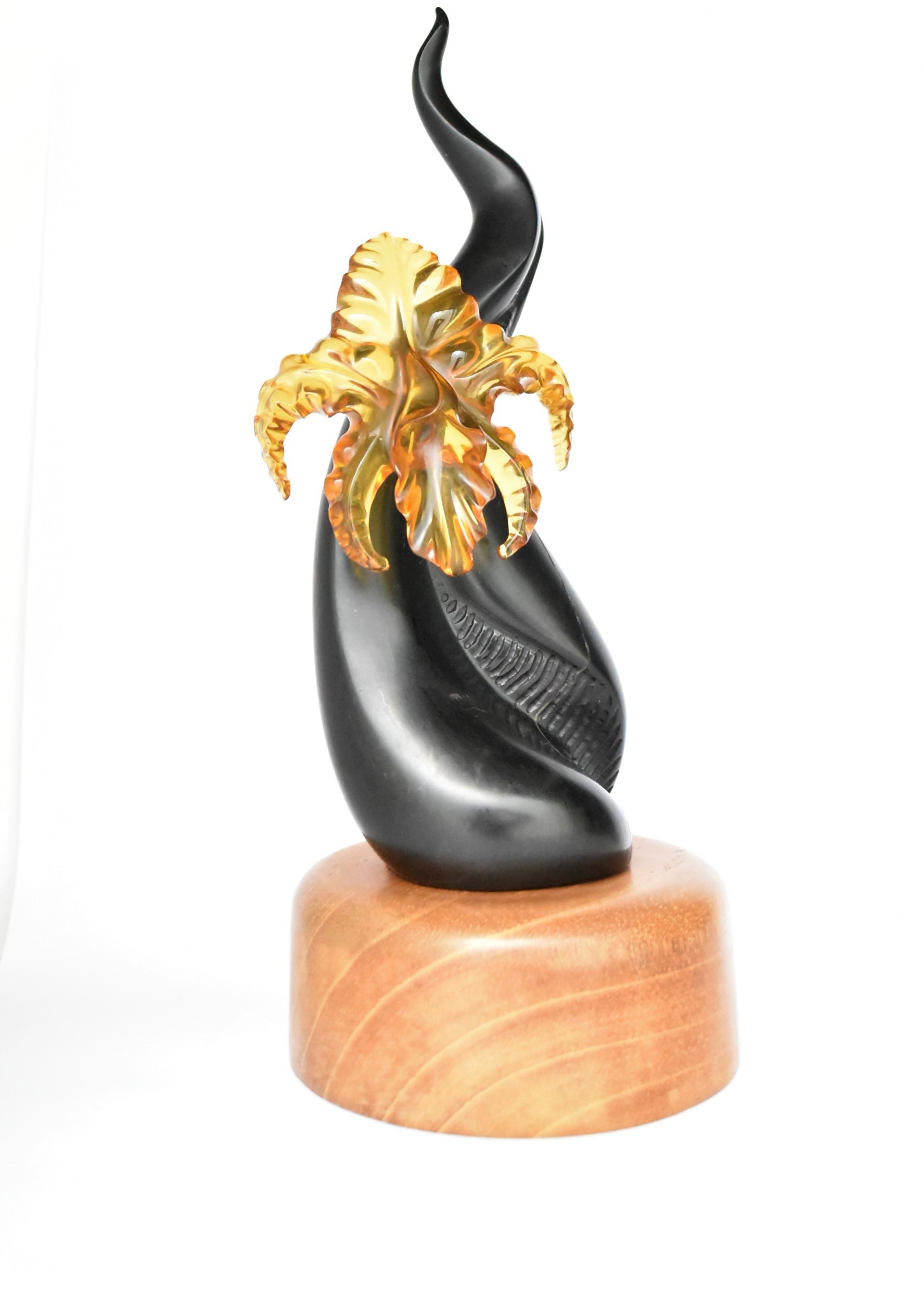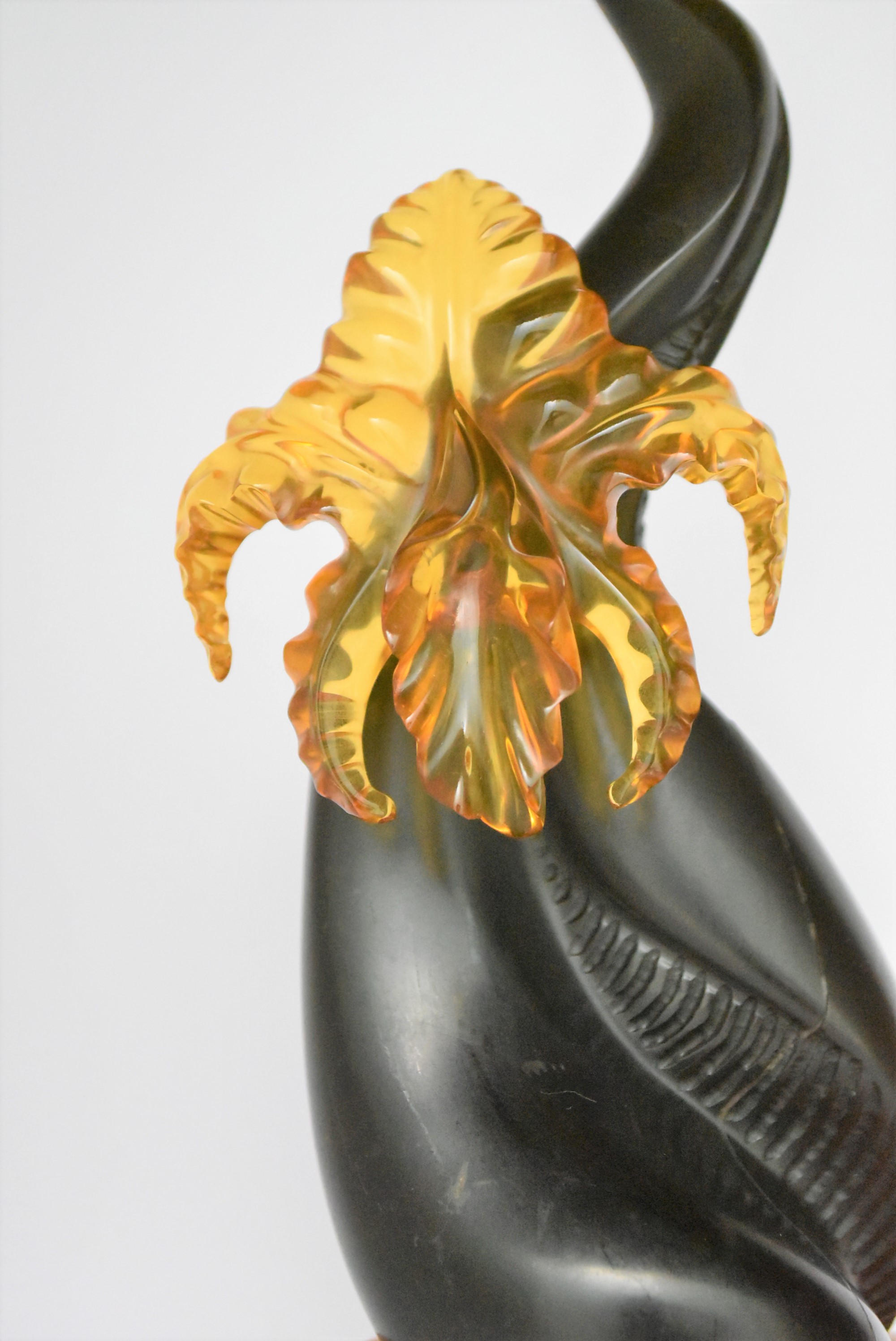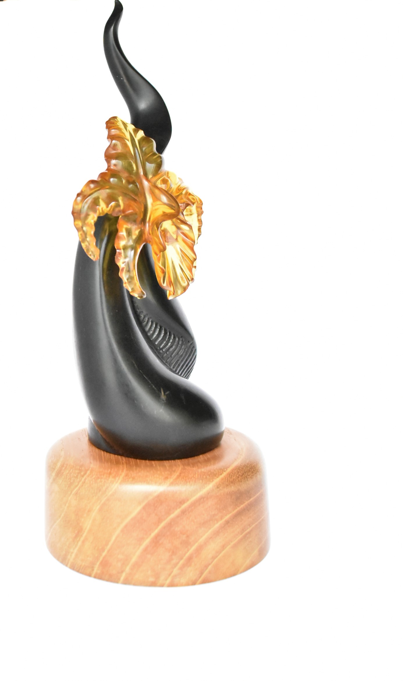 Escultura en forma de flor tallada en ambar amarillo claro, montada en base de azabache. Código: 1331