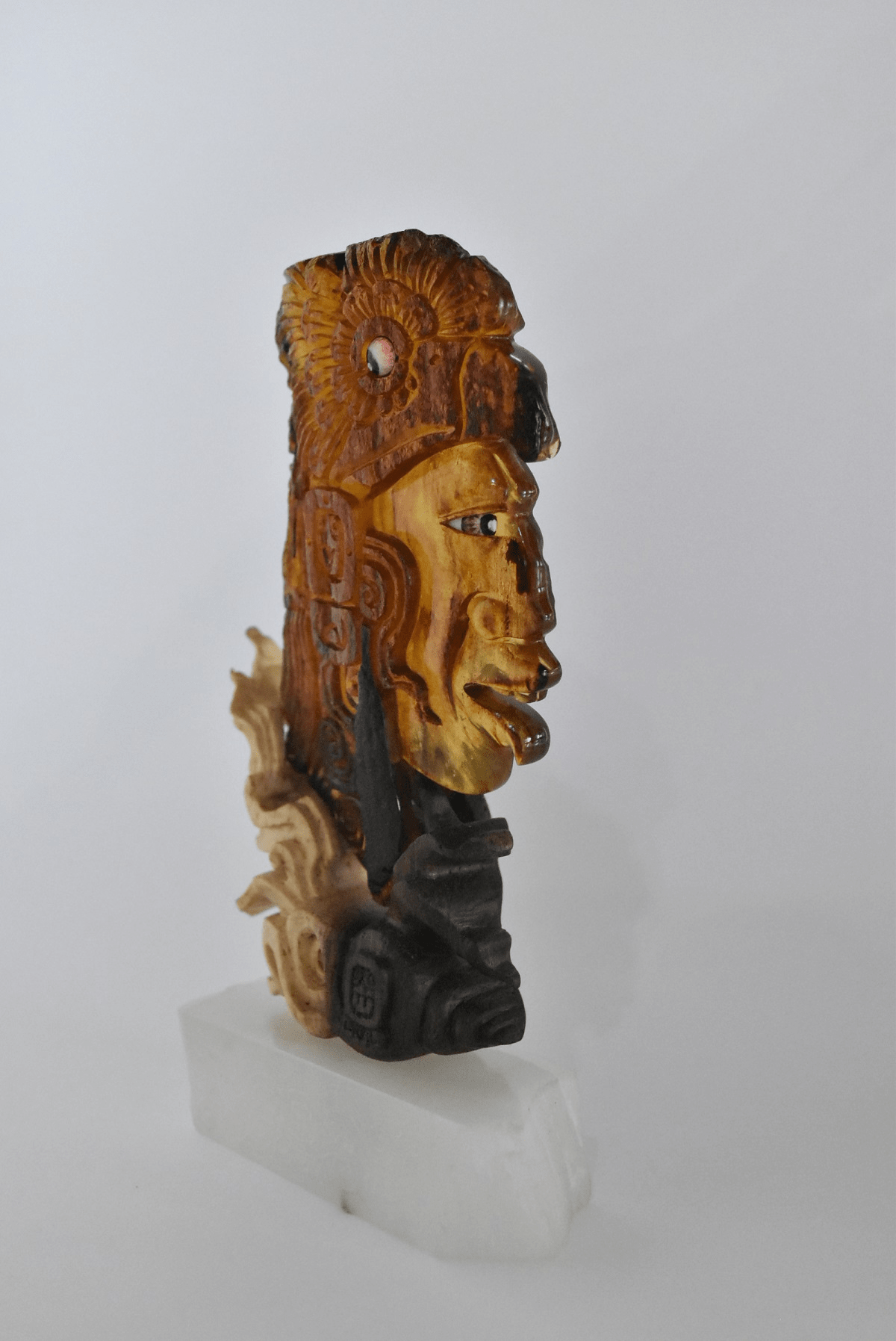 Escultura en forma de guerrero aguila de ámbar amarillo pulido y con textura, en base calcita de color blanco, negro y café. Tallada por maestros escultores chiapanecos.
