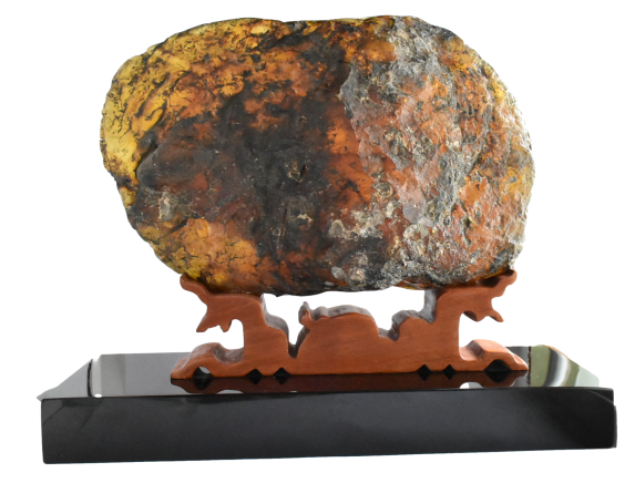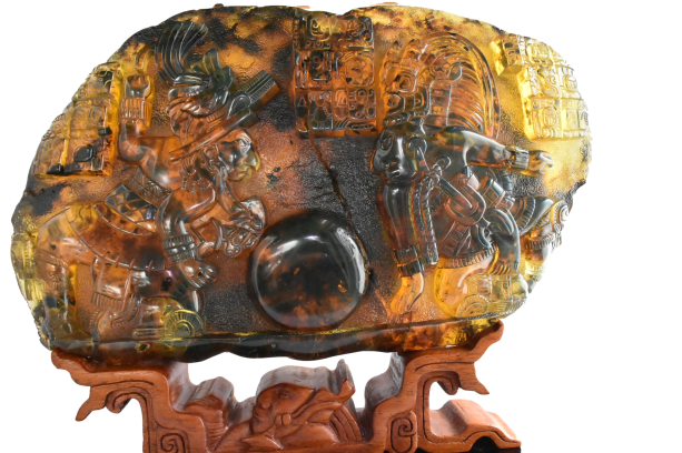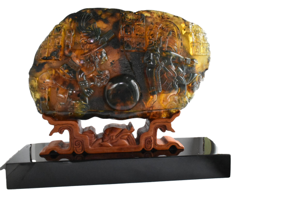 SÓLO BAJO ORDEN ESPECIAL Escultura representando el juego de pelota tradicional de la cultura Maya, elaborada sobre ámbar musgoso y montado sobre base de obsidiana.