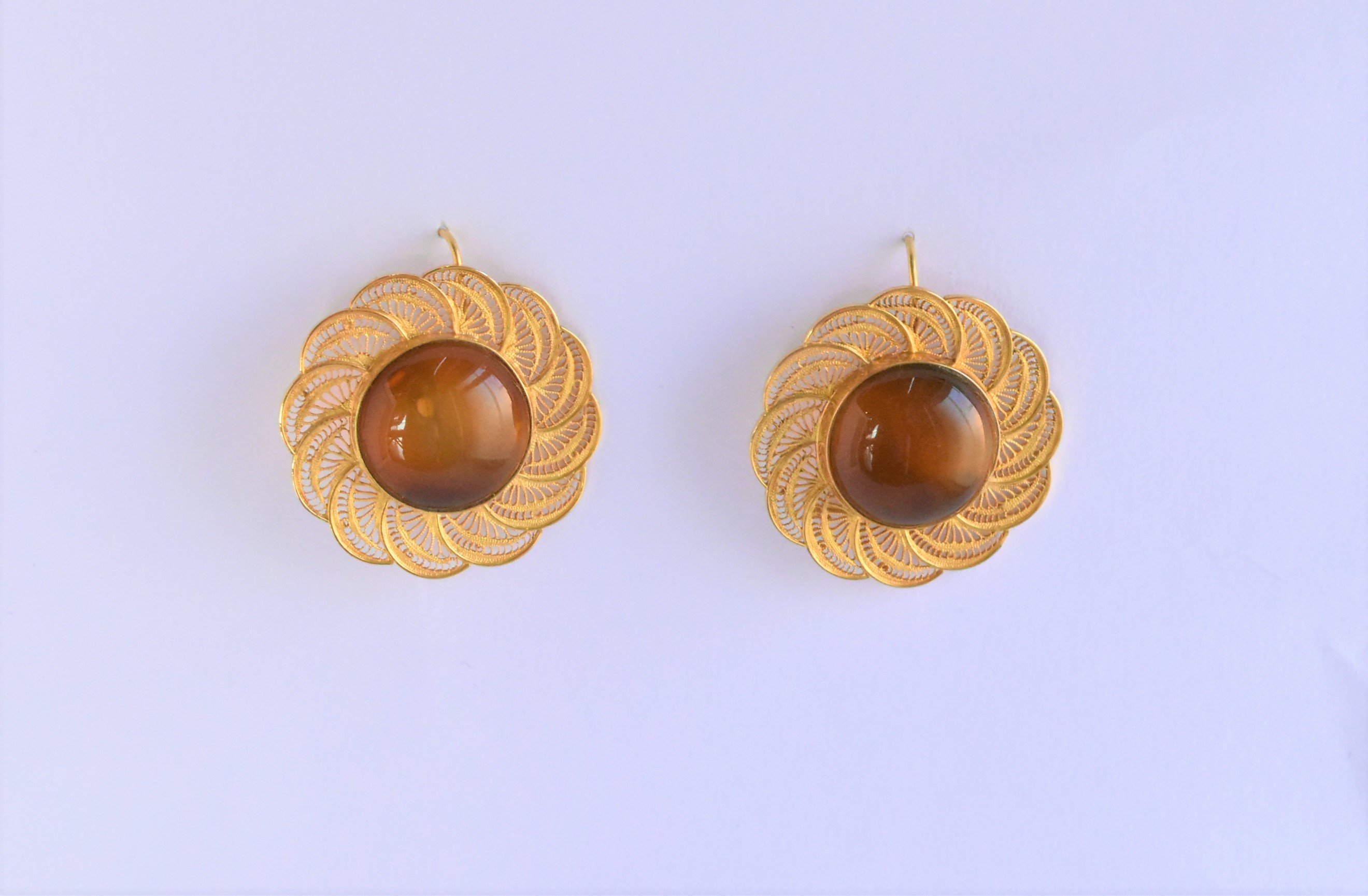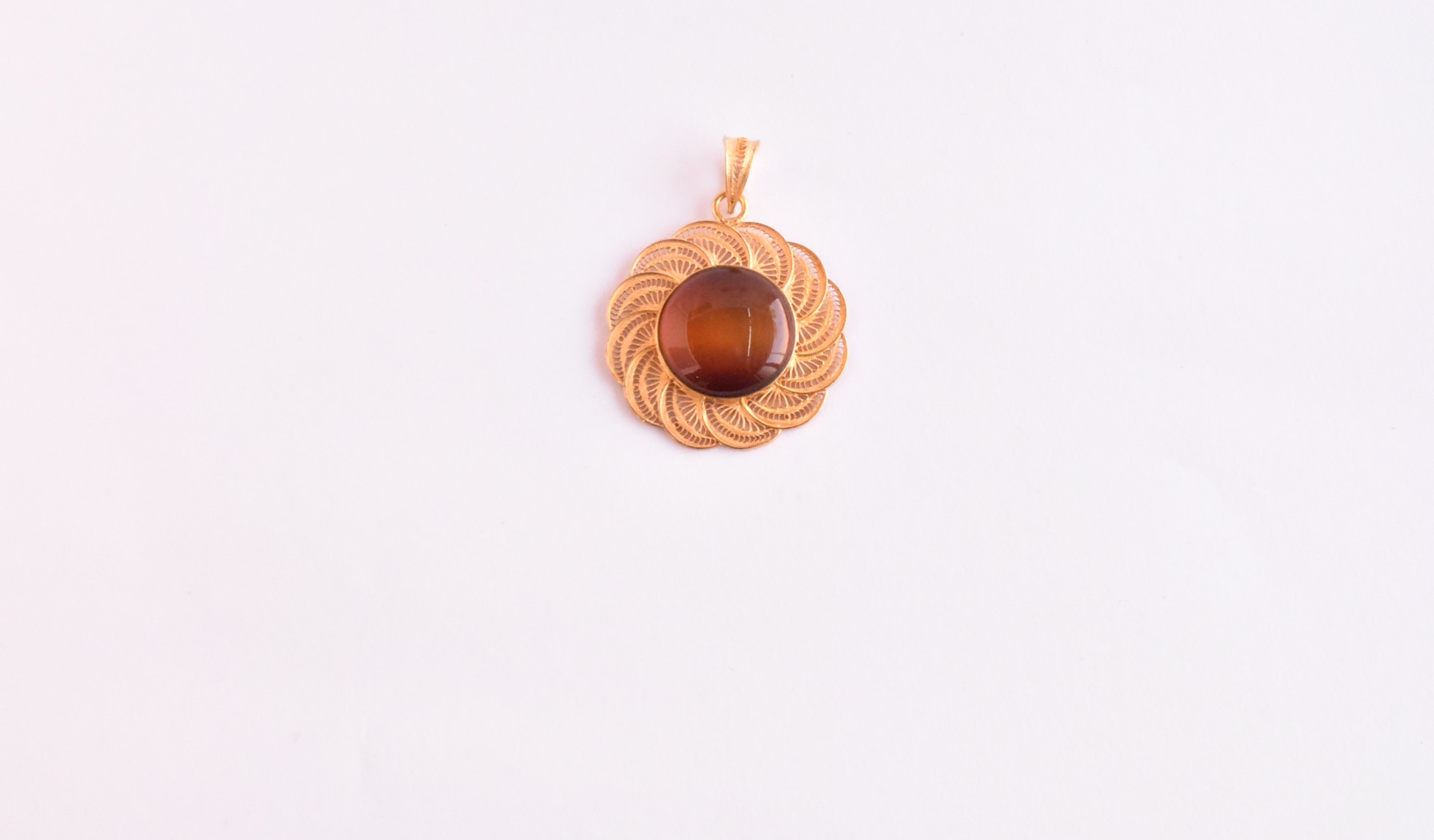 Juego de dije y aretes de ámbar rojo coñac montado sobre oro de 14 K filigrana. código: 302