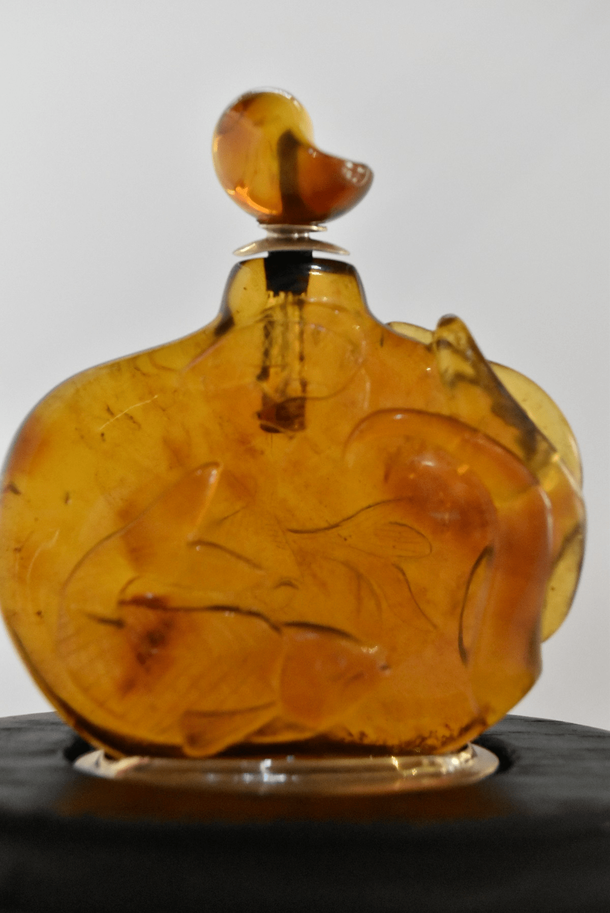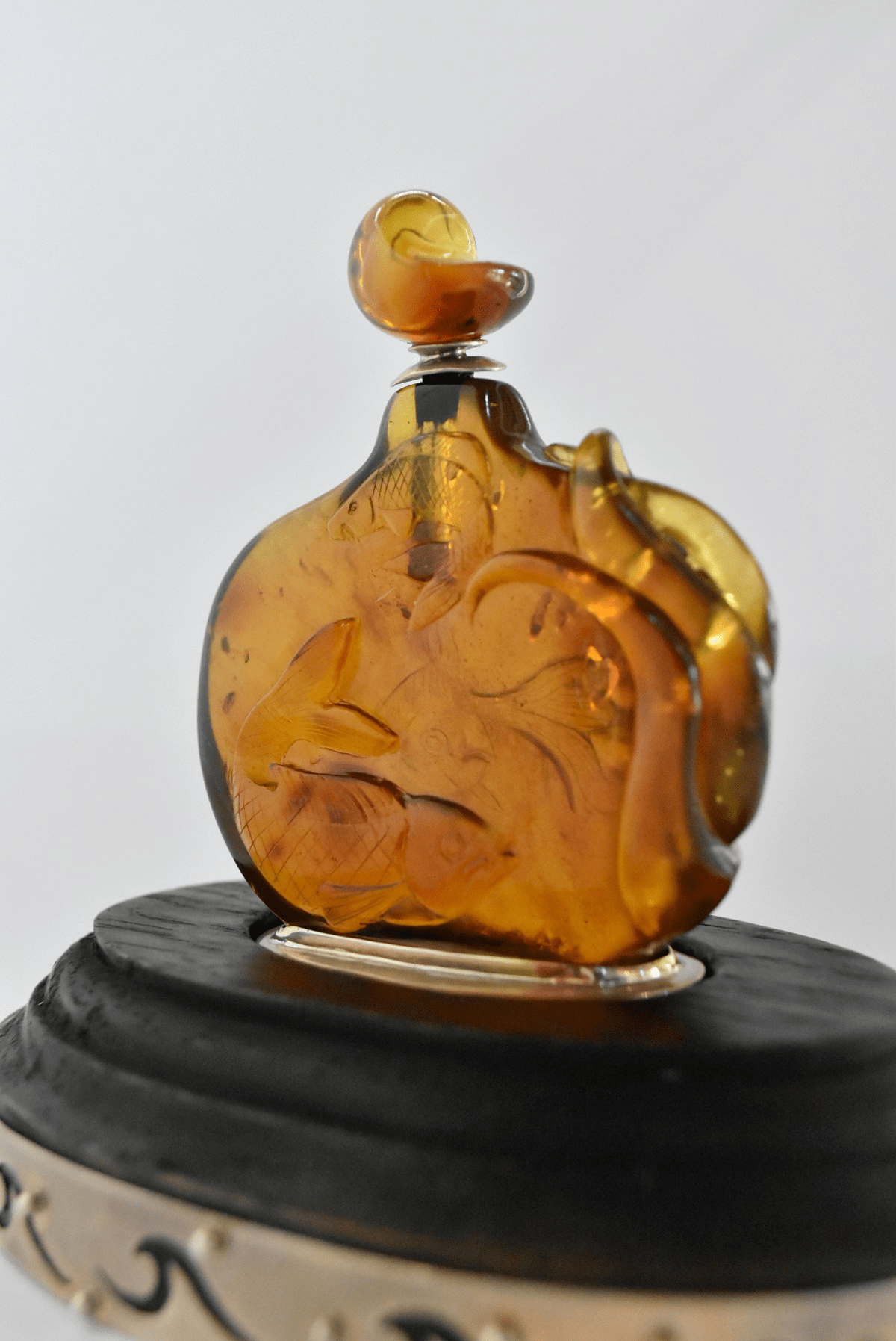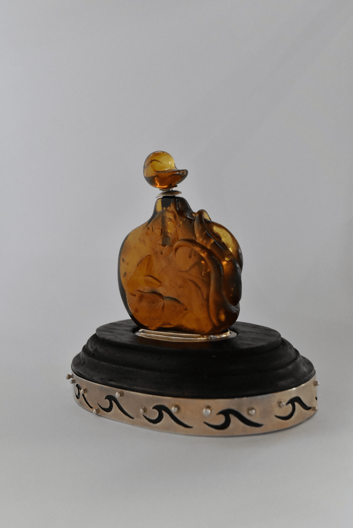 Escultura en forma de perfumero, ideal para la esencia de las damas con base de madera oval y plata .925. Tallada por maestros escultores chiapanecos. Código 2840.