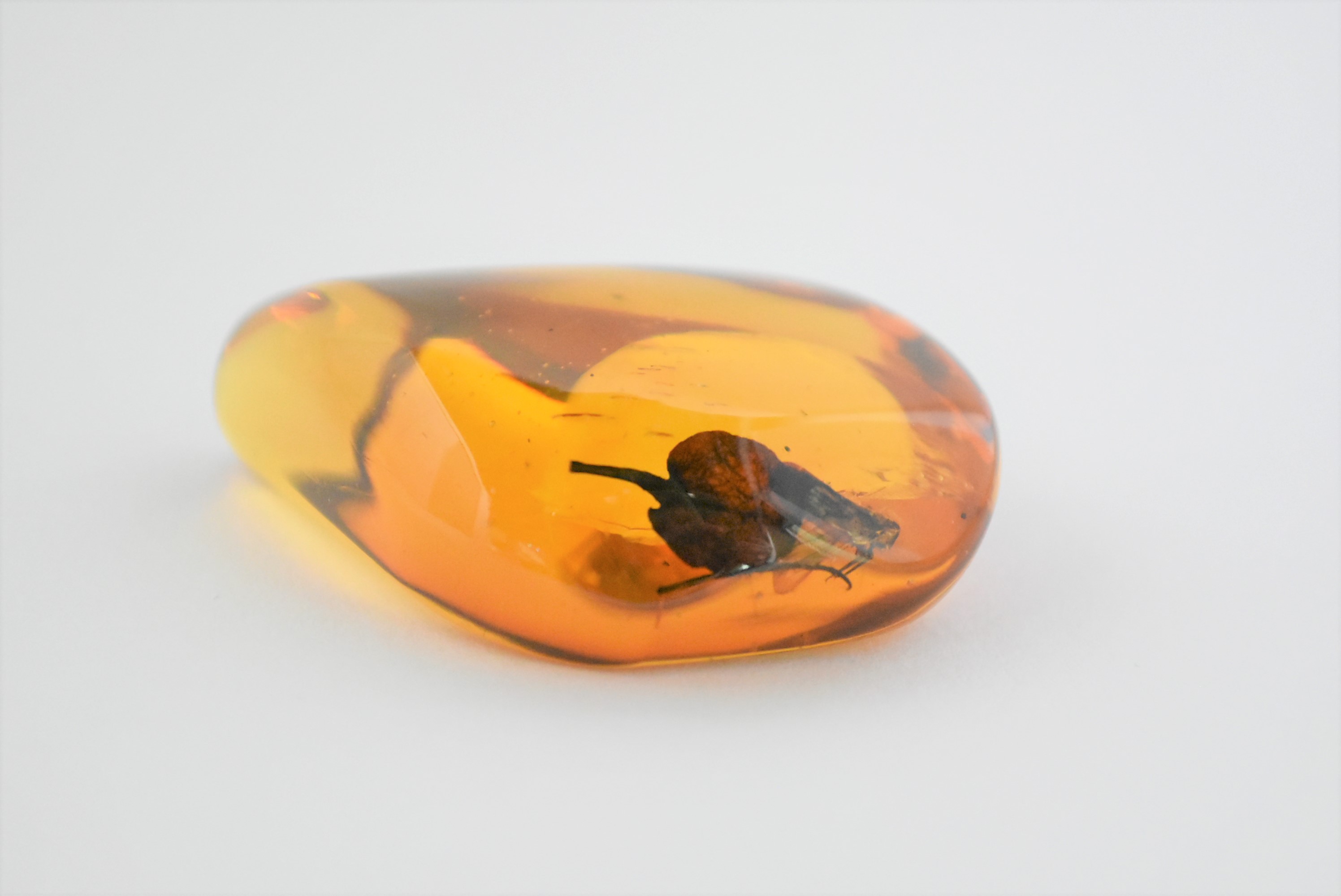 Pieza pulida de ámbar amarillo con inclusiones fósiles de una hoja y grillo