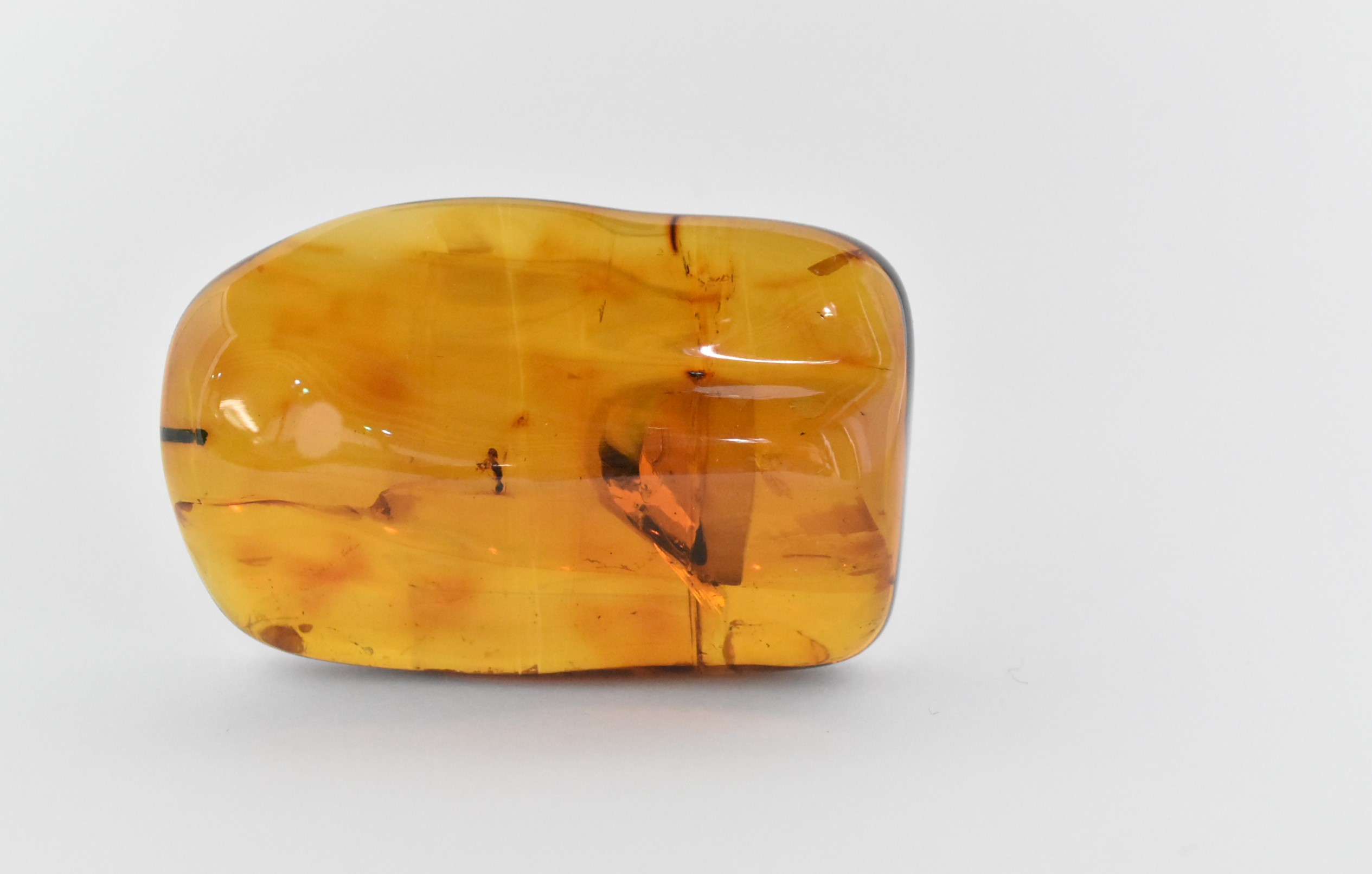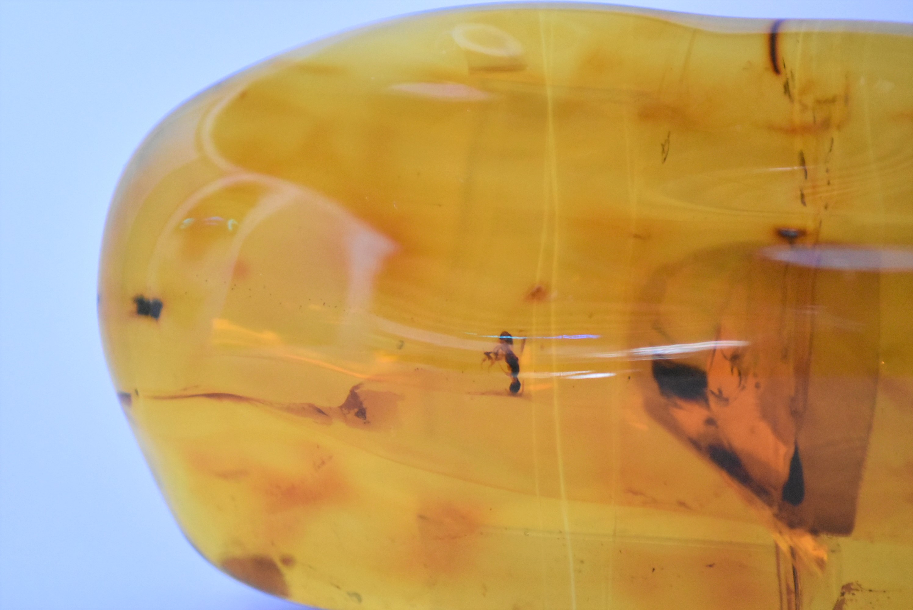 Pieza pulida de ámbar amarillo con inclusiones fósiles de hormigas