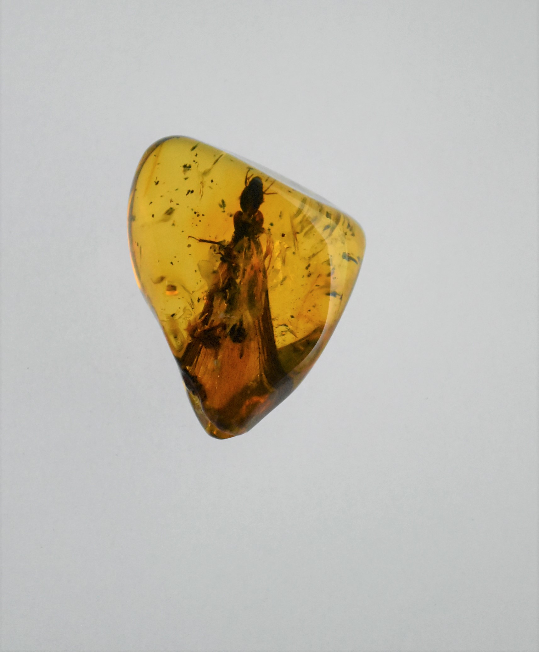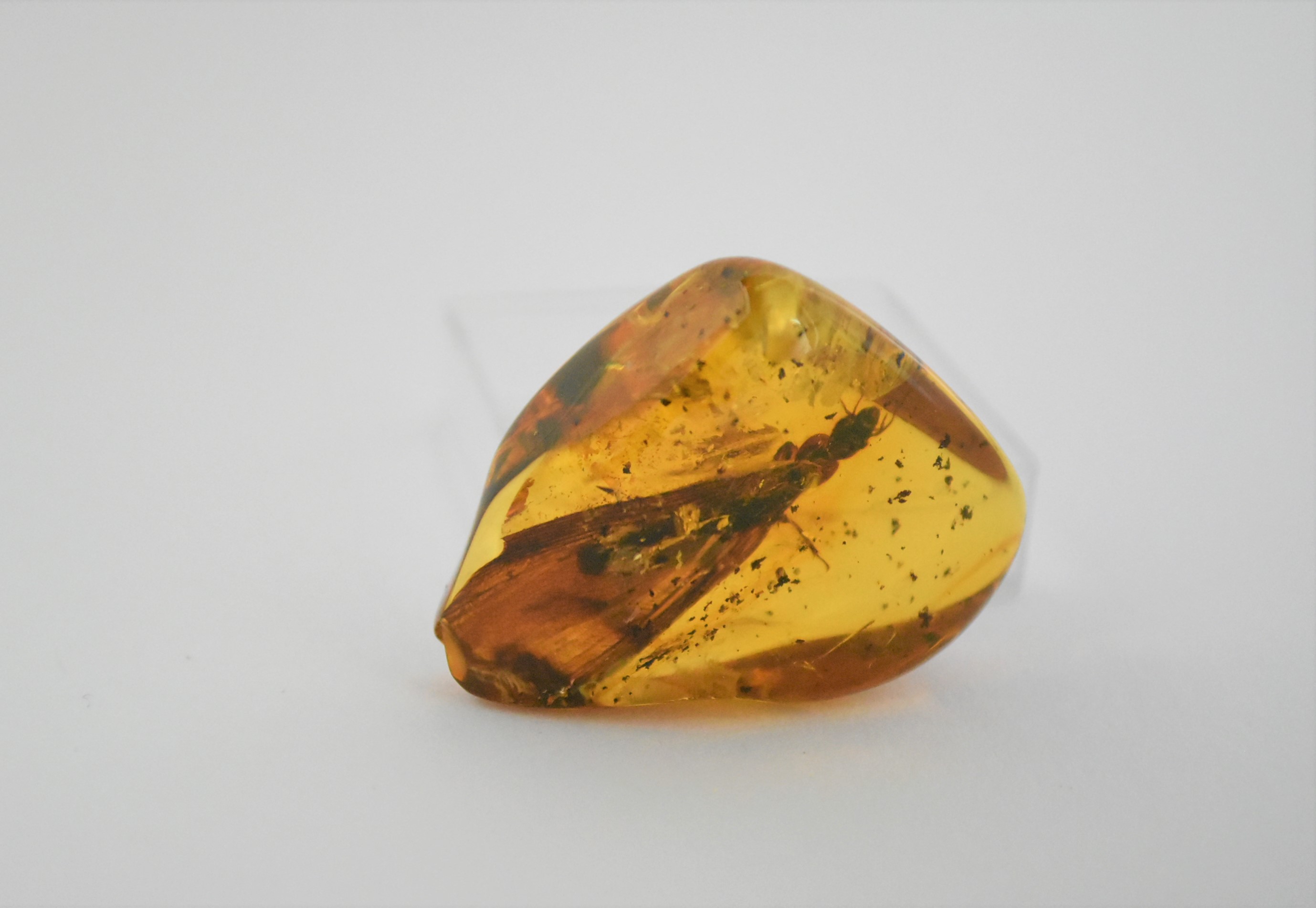 Pieza pulida de ámbar amarillo con inclusión fósil de una Masto terma