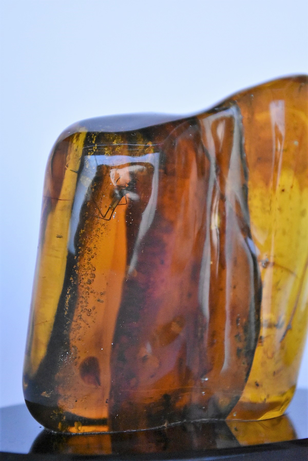 Pieza pulida con insecto, montada sobre una base circular de obsidiana. Código: 4598.
