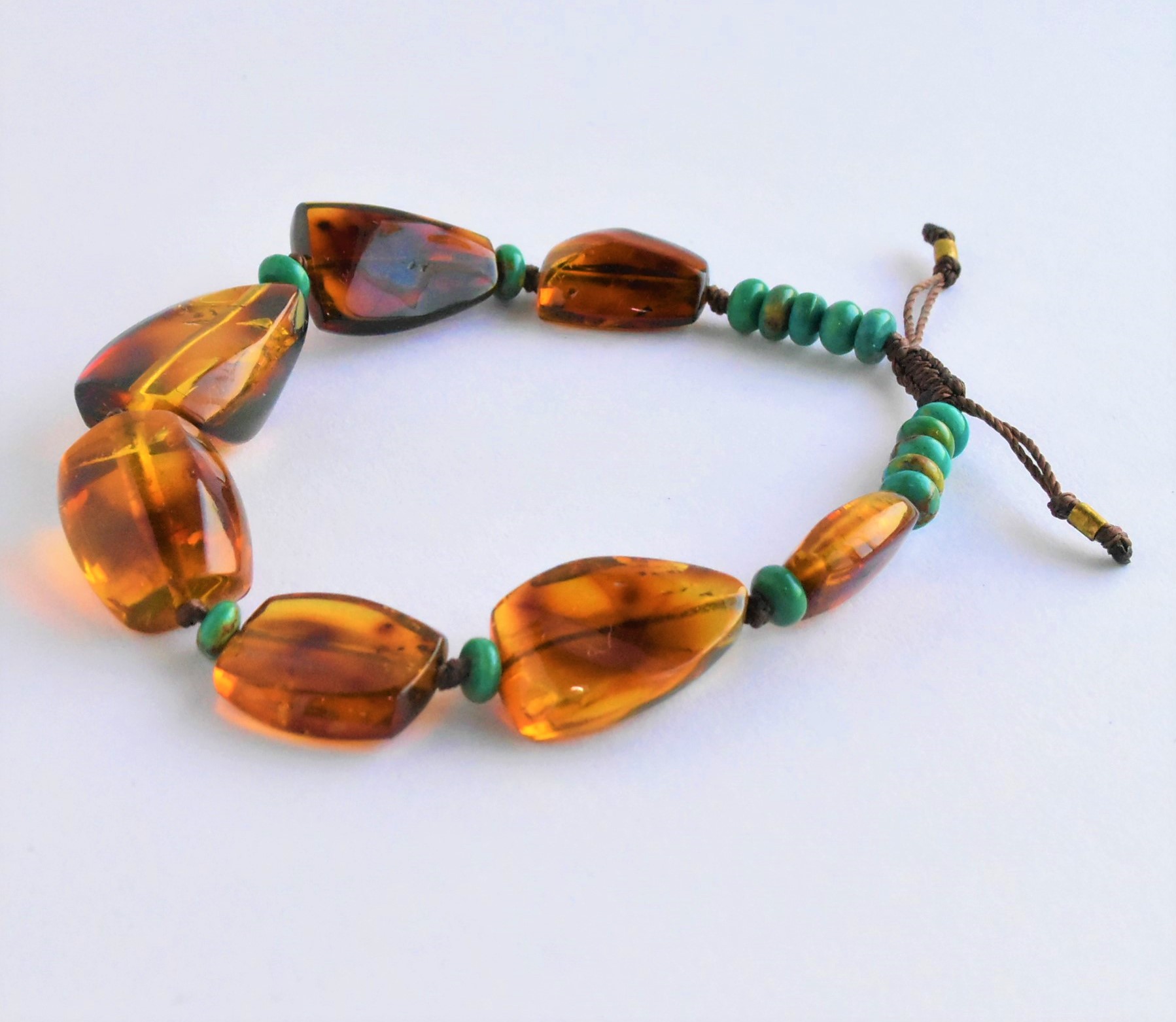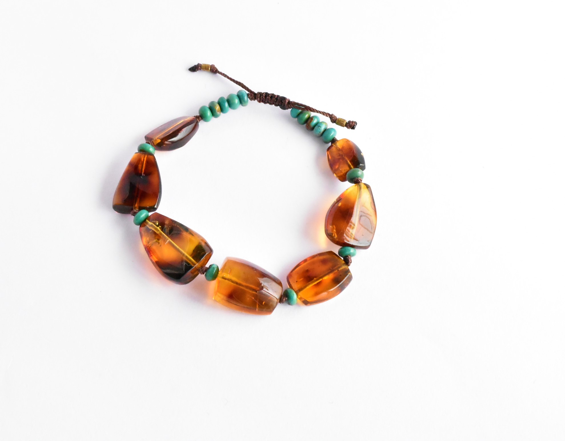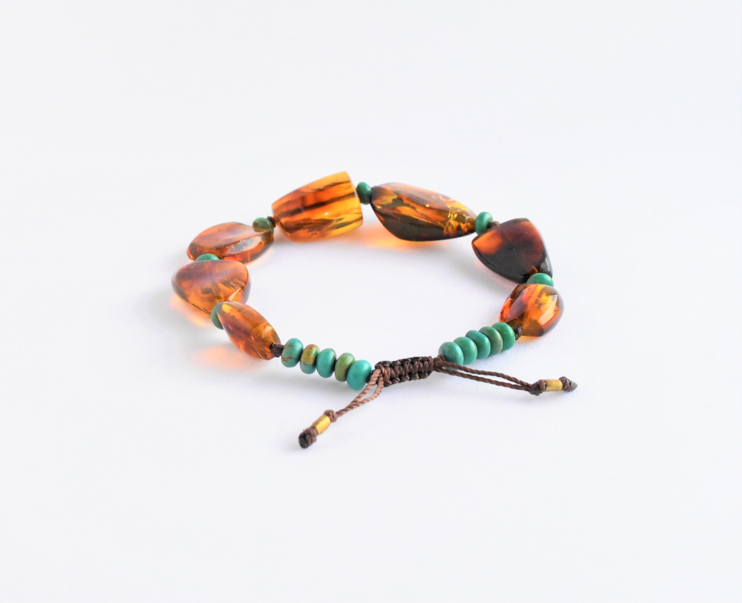 BAJO PEDIDO Pulsera de ámbar anaranjado con donas de turquesa con hilo y bordes de cobre para ajustar su tamaño. Código: 4619.