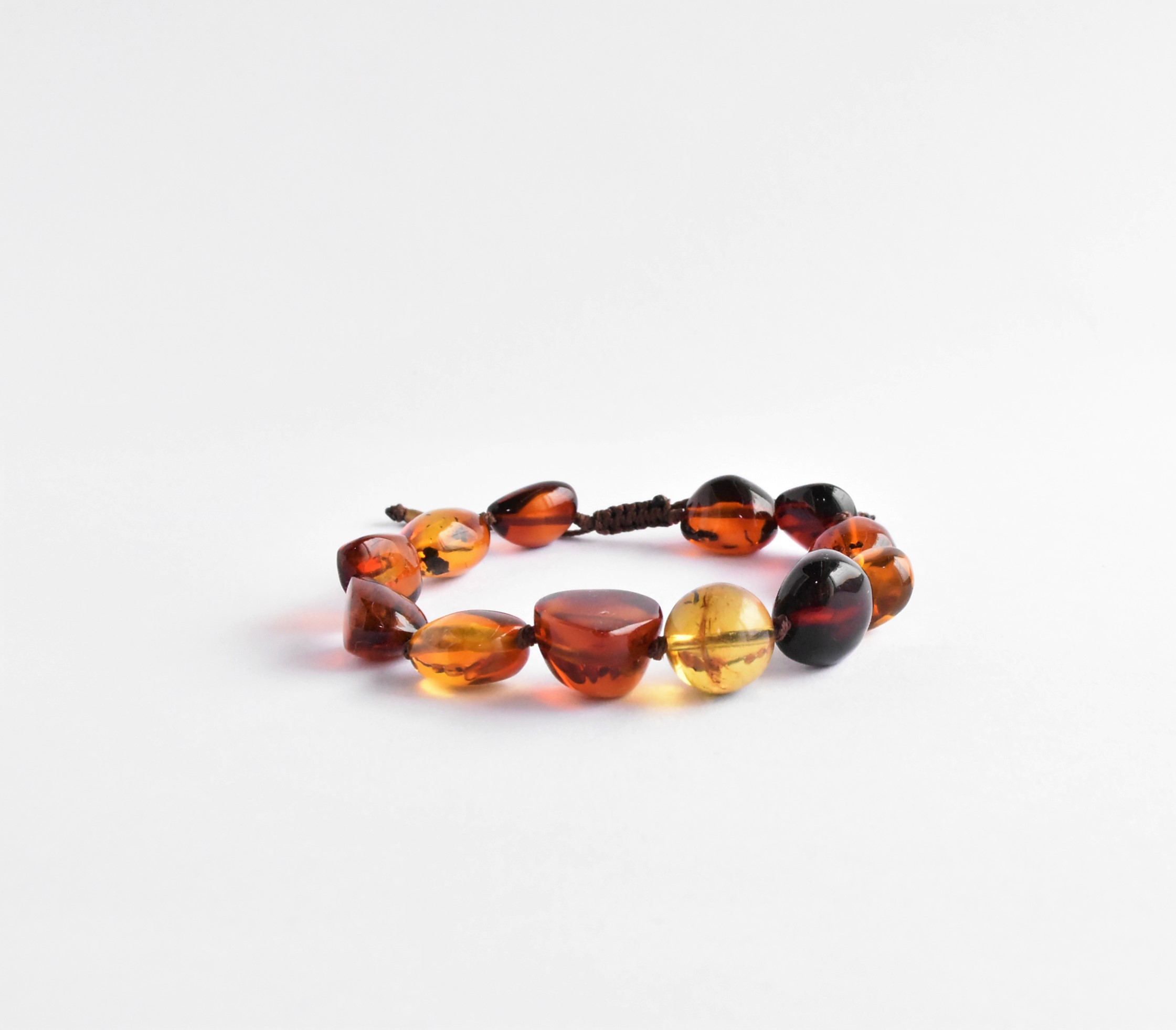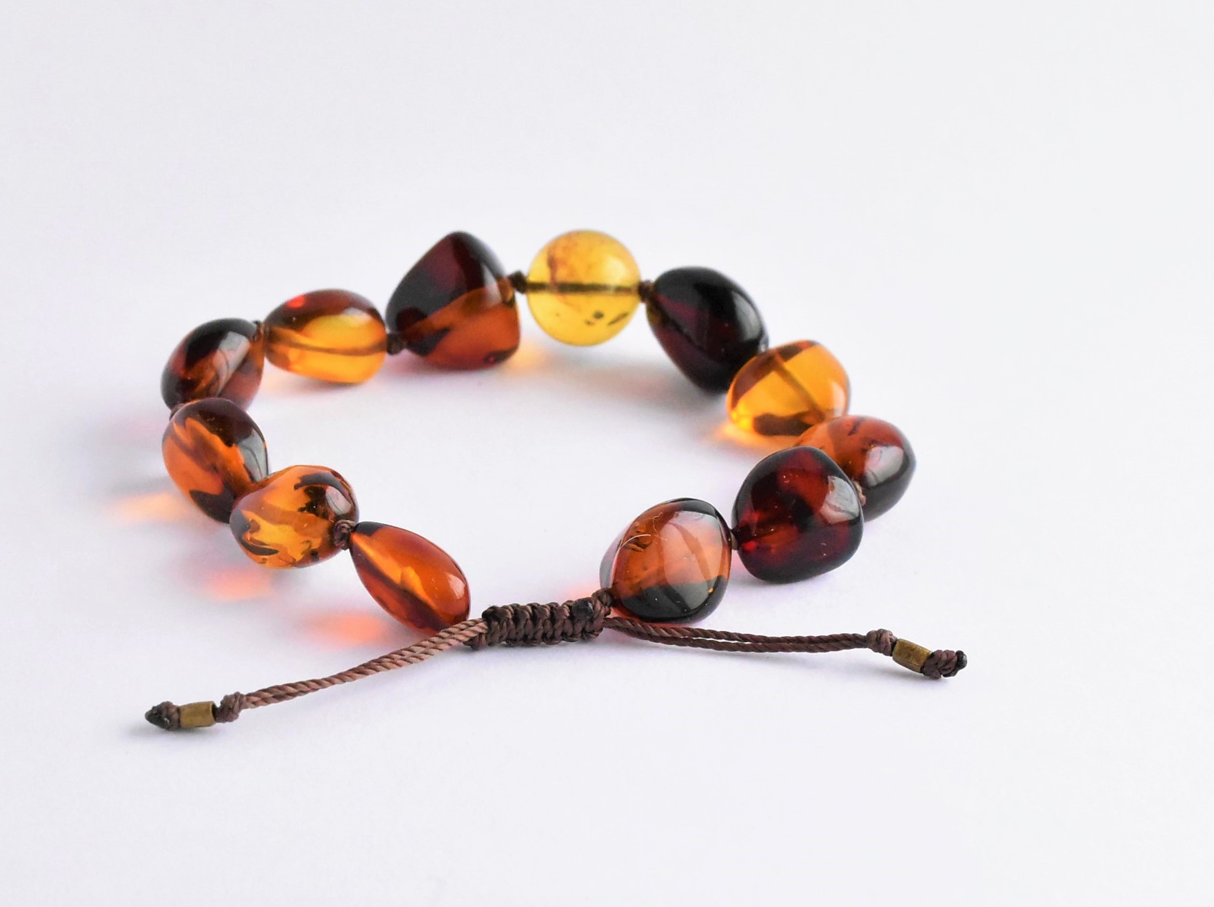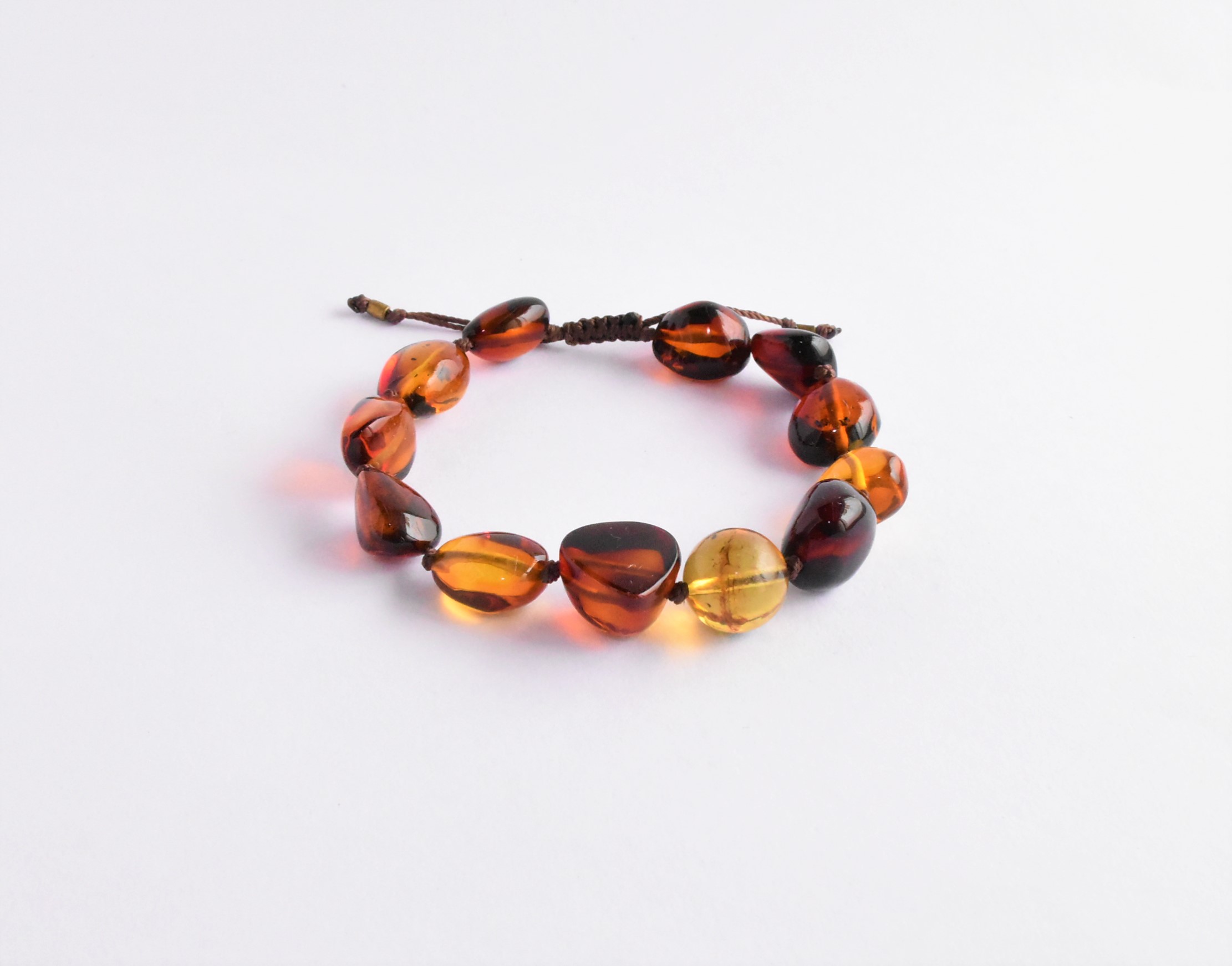 BAJO PEDIDO Pulsera de ámbar en diferentes tonalidades que abarcan desde el amarillo hasta el rojo, incluye una esfera en el centro de ámbar amarillo, con hilo y borde de cobre para ajustar su tamaño. Código: 4027.
