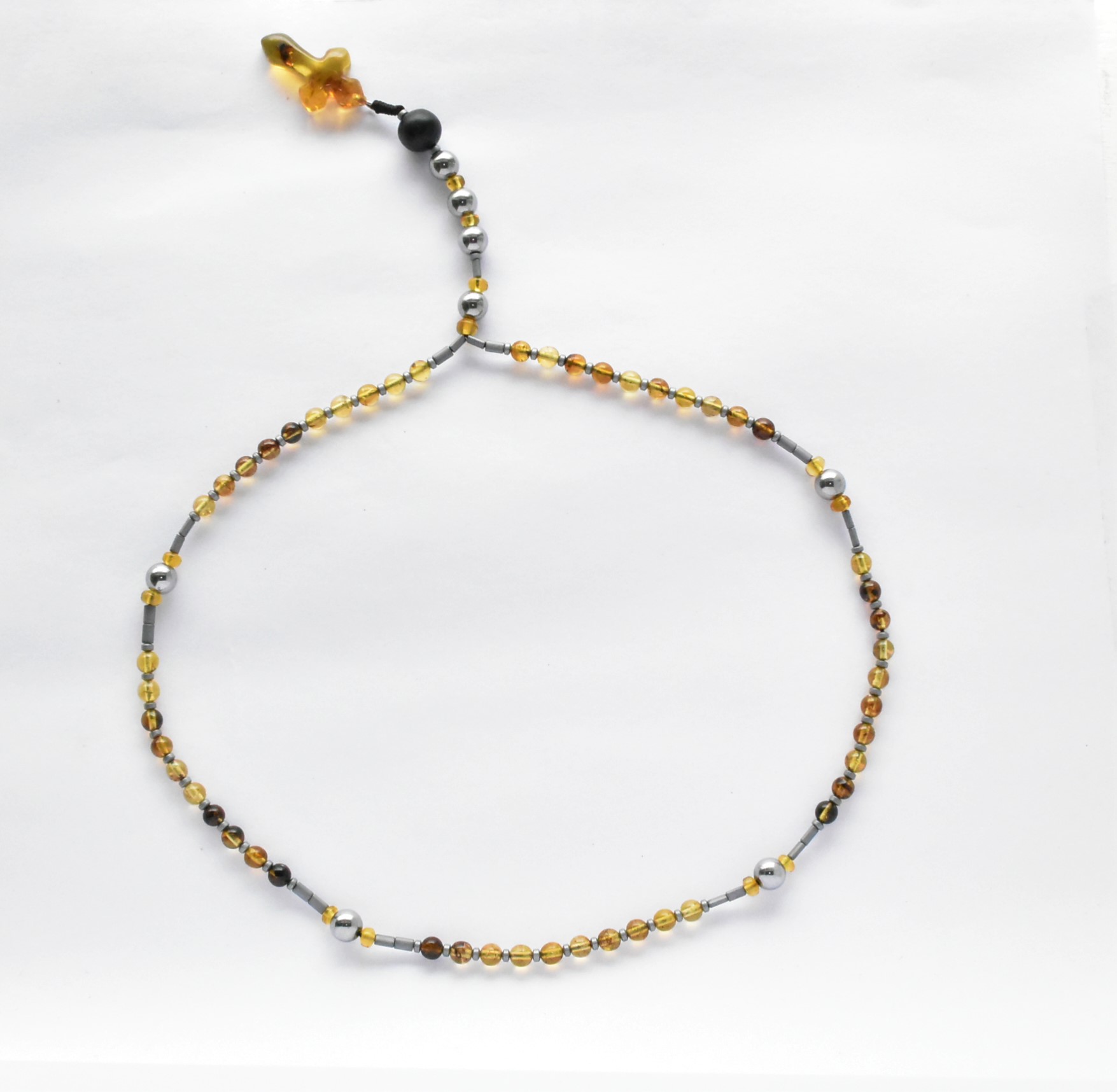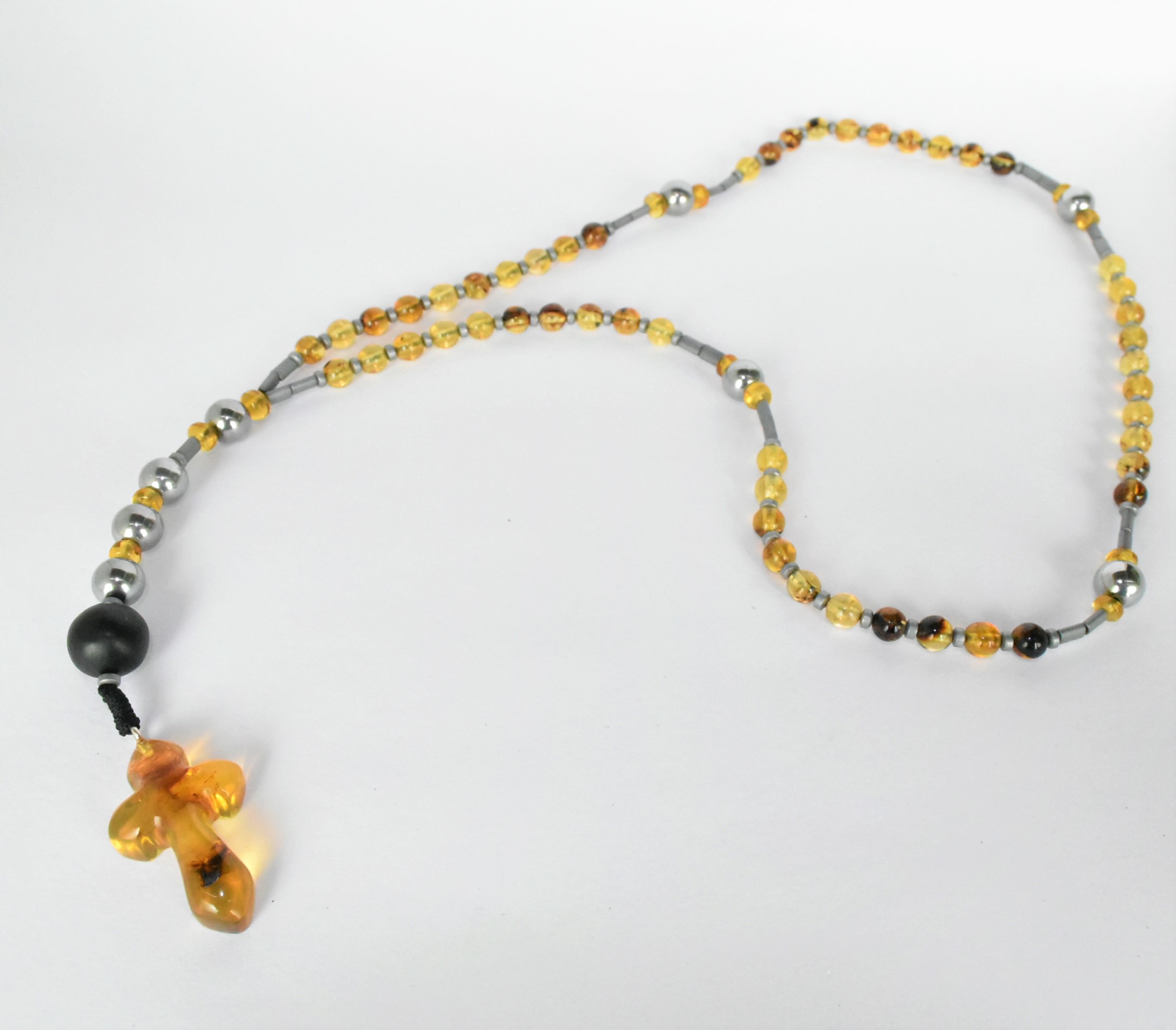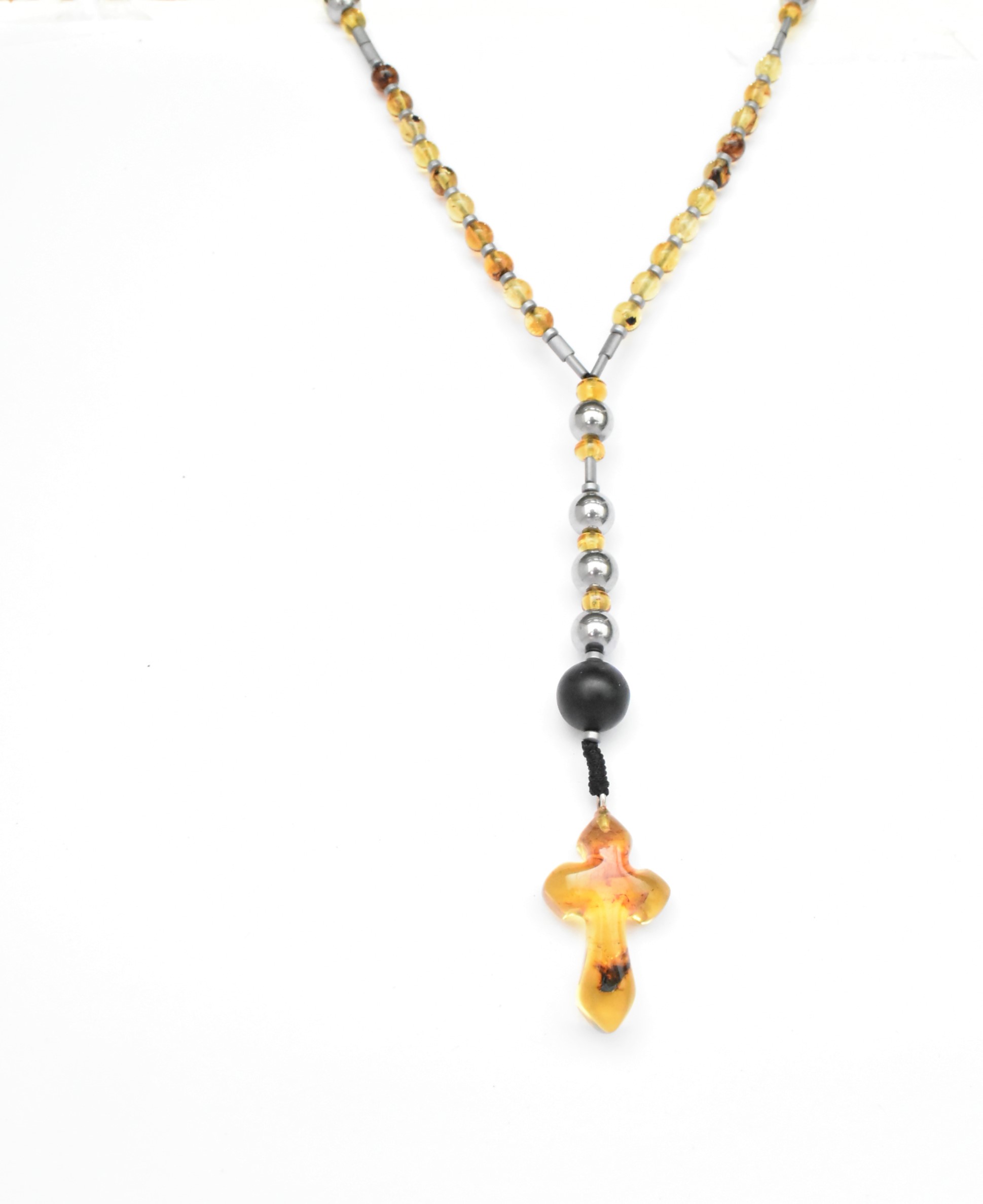 Rosario de ambar amarillo, Ónix y hematite , incluye cruz de ambar naranja. Codigo: 2130